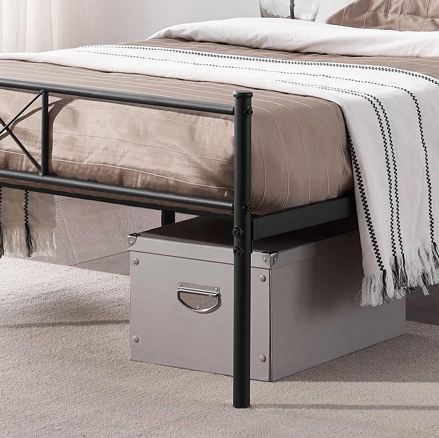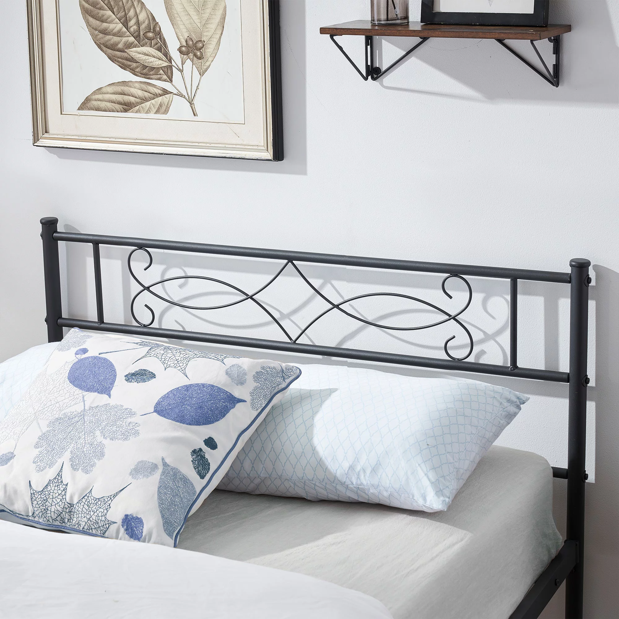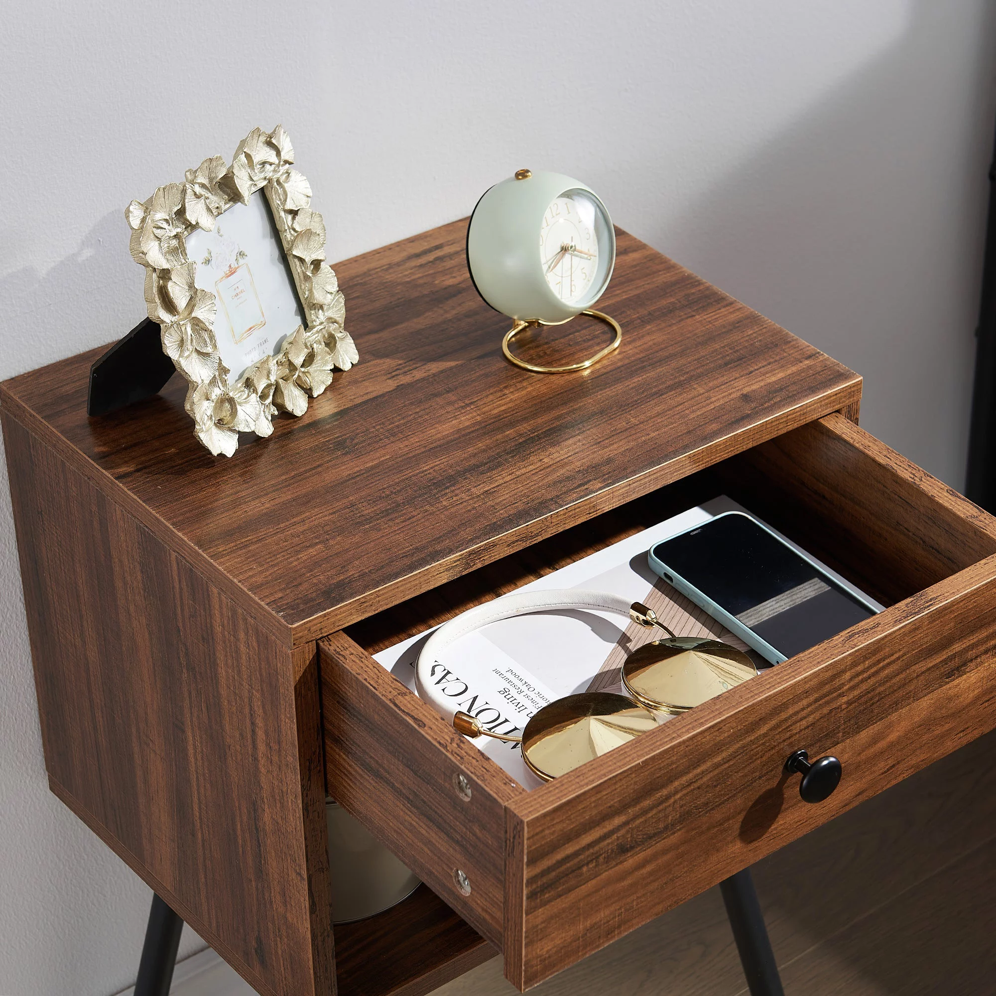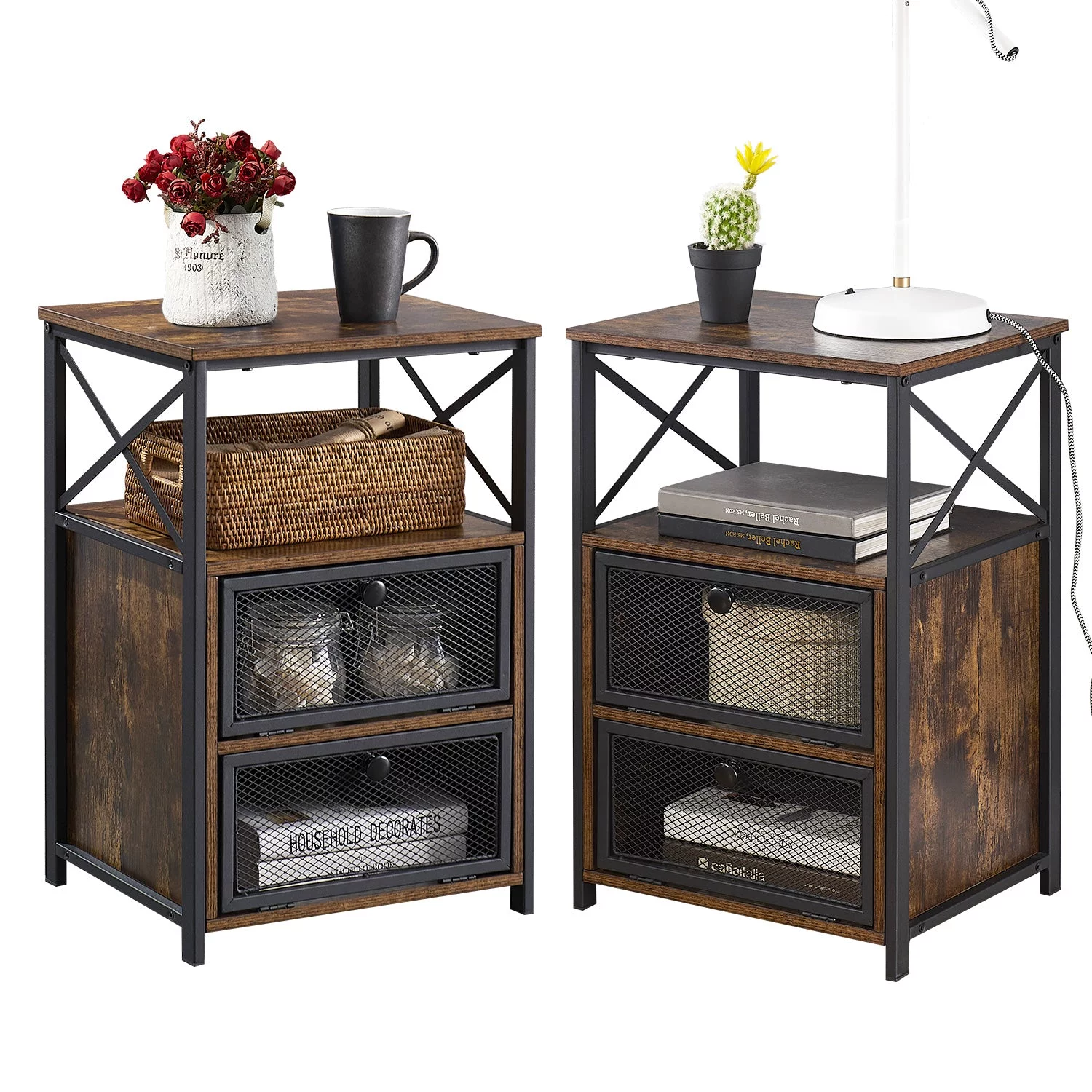 VECELO 3-Piece Bedroom Set, Twin Size Metal Bed Frame and 2 Brown Nightstand