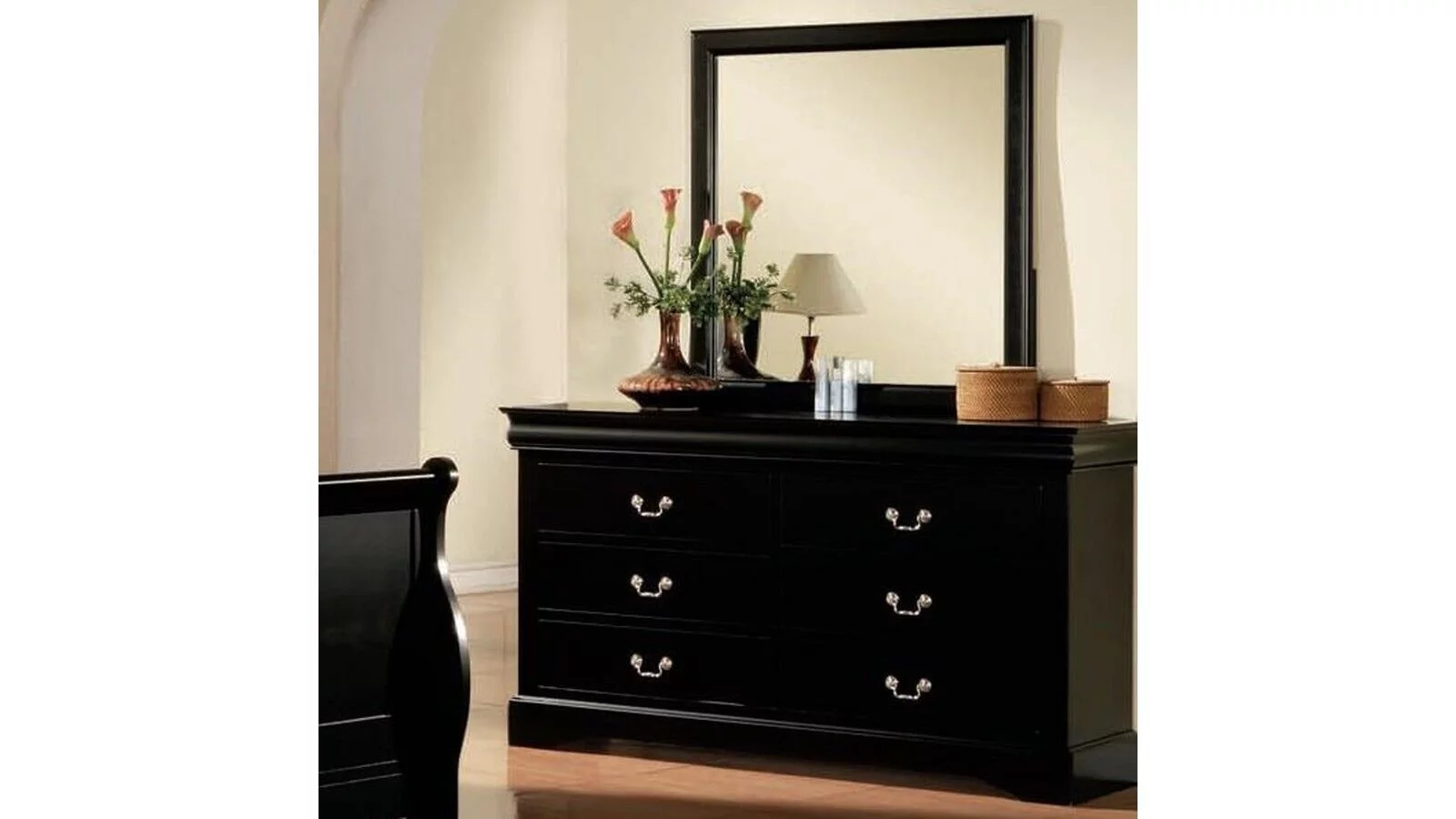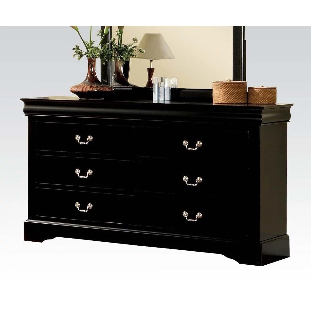 Traditional Black Finish Panel Bed Dresser Mirror Nightstand Chest 5pc Twin Bedroom Furniture Set Louis Phillippe Style