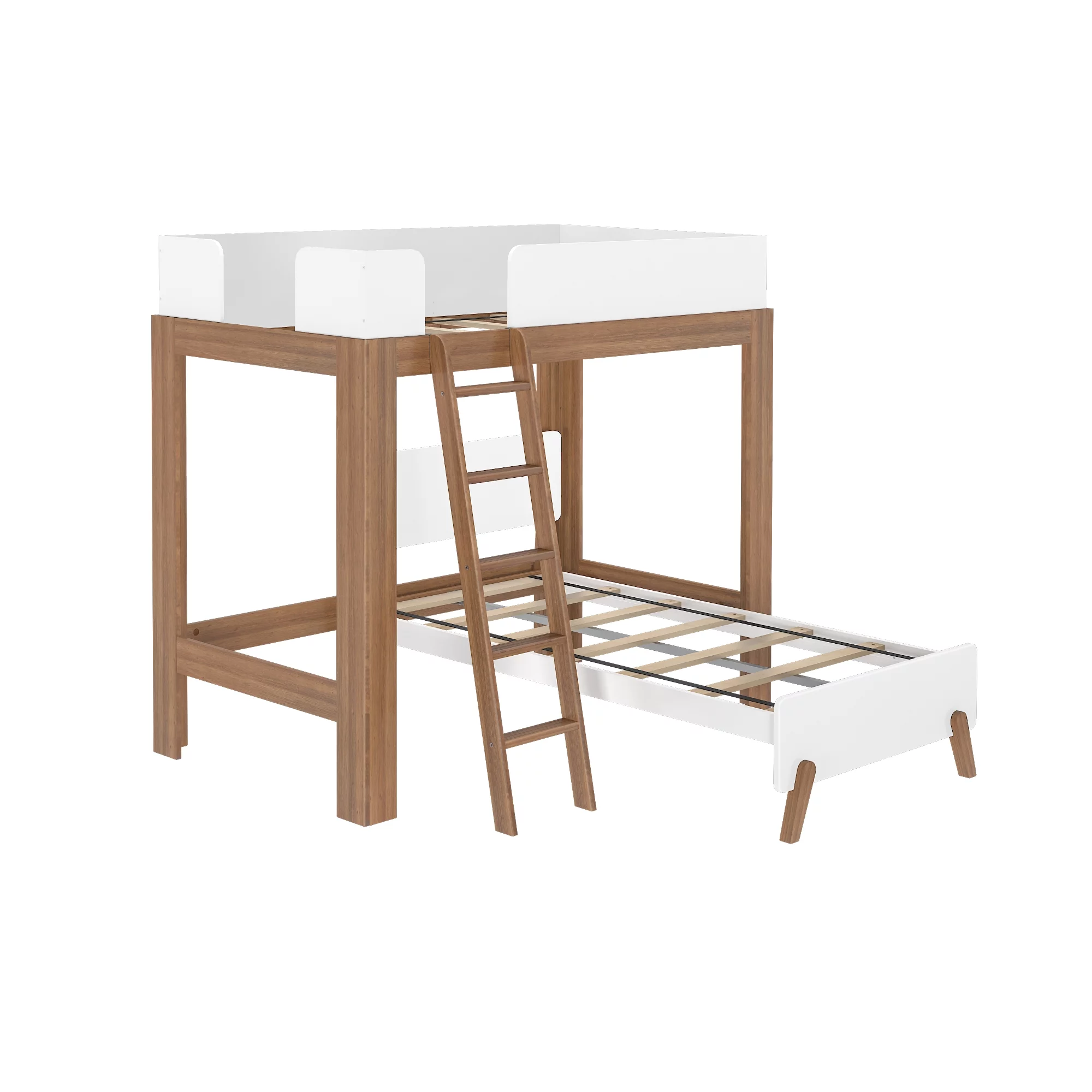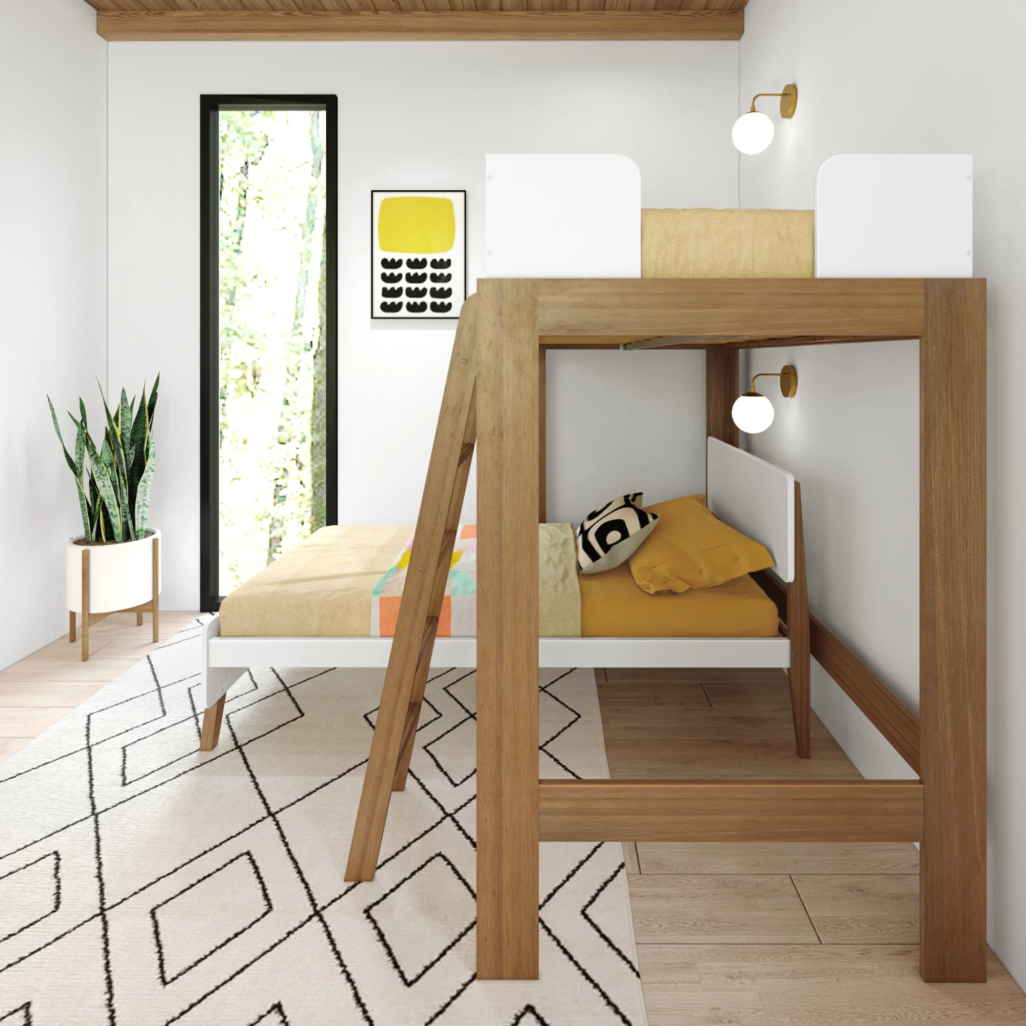 Max & Lily Twin over Twin L-Shaped Bunk Bed, Mid-Century Modern Bunk Solid Wood Bunk for Kids, White/Pecan