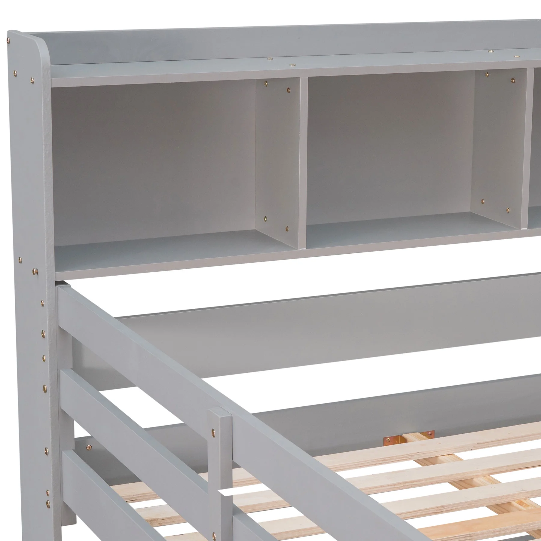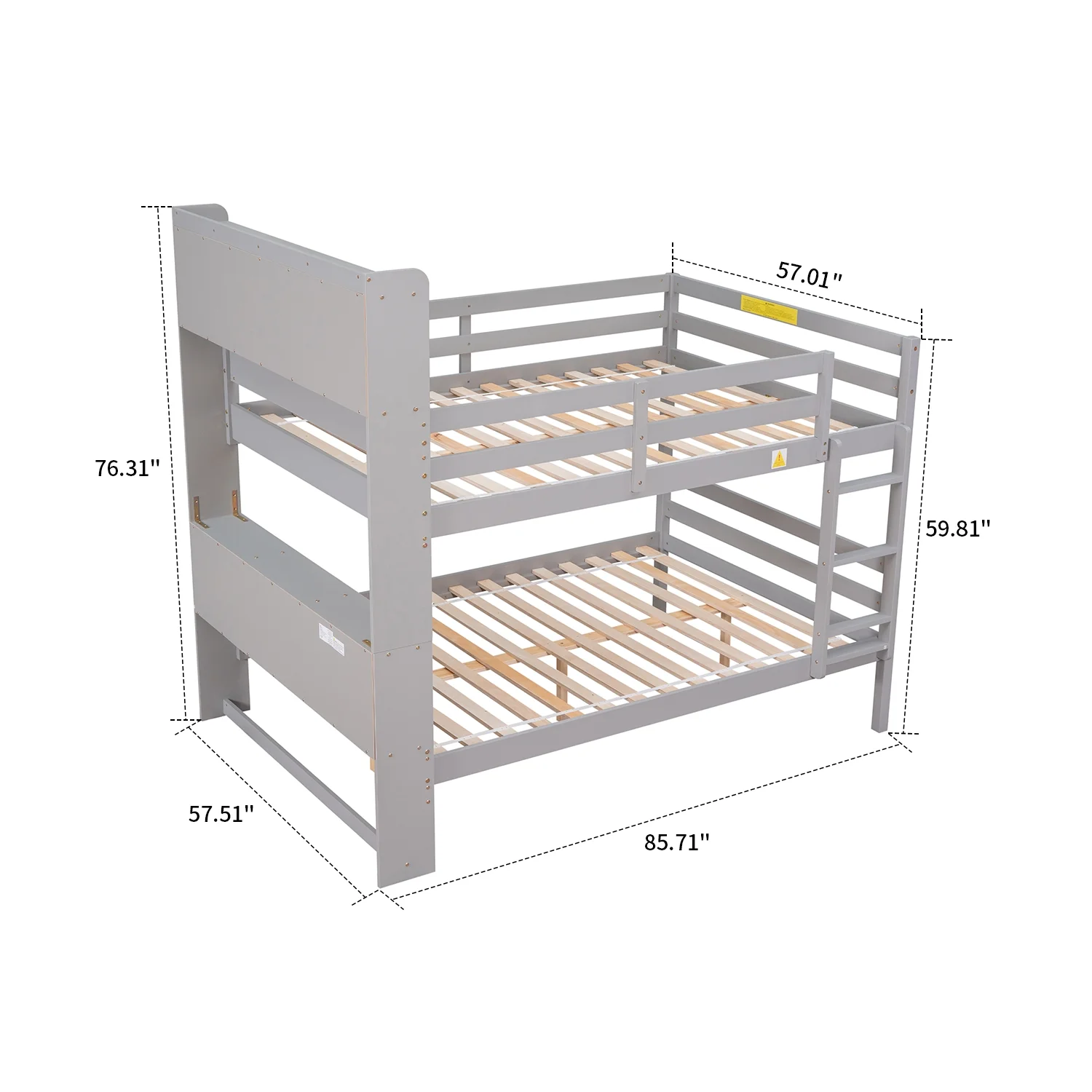 Modern and Minimalist Style Full Size Wooden Bunk Bed with Ladder and Shelves, Grey