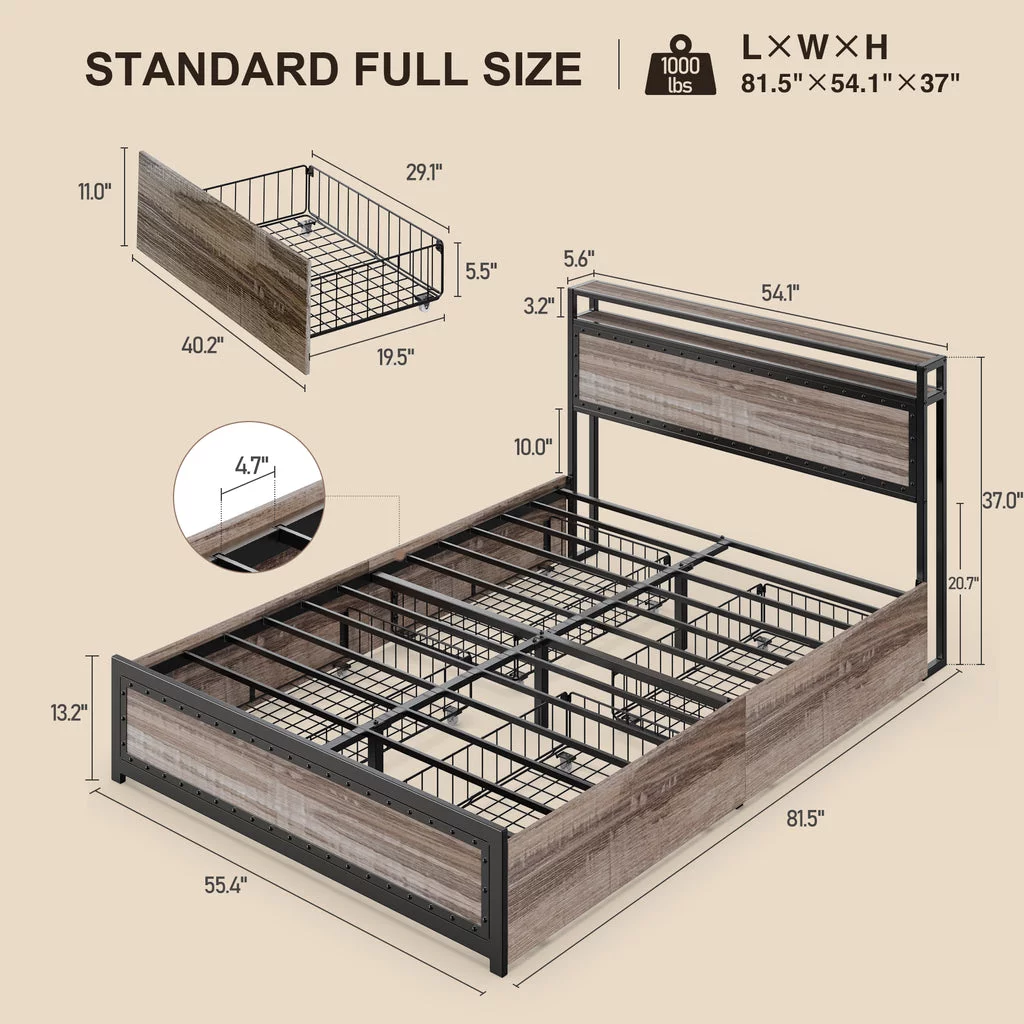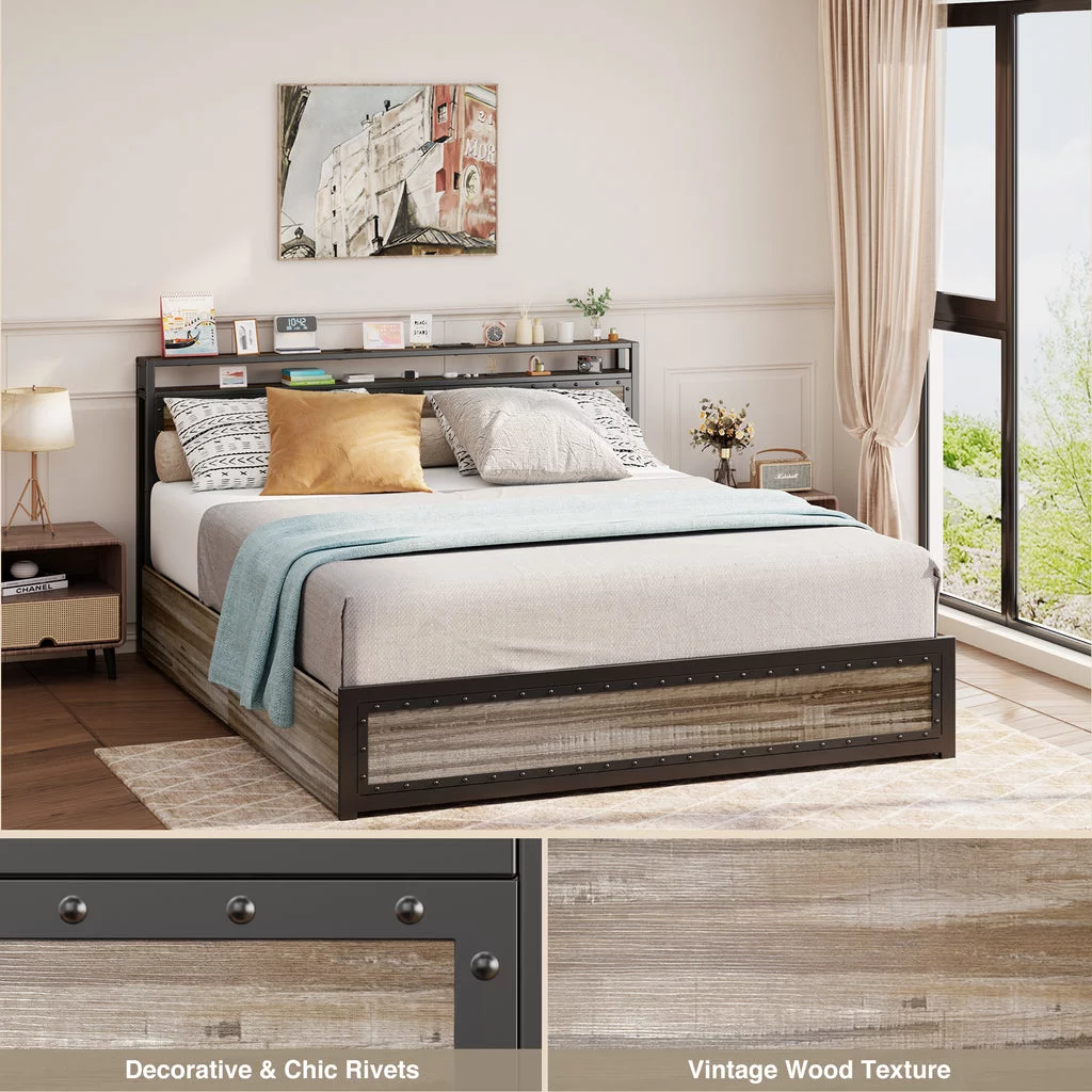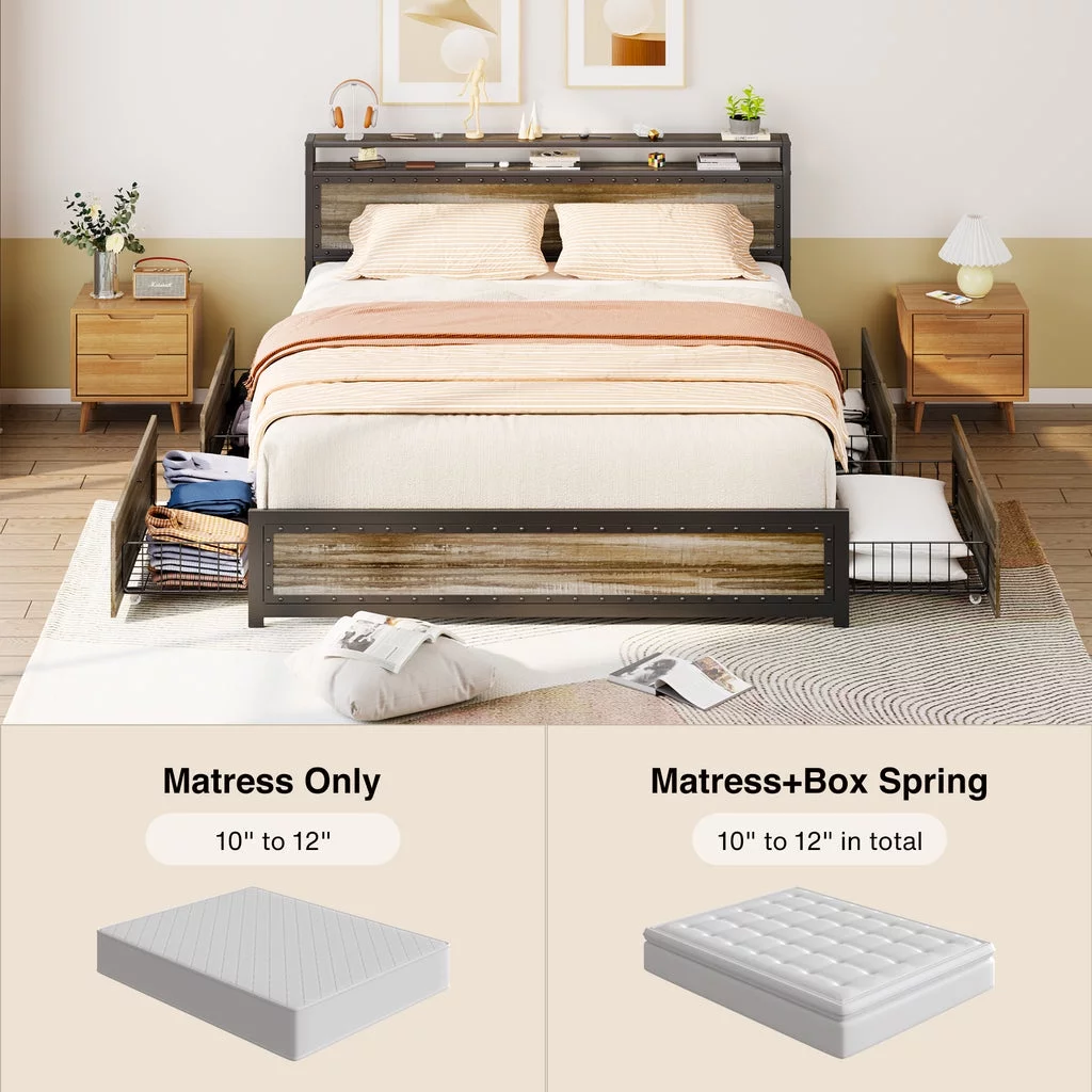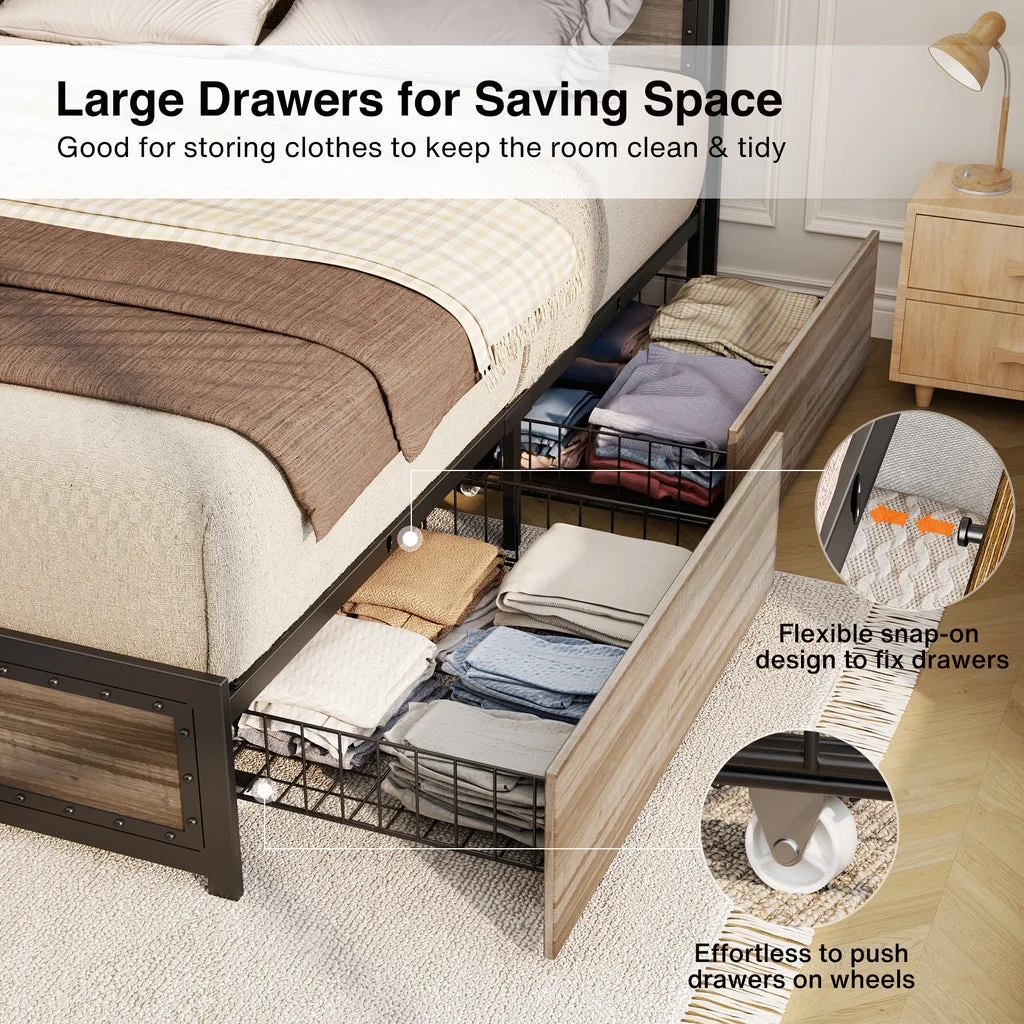 Aiho Full Size Metal Bed Frame with Drawers and Headboard for Bedroom Clearance - Gray
