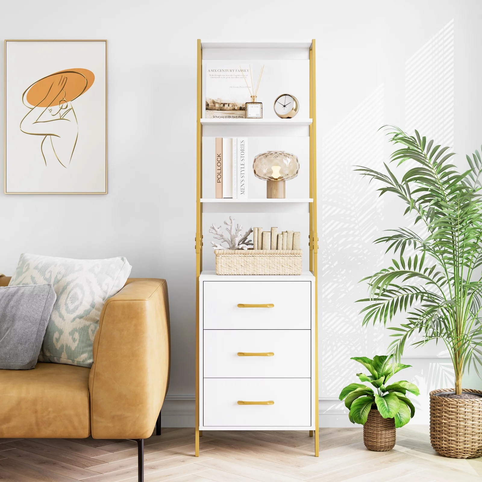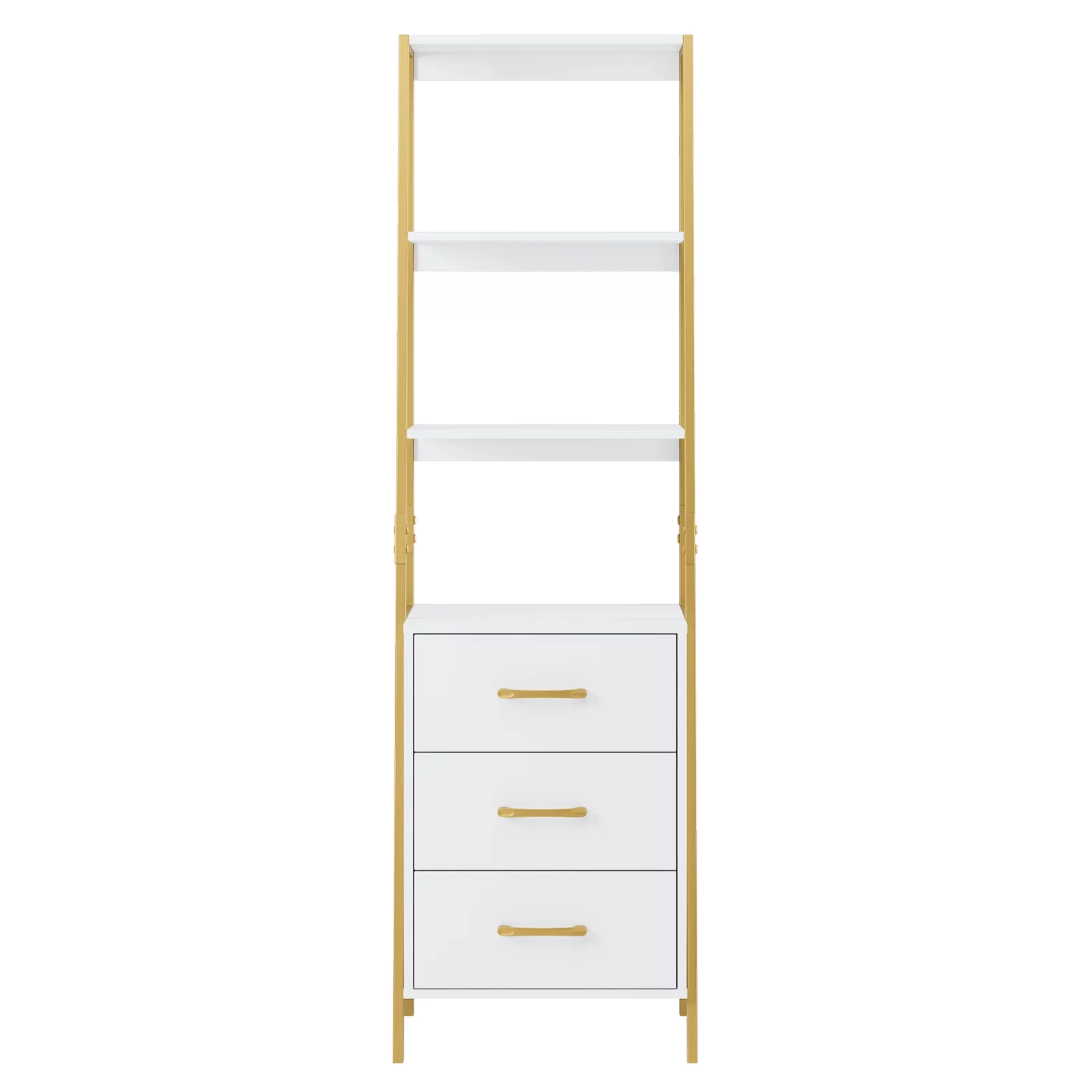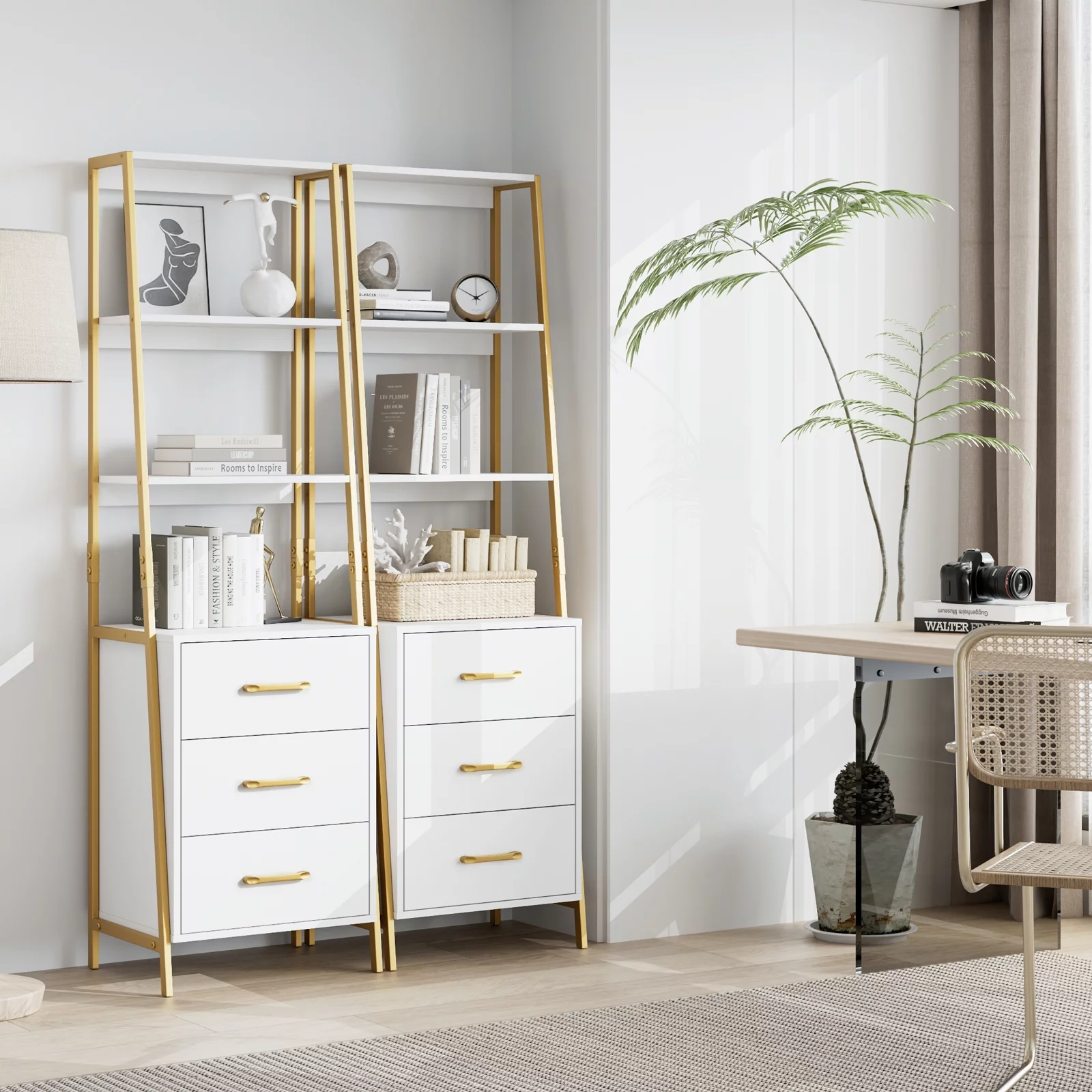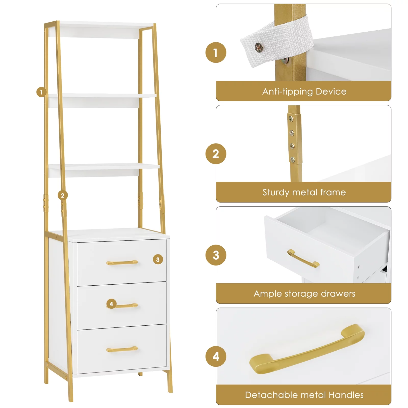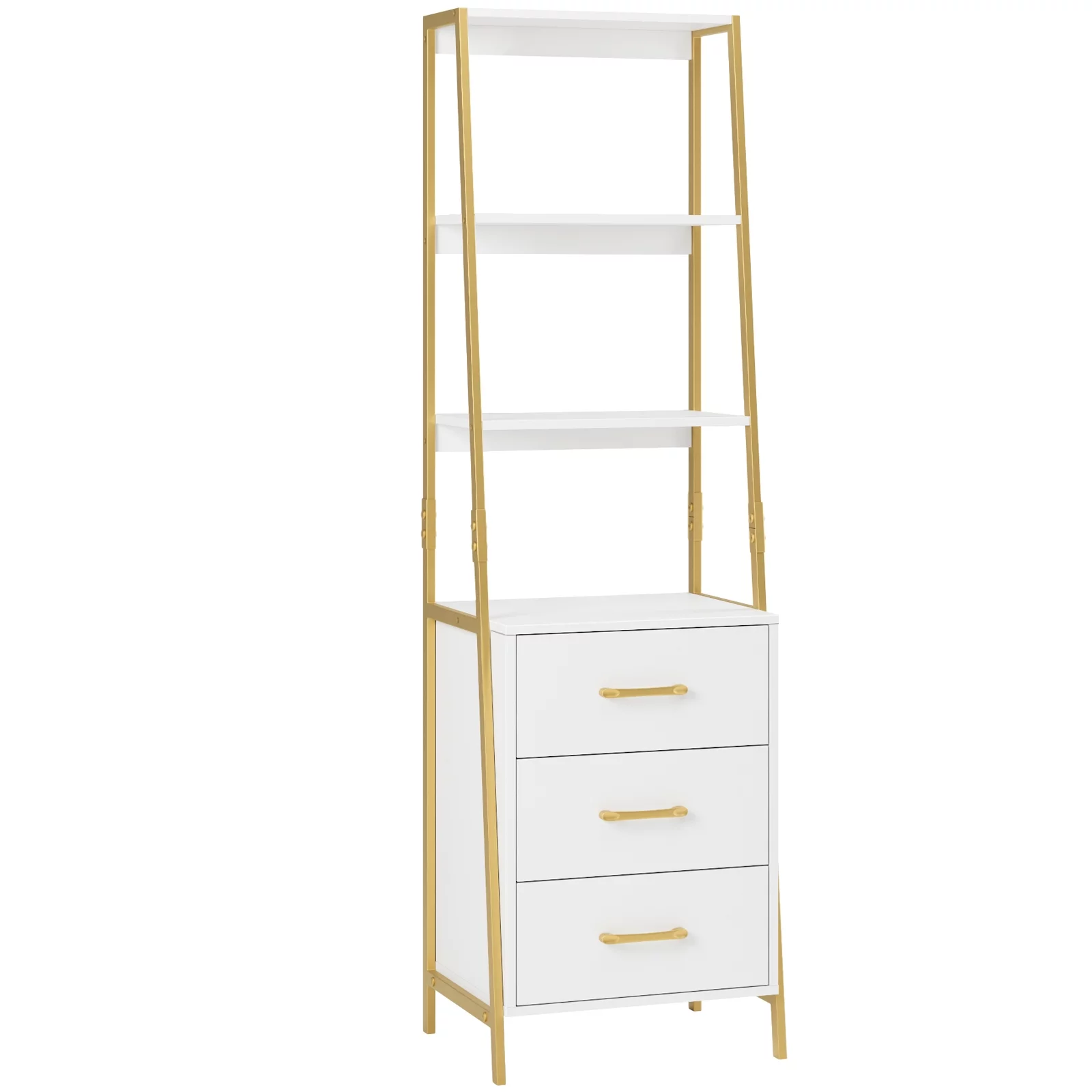 Homfa Trapezoidal Bookshelf, 3-Tier Open Storage Shelves with 3 Drawers, White and Gold Finish