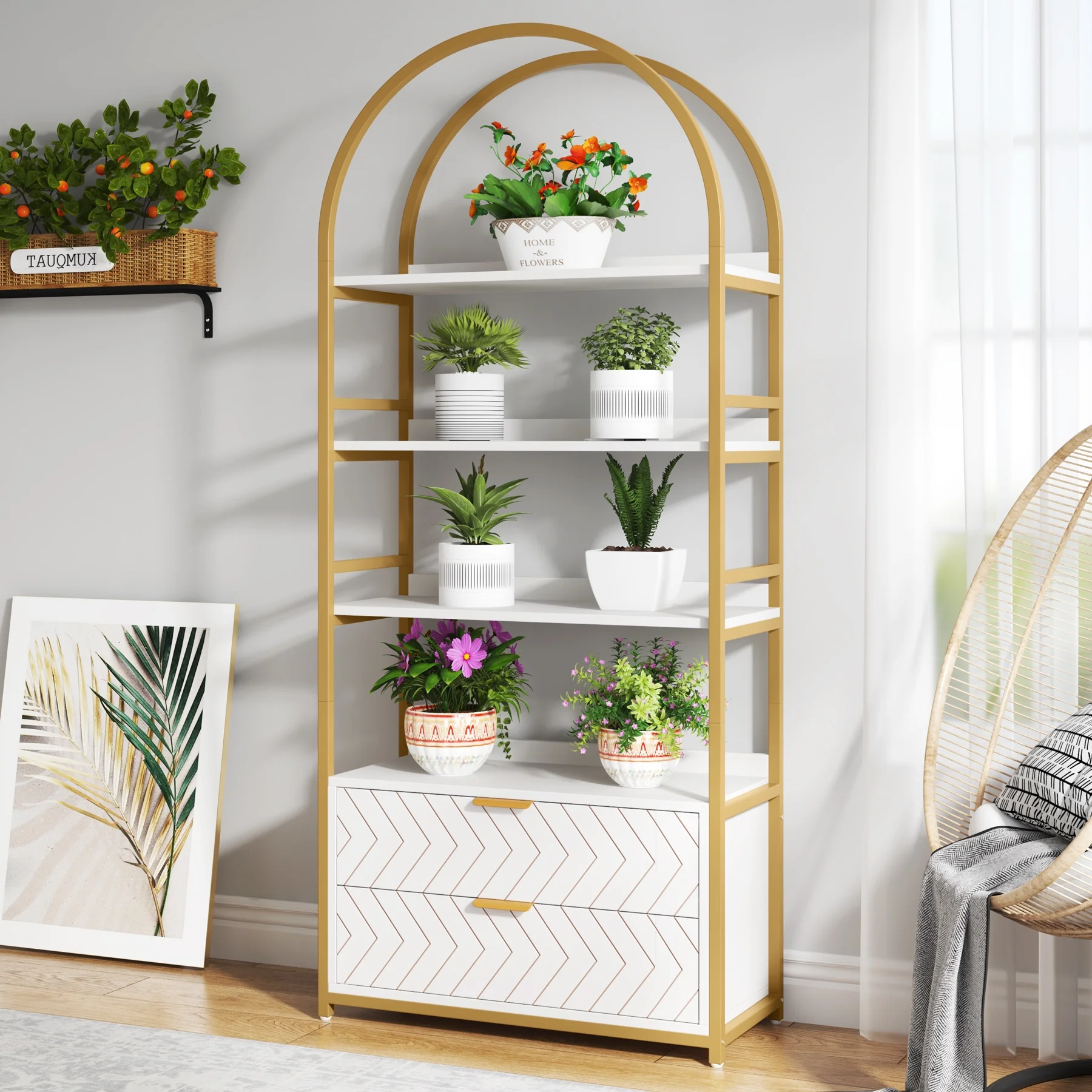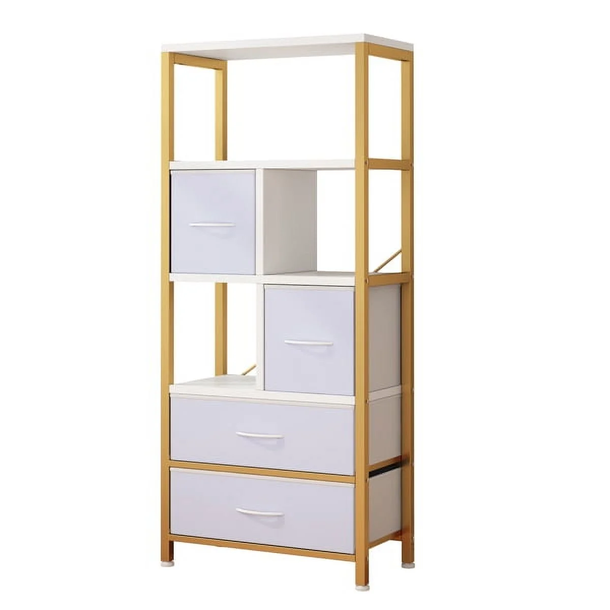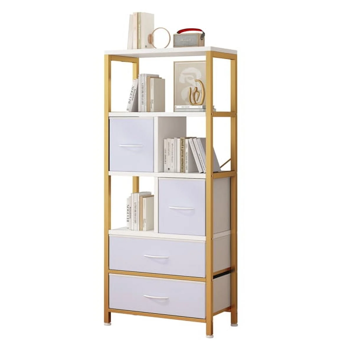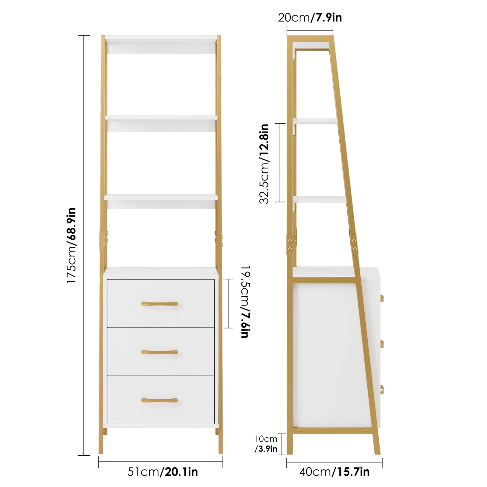 Homfa Trapezoidal Bookshelf, 3-Tier Open Storage Shelves with 3 Drawers, White and Gold Finish
