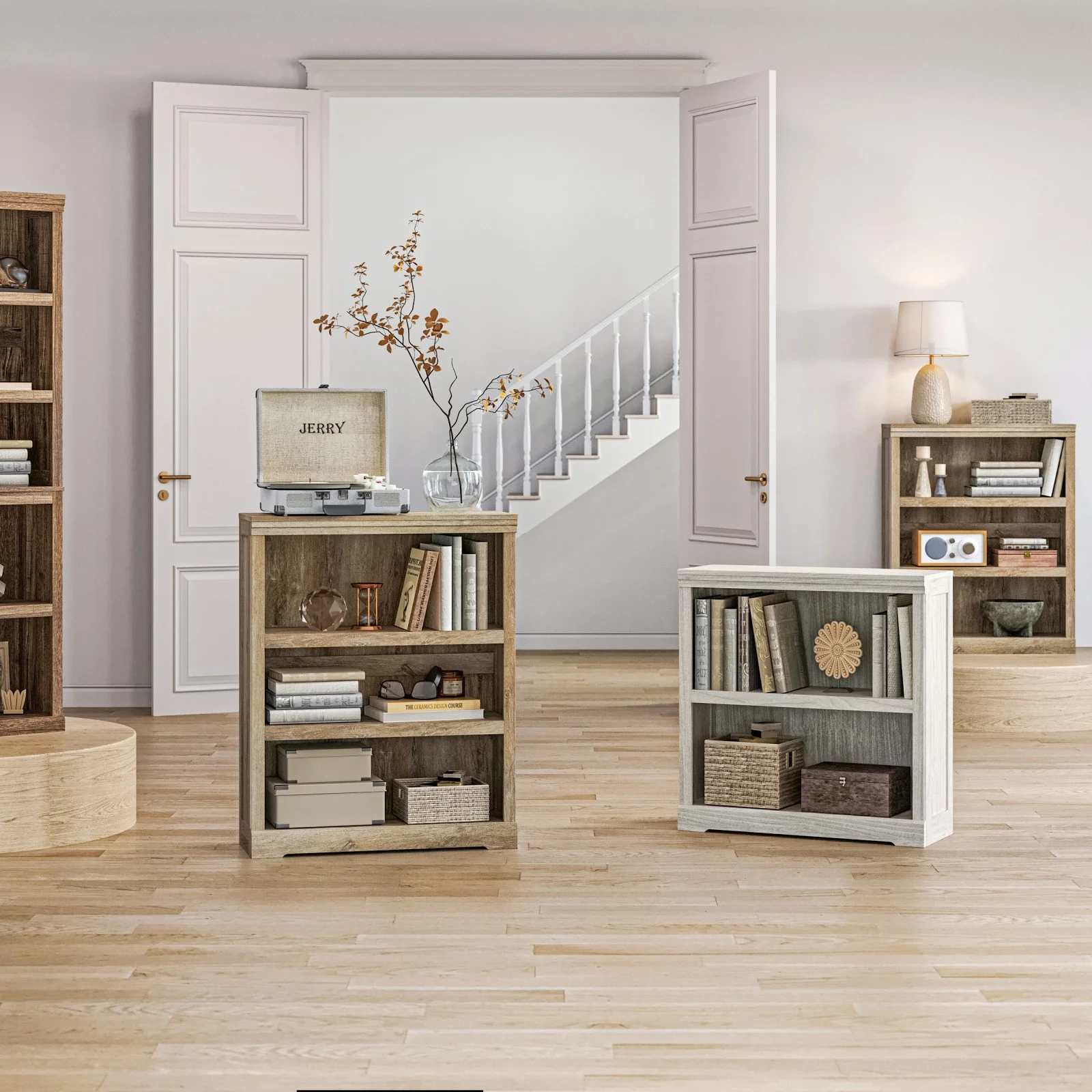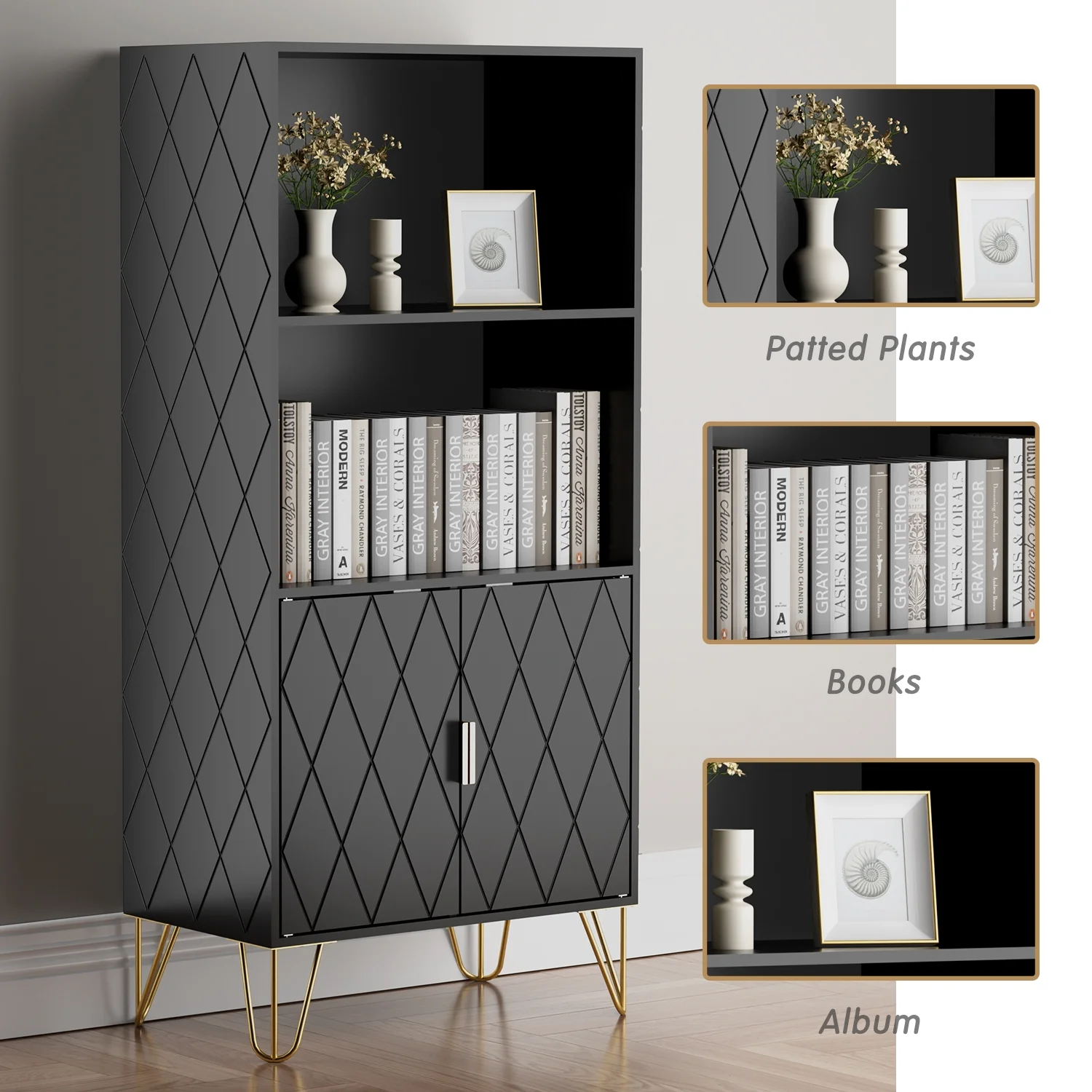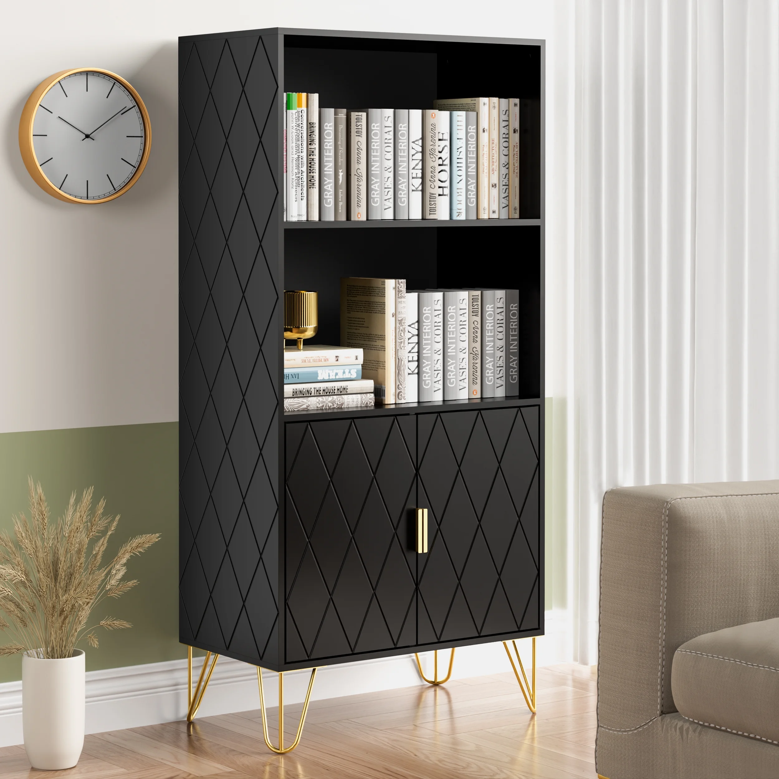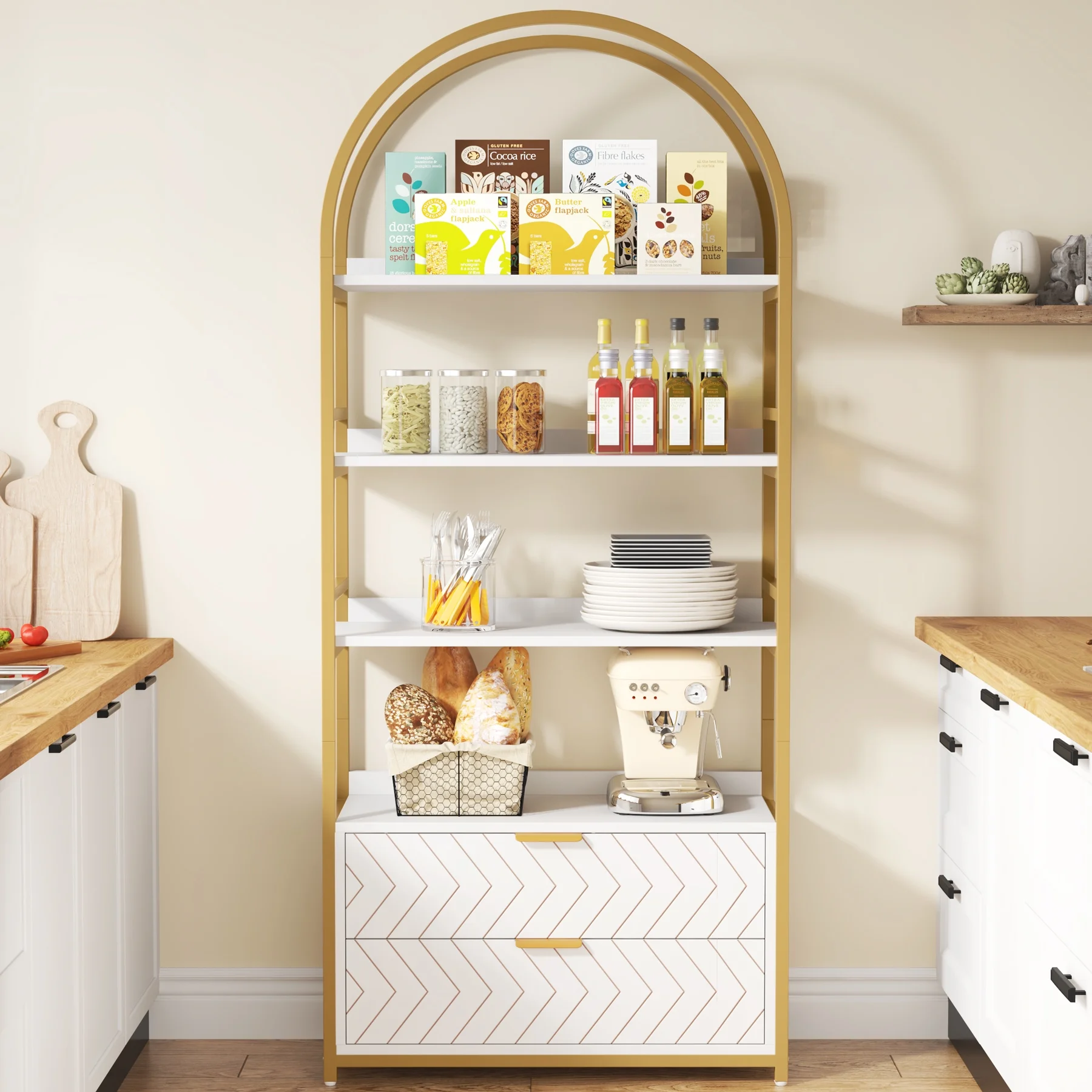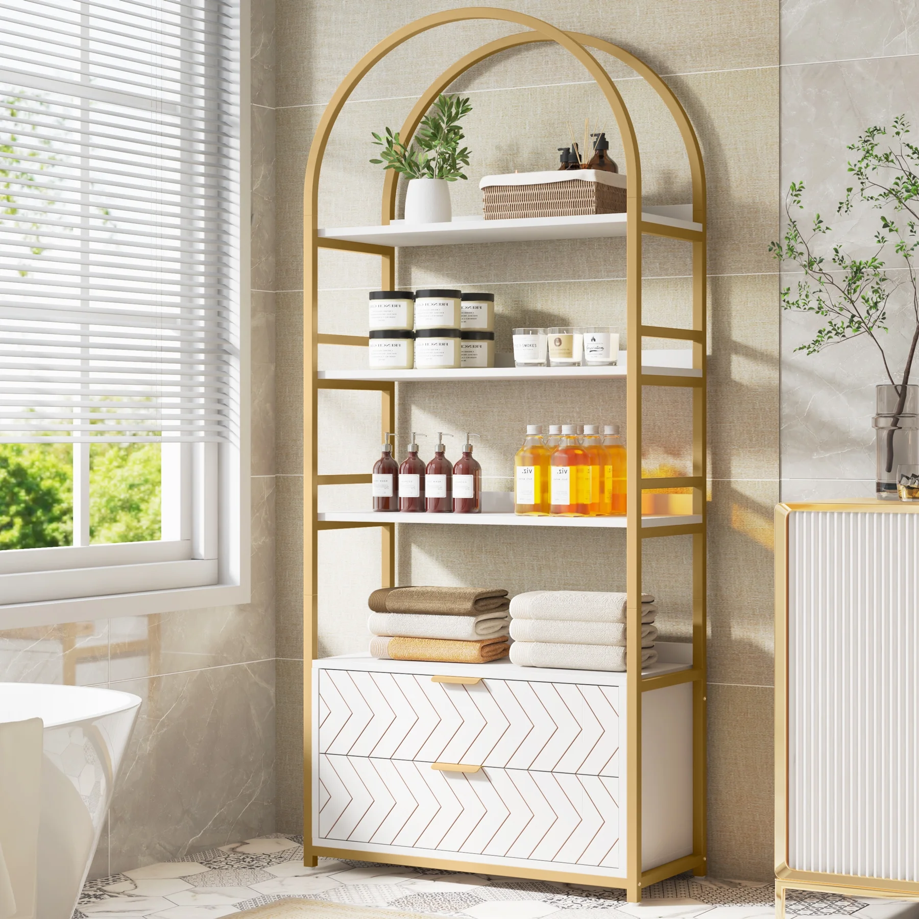 Homfa Trapezoidal Bookshelf, 3-Tier Open Storage Shelves with 3 Drawers, White and Gold Finish