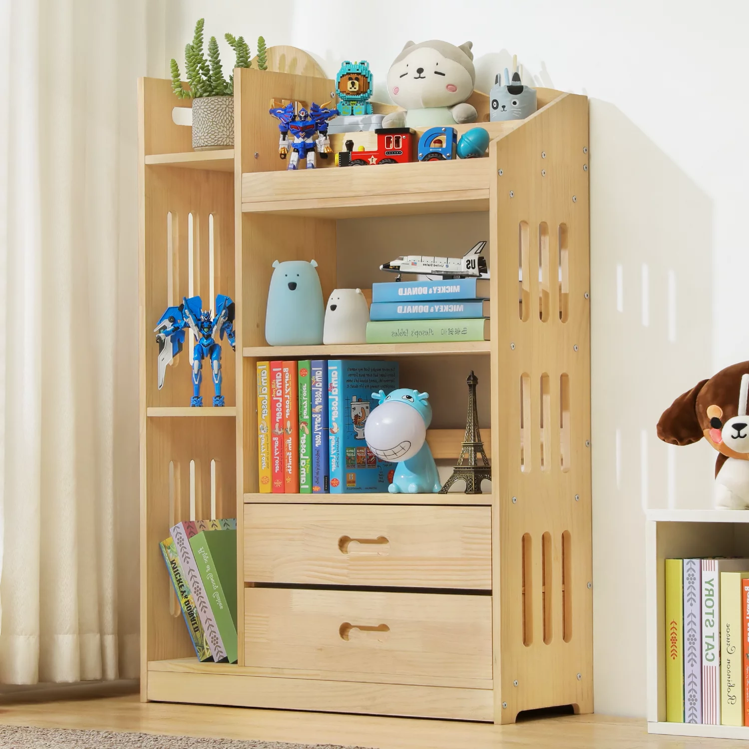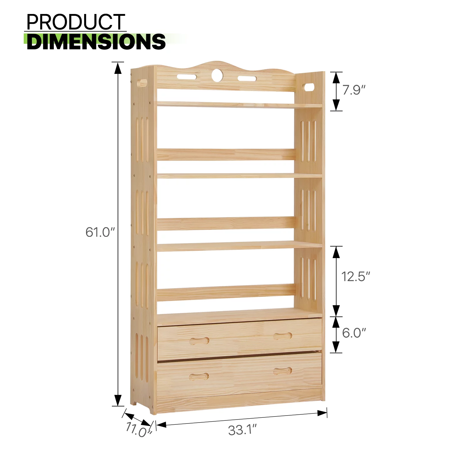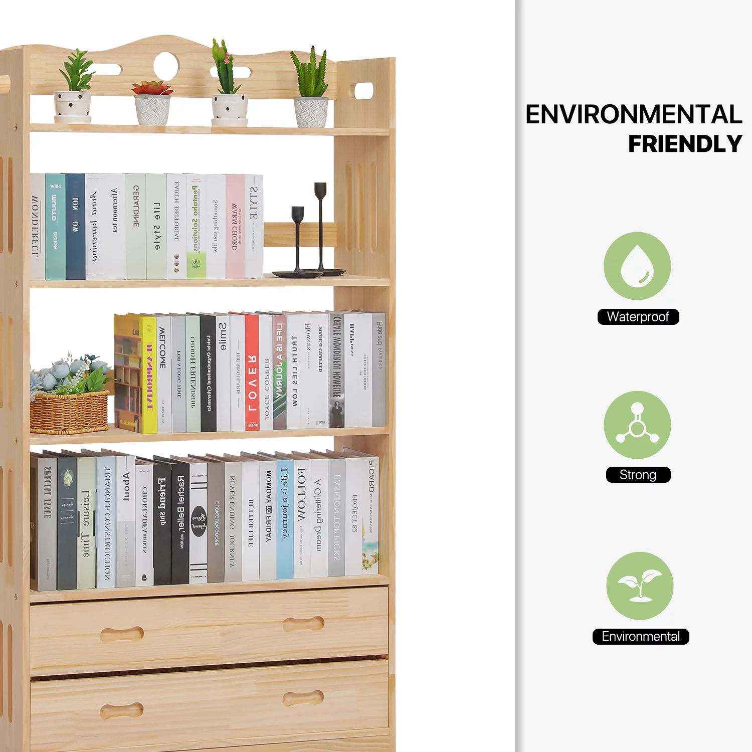 Magshion Wood 5 Shelves 2 Drawers Bookshelf, Books Toys Organizer Bookcase, Natural, for Home