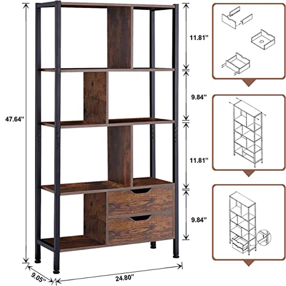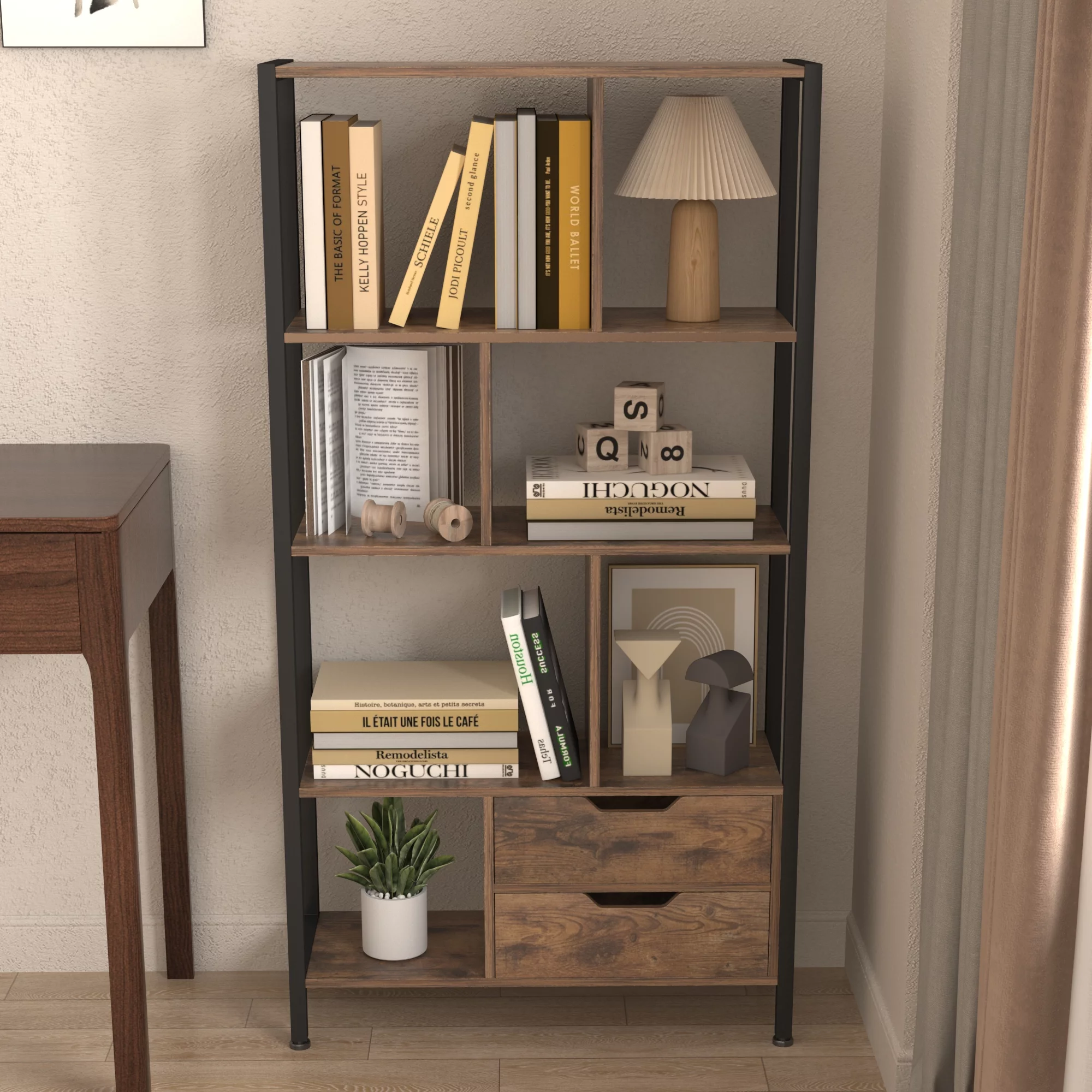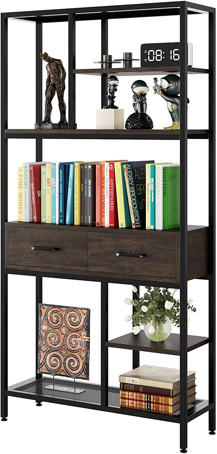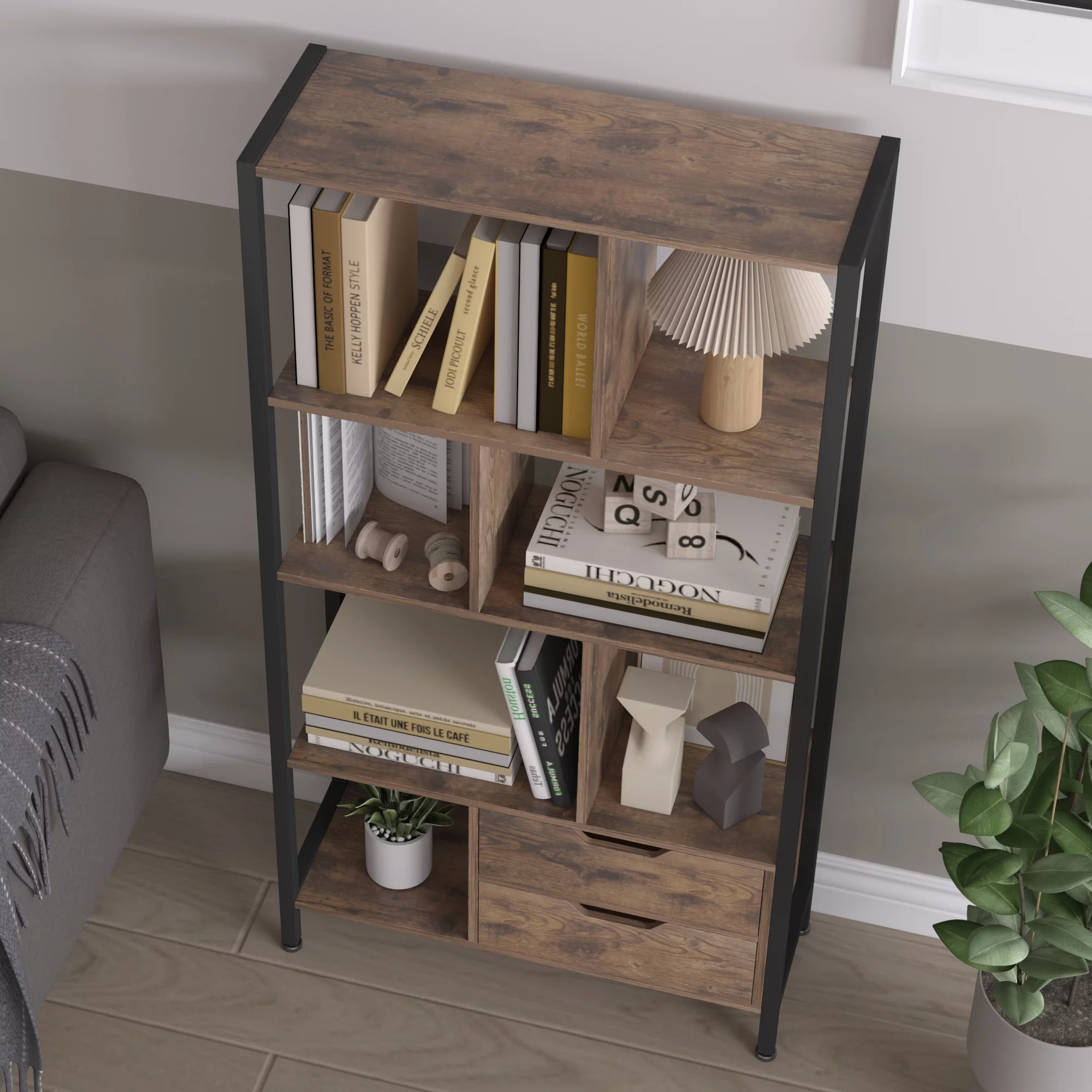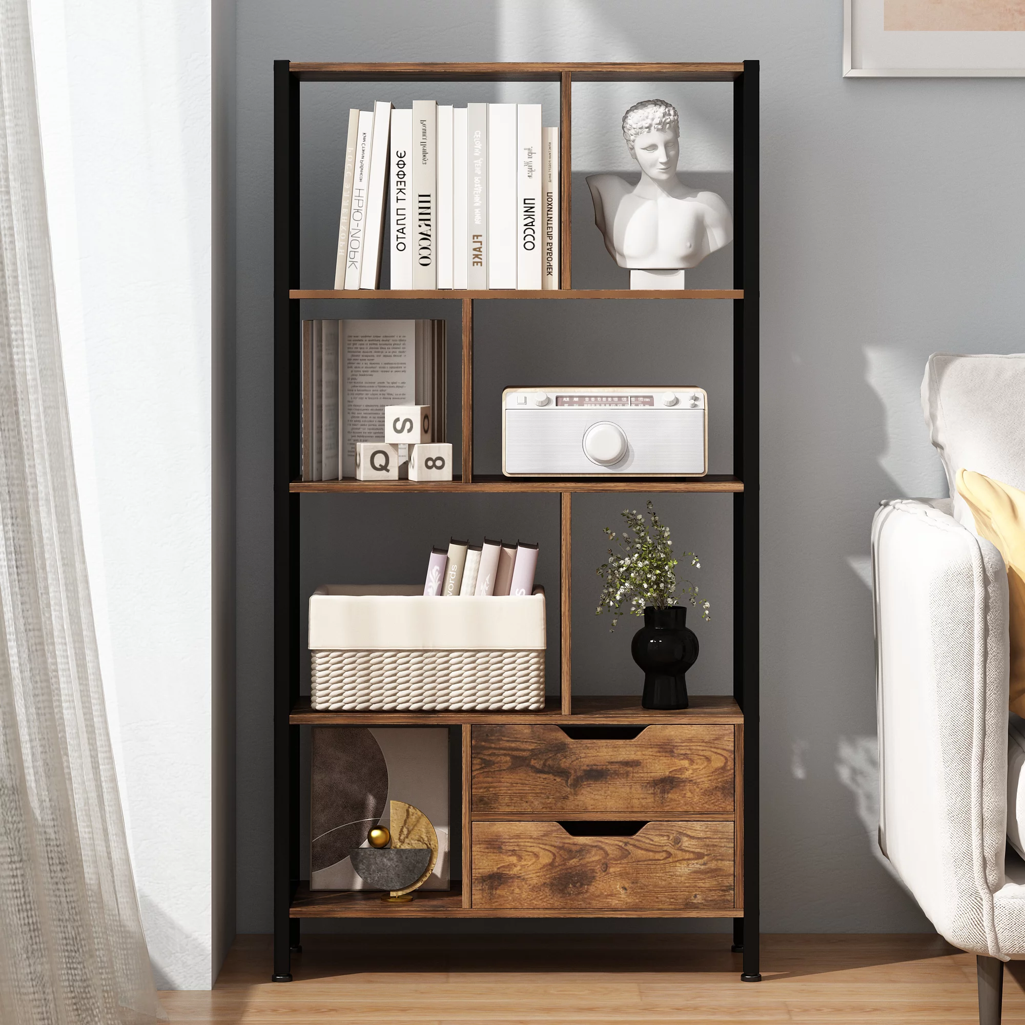 Magshion Wood 5 Tiers 2 Drawers Bookcase, Display Storage Bookshelf, Natural, for Living Room