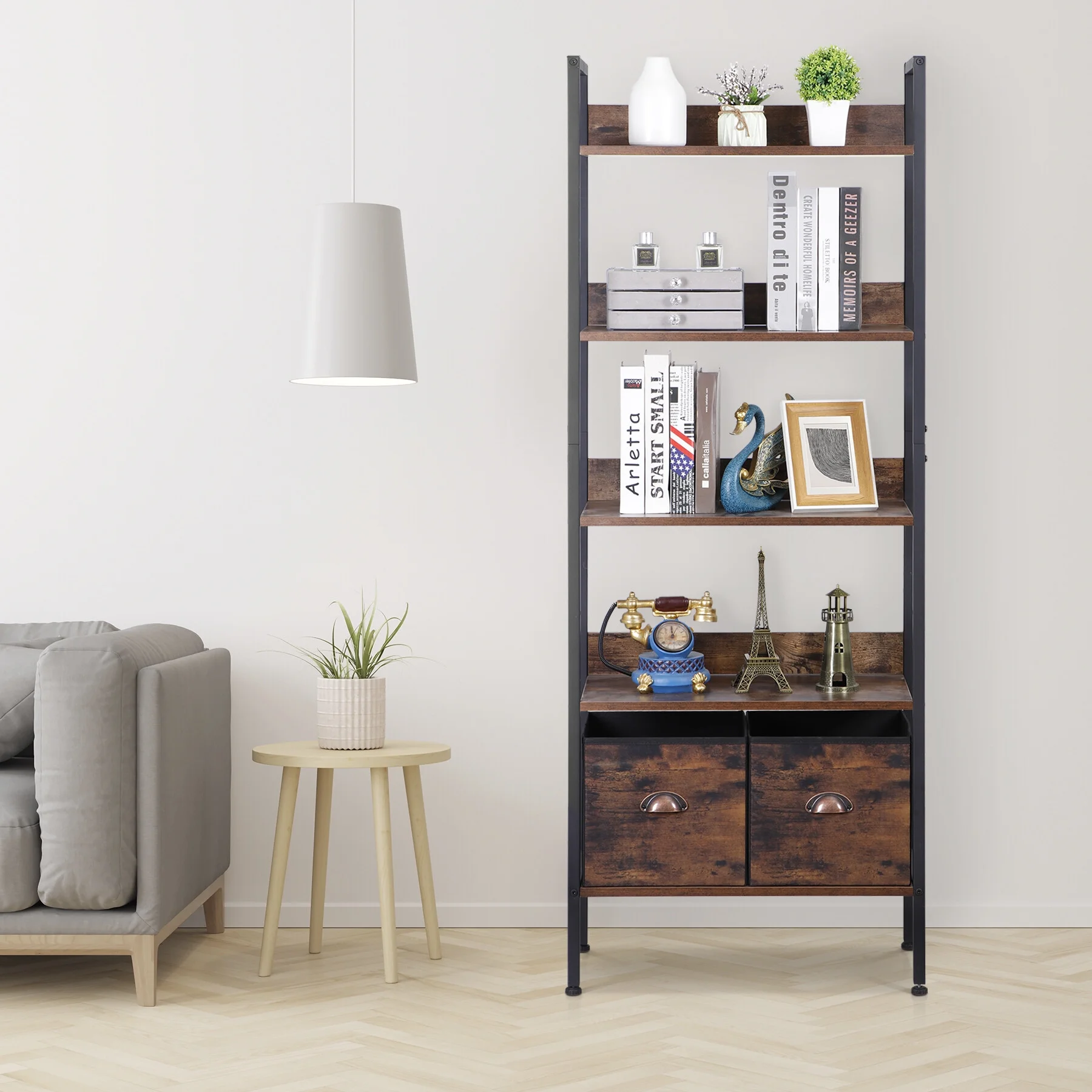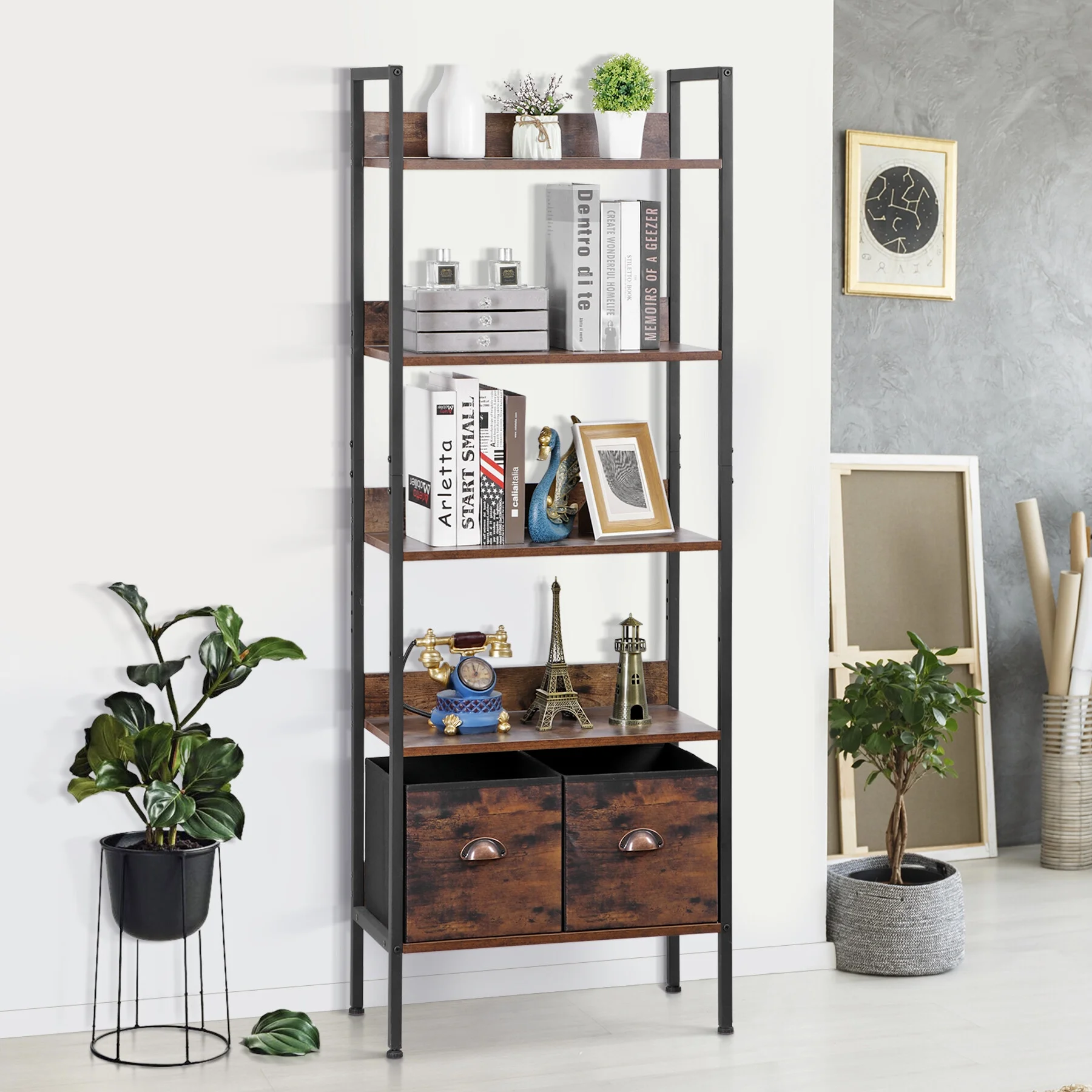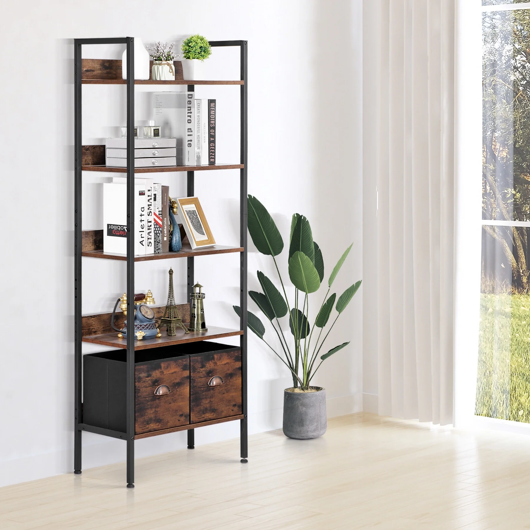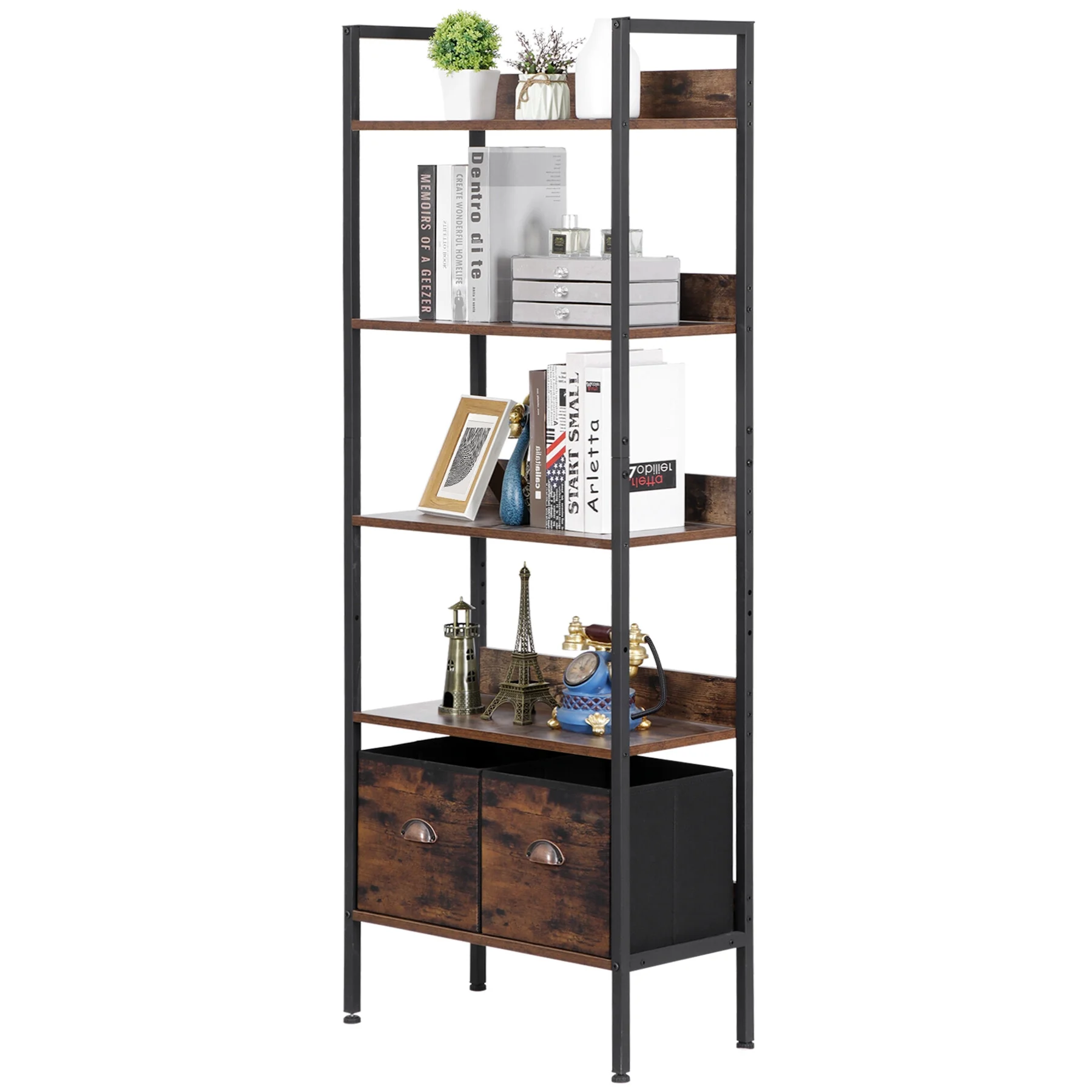 HomGarden 5 Tier Bookshelf Adjustable Bookcase W/ 2 Fabric Drawers for Home Office Living Room Rustic Brown