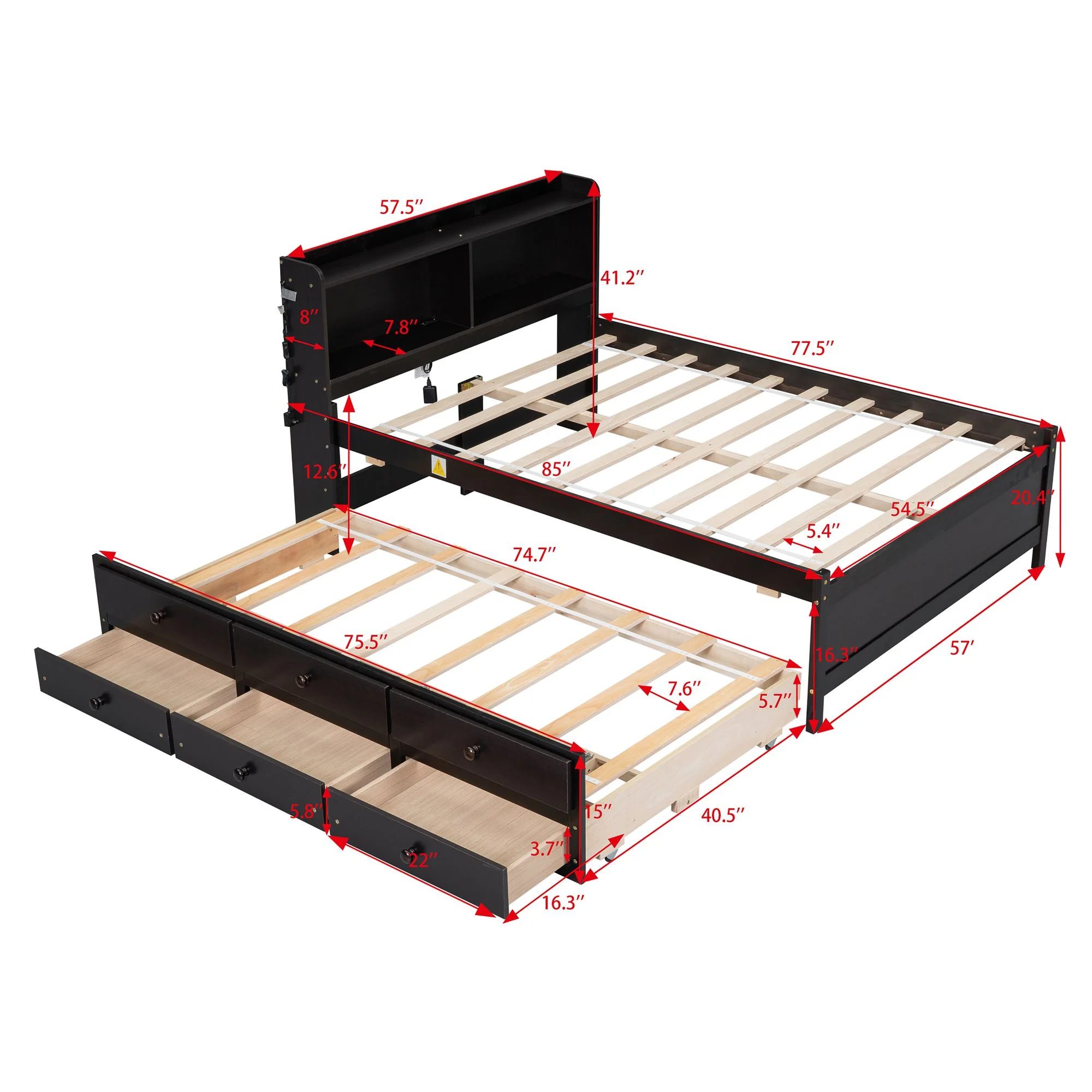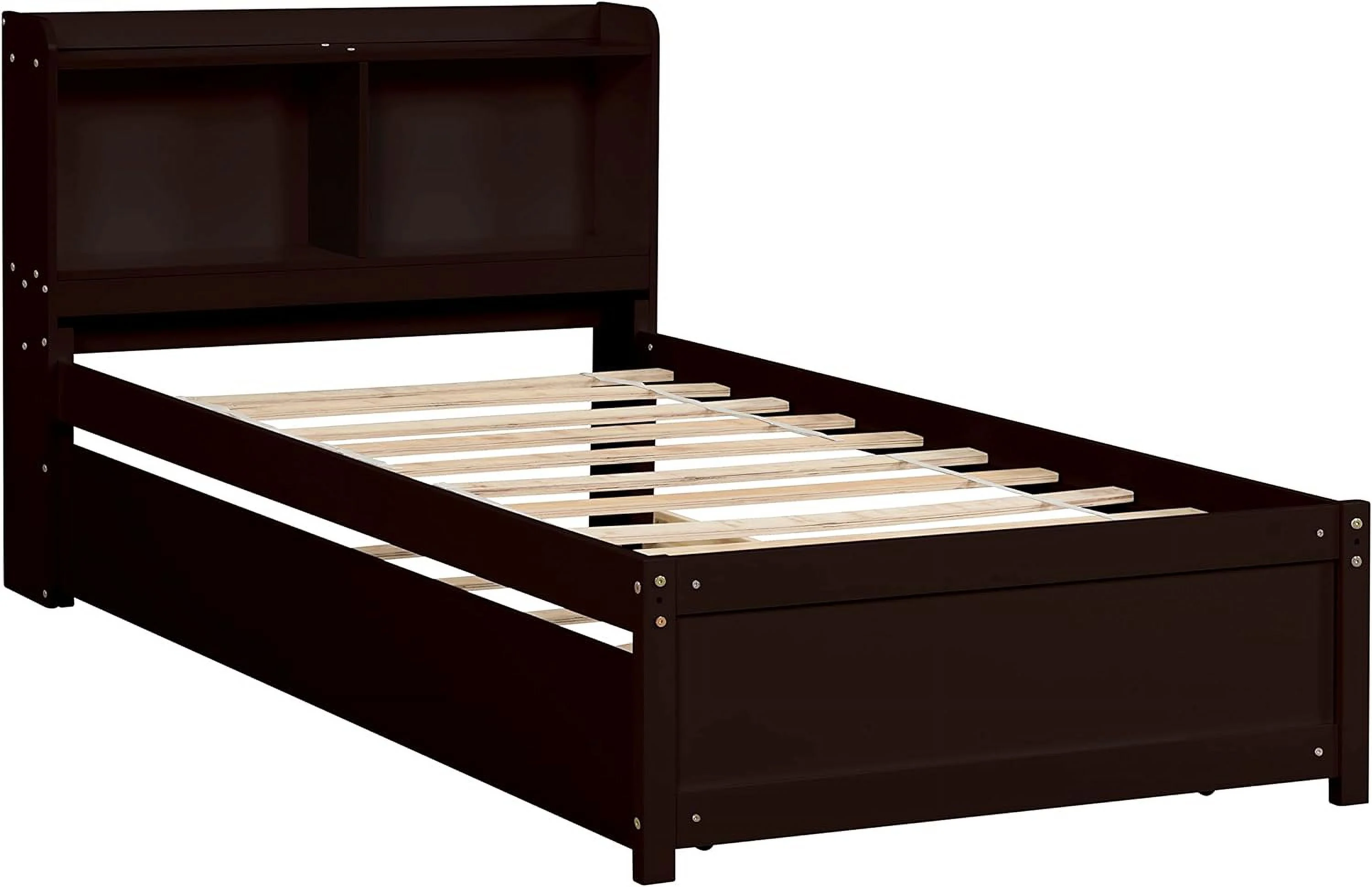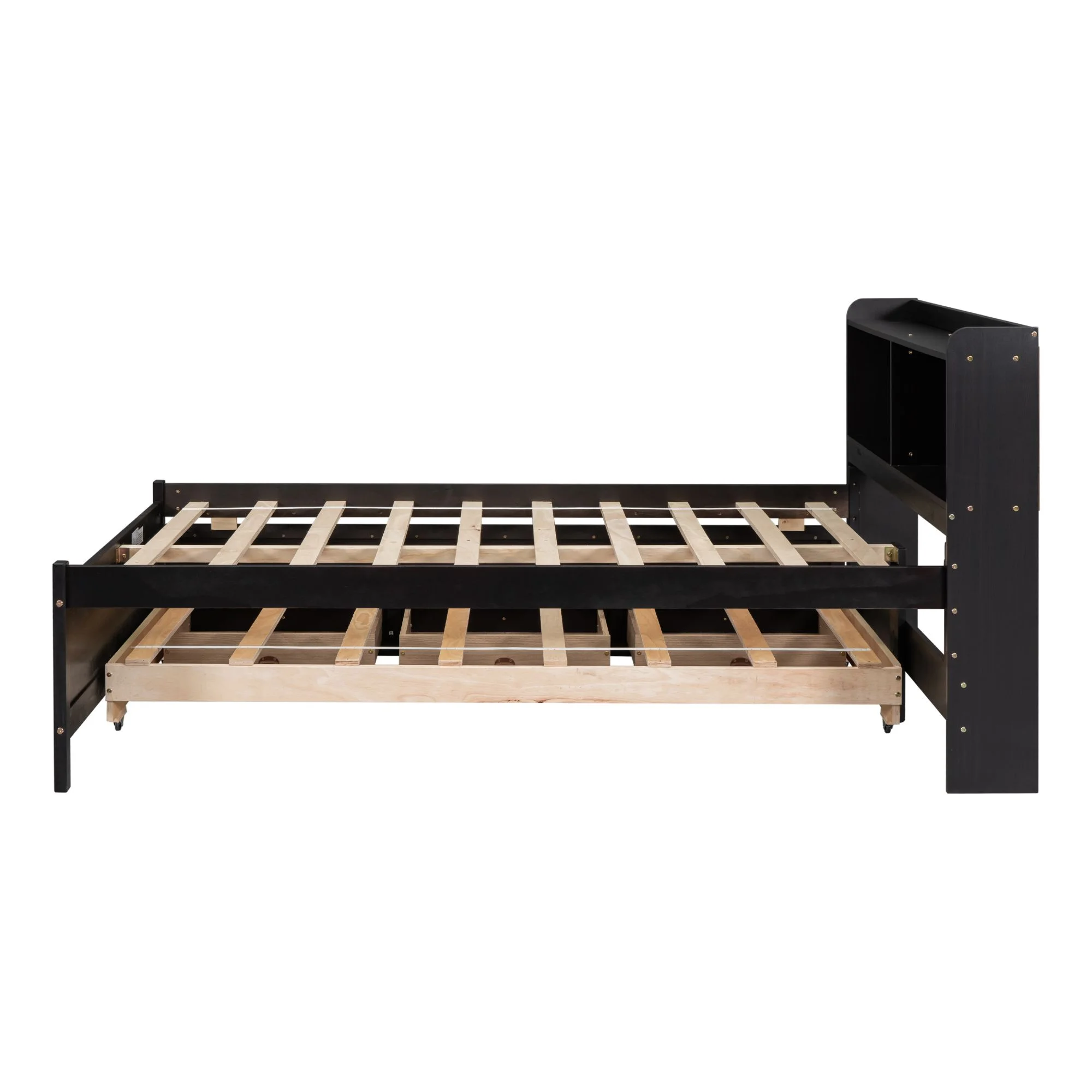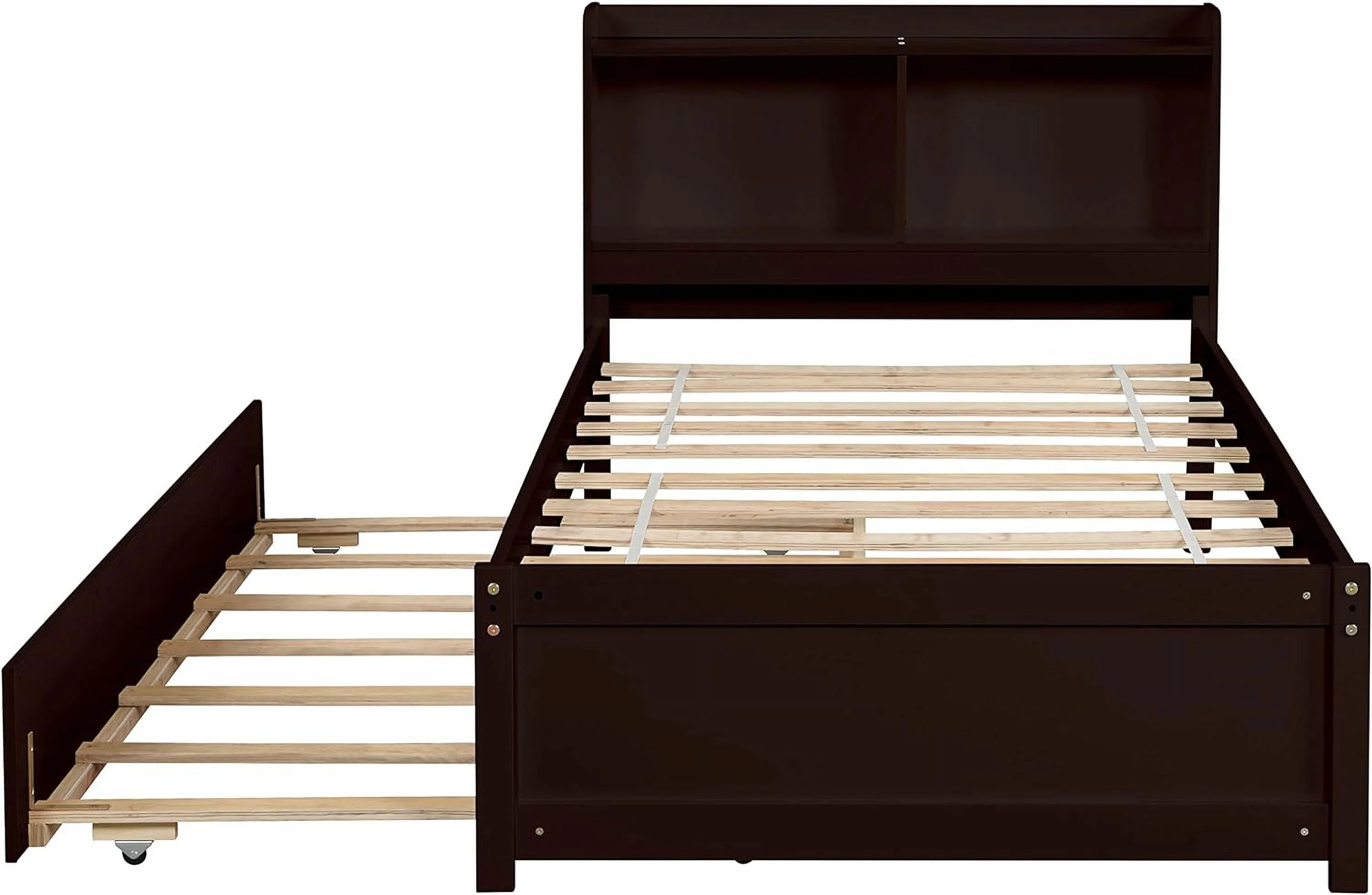 Size Platform Bed With Trundle And Bookcase, Wooden Storage Platform Bed With Storage Headboard, No Spring Box Needed, Espresoo