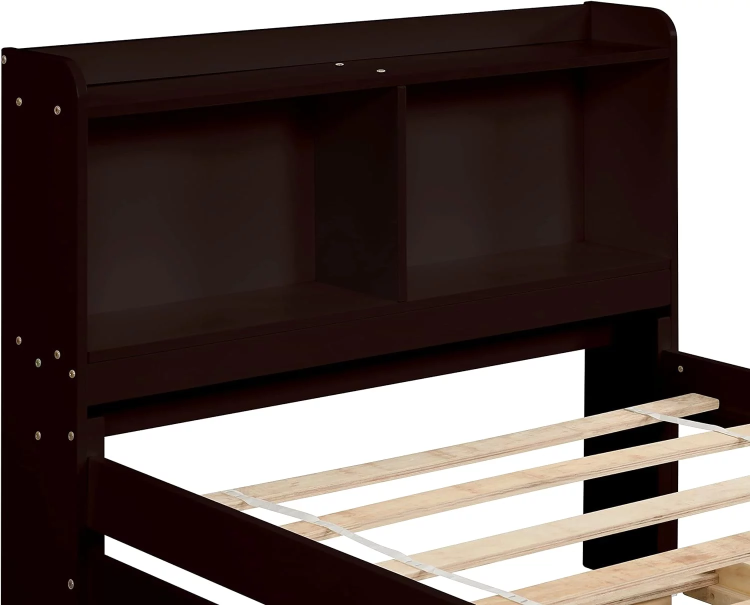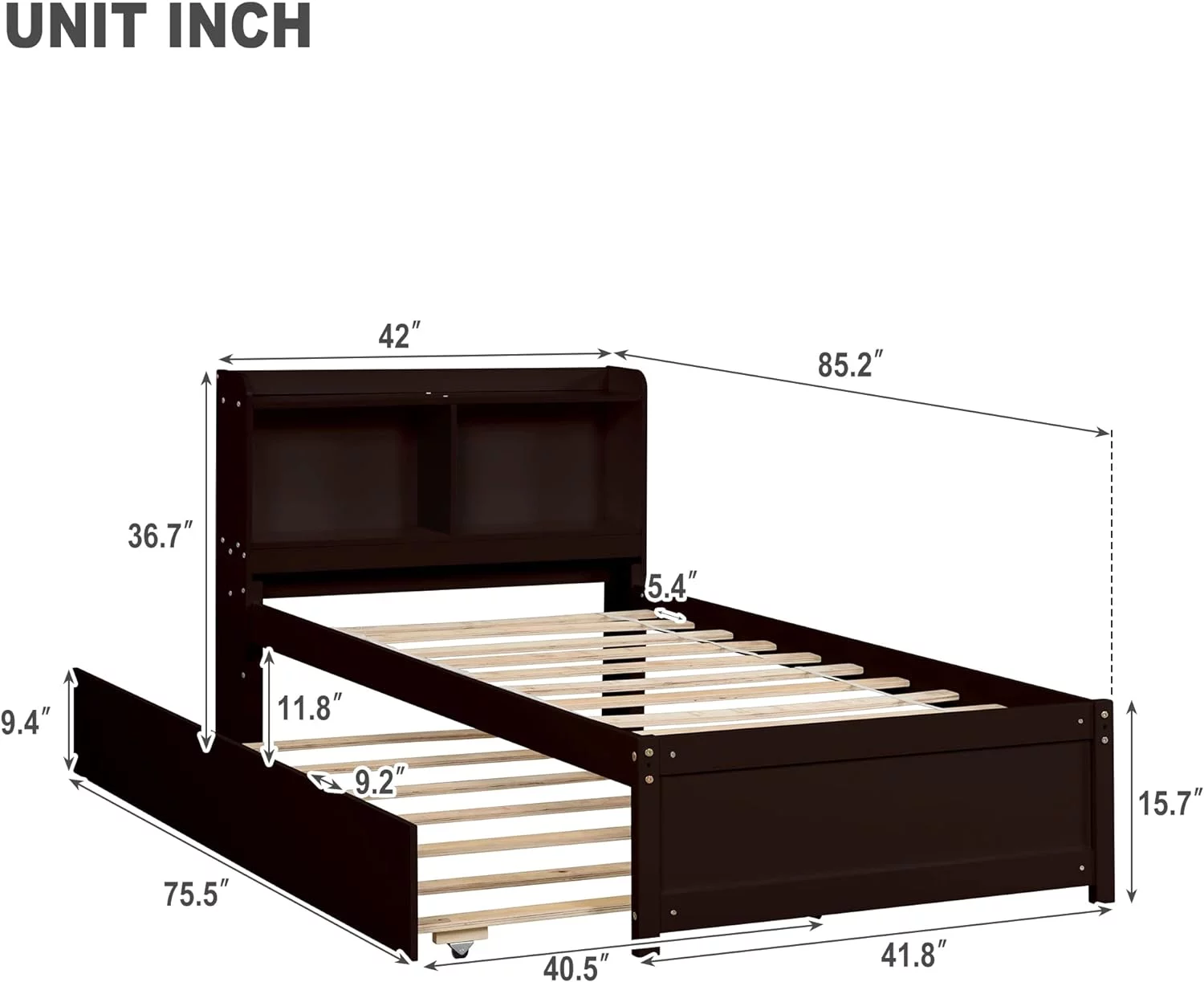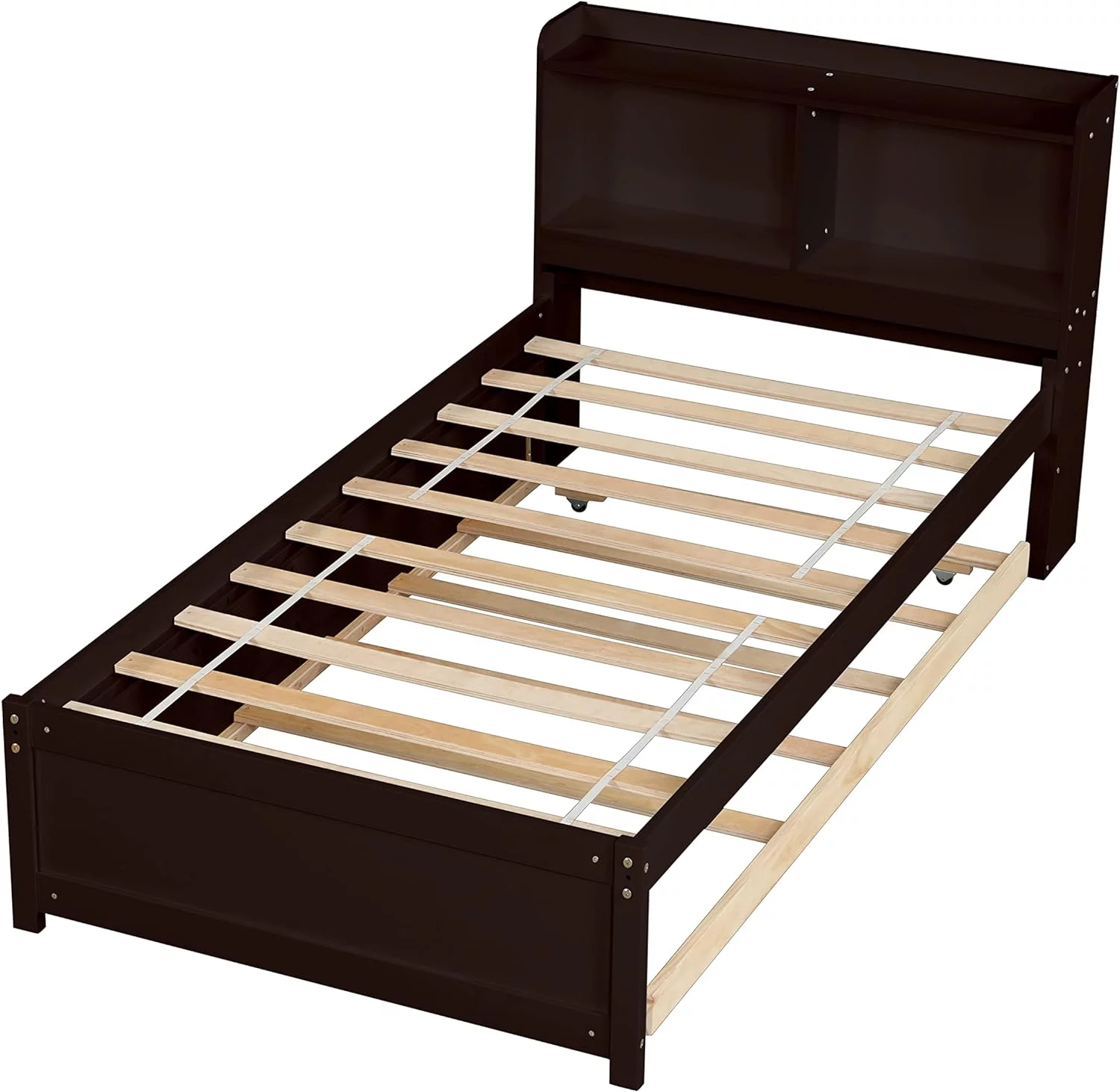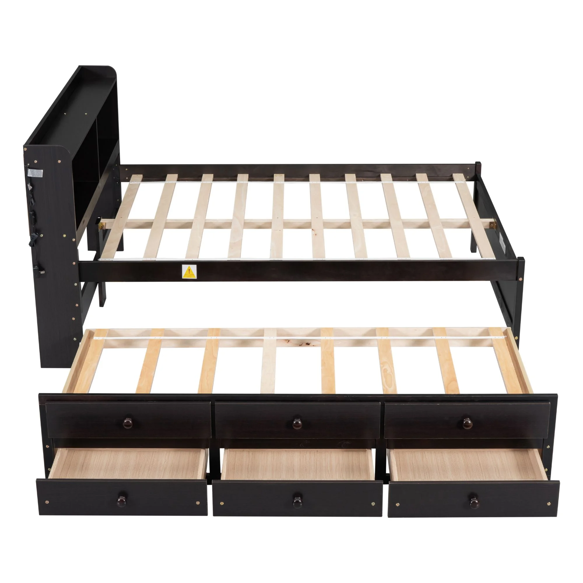 Size Platform Bed With Trundle And Bookcase, Wooden Storage Platform Bed With Storage Headboard, No Spring Box Needed, Espresoo
