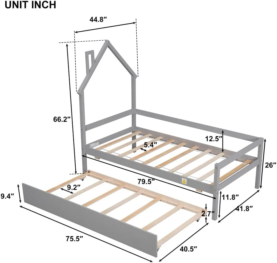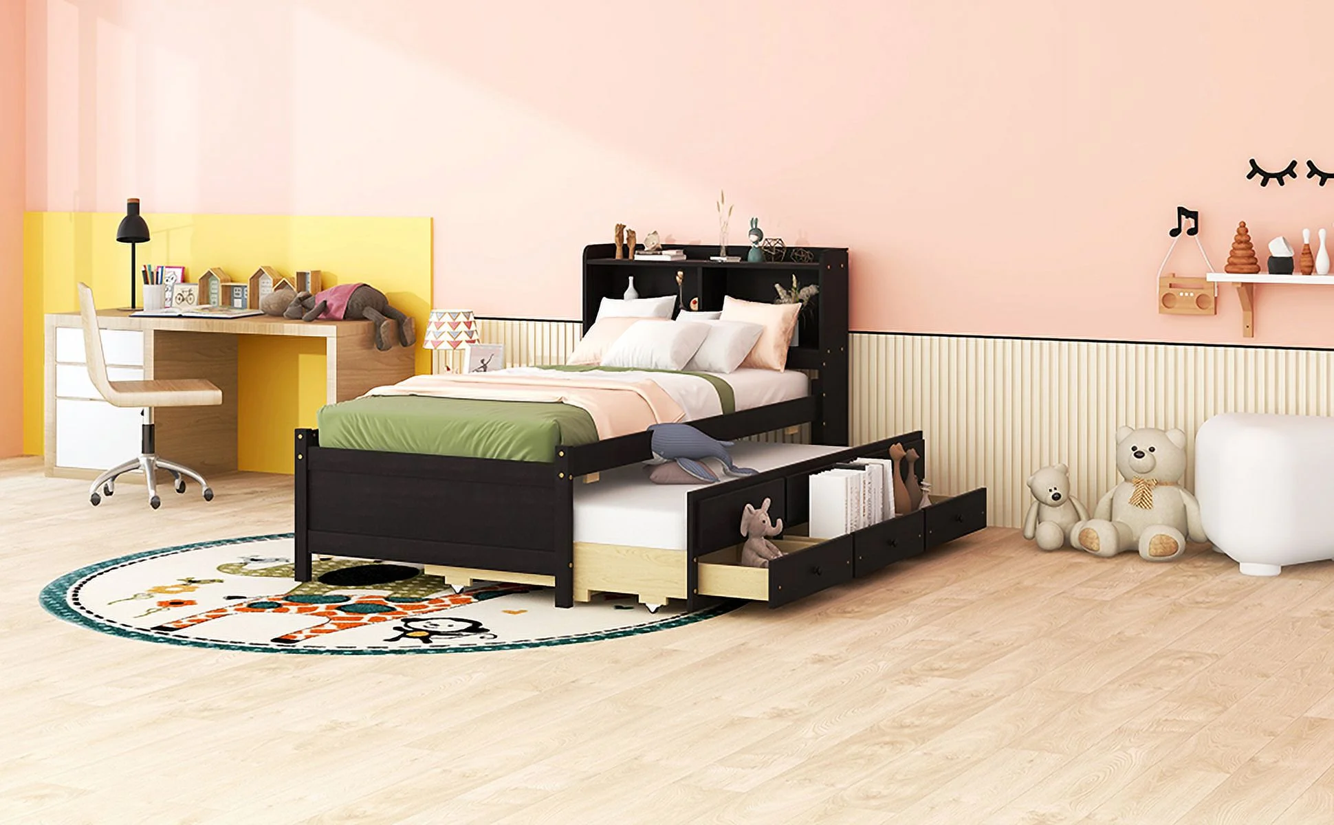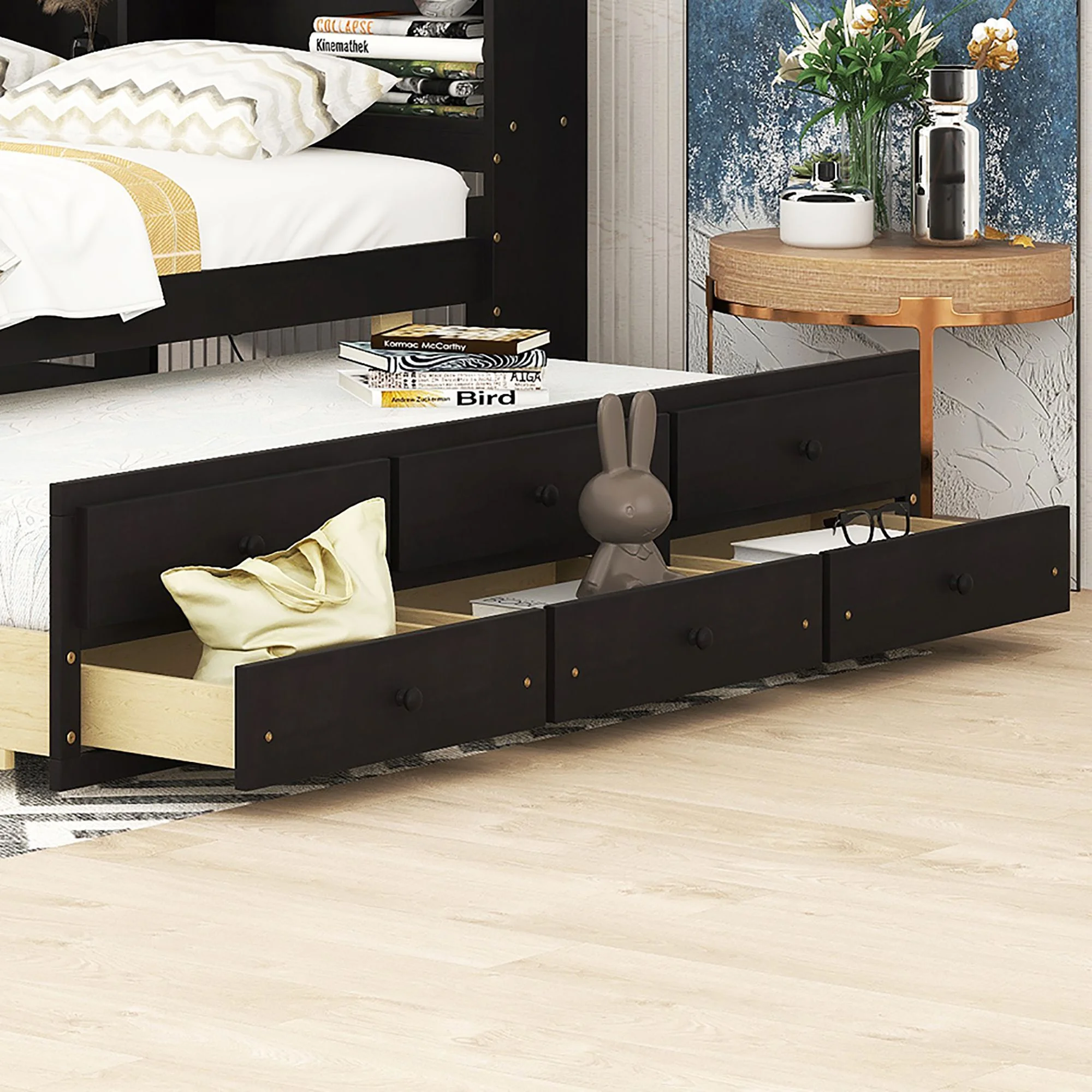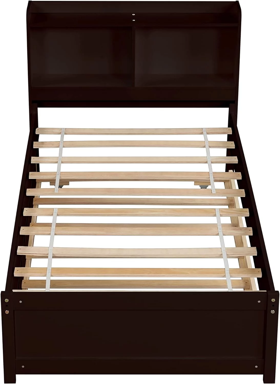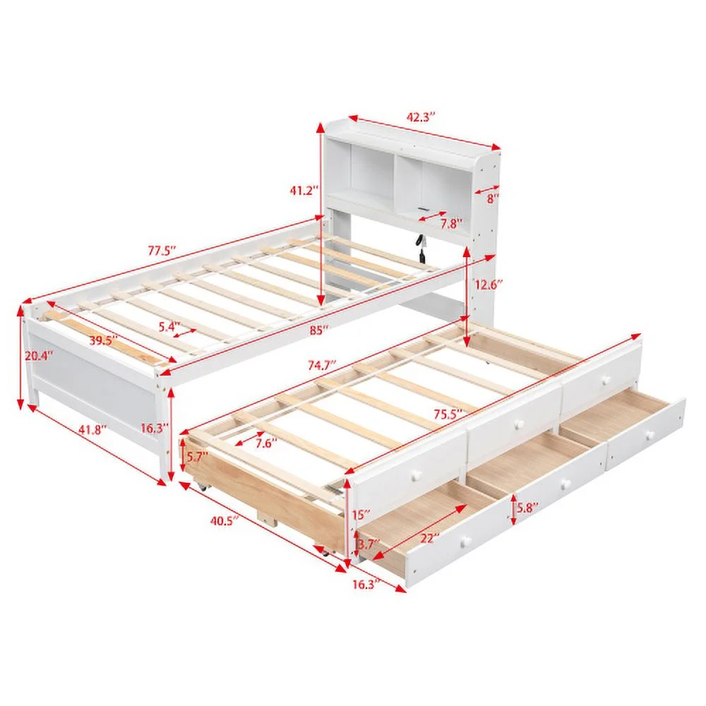 Size Platform Bed With Trundle And Bookcase, Wooden Storage Platform Bed With Storage Headboard, No Spring Box Needed, Espresoo