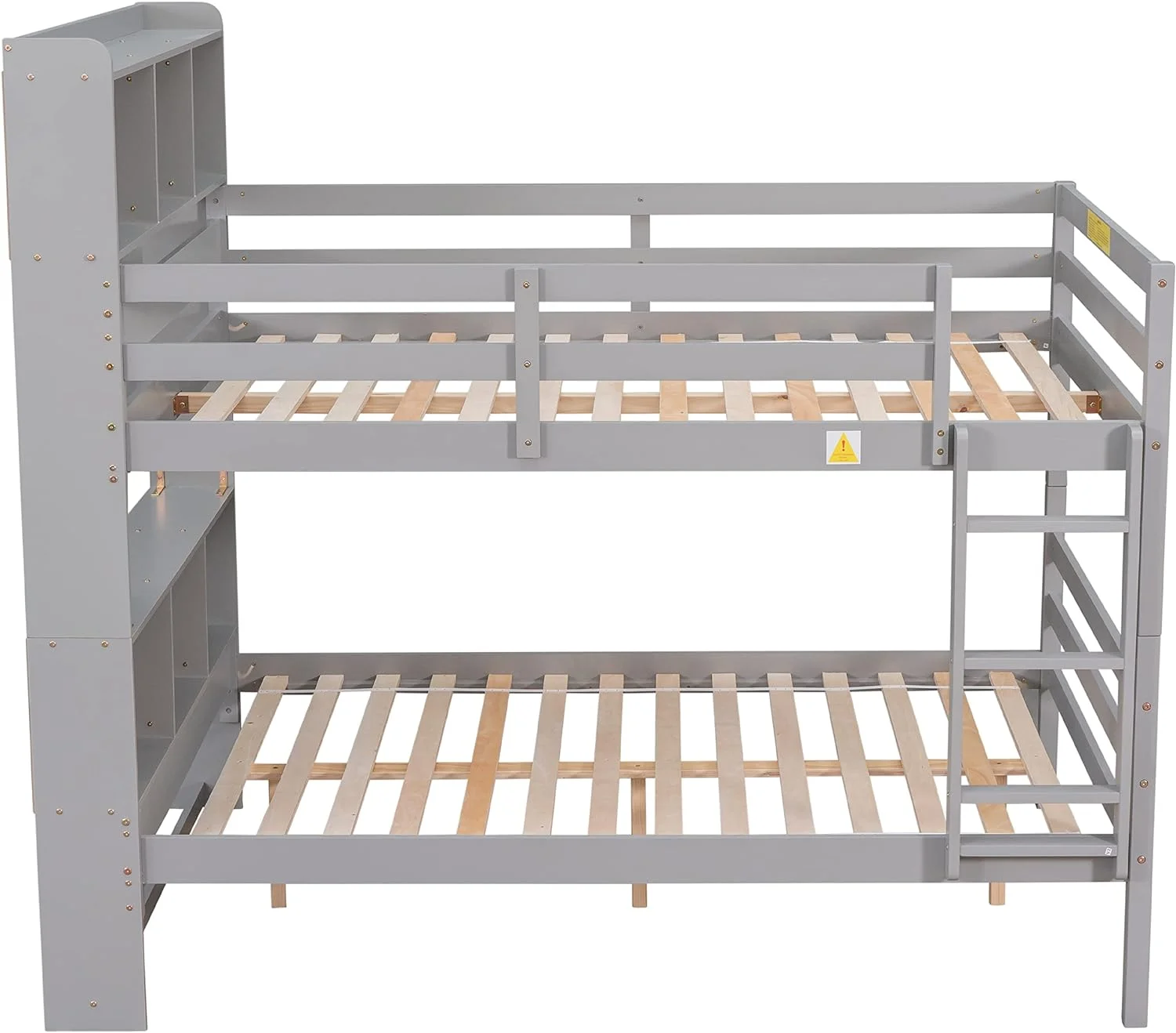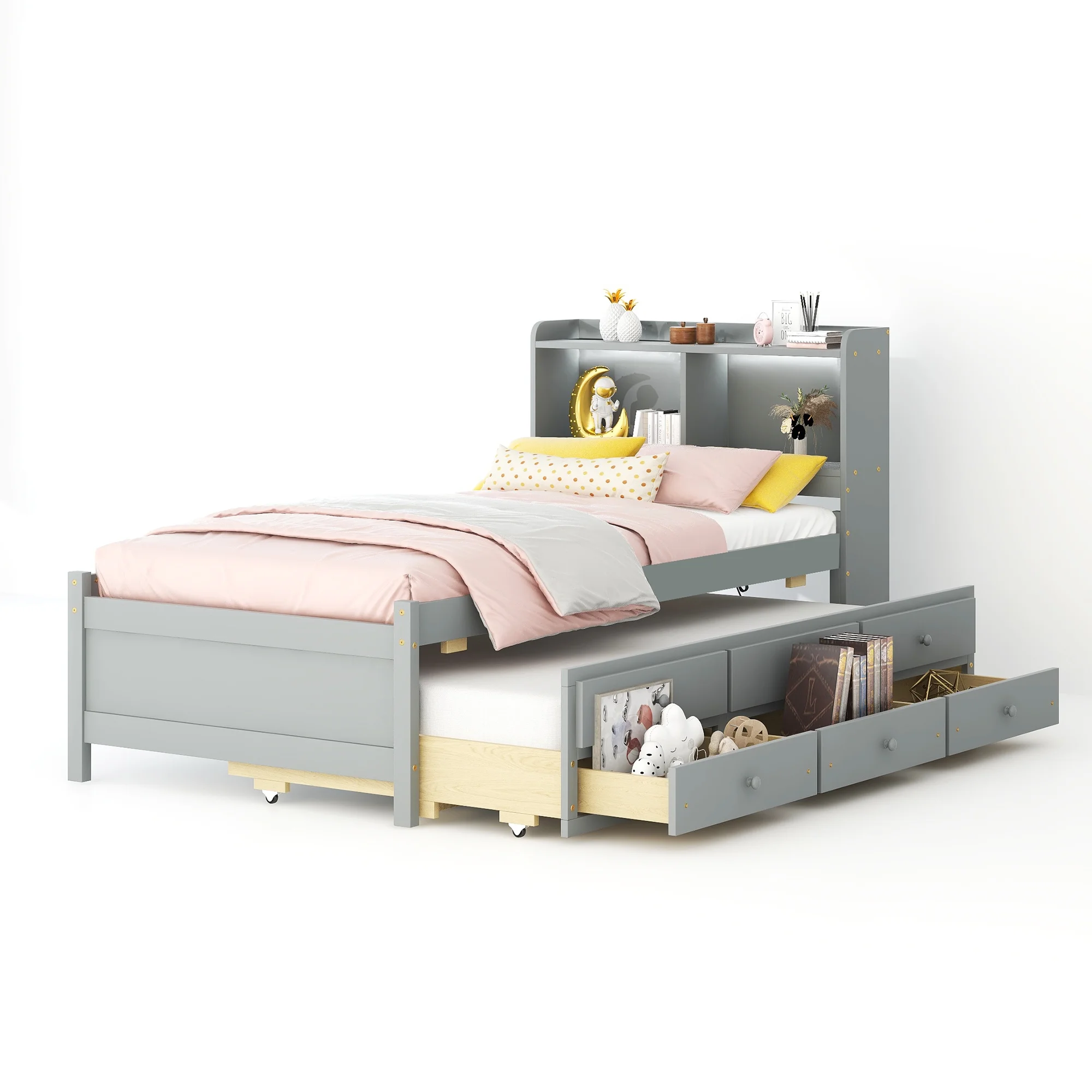 Sun Wood Twin Size Storage Bed with Bookcase Headboard & 4 Underbed Drawer, Gray & Brown