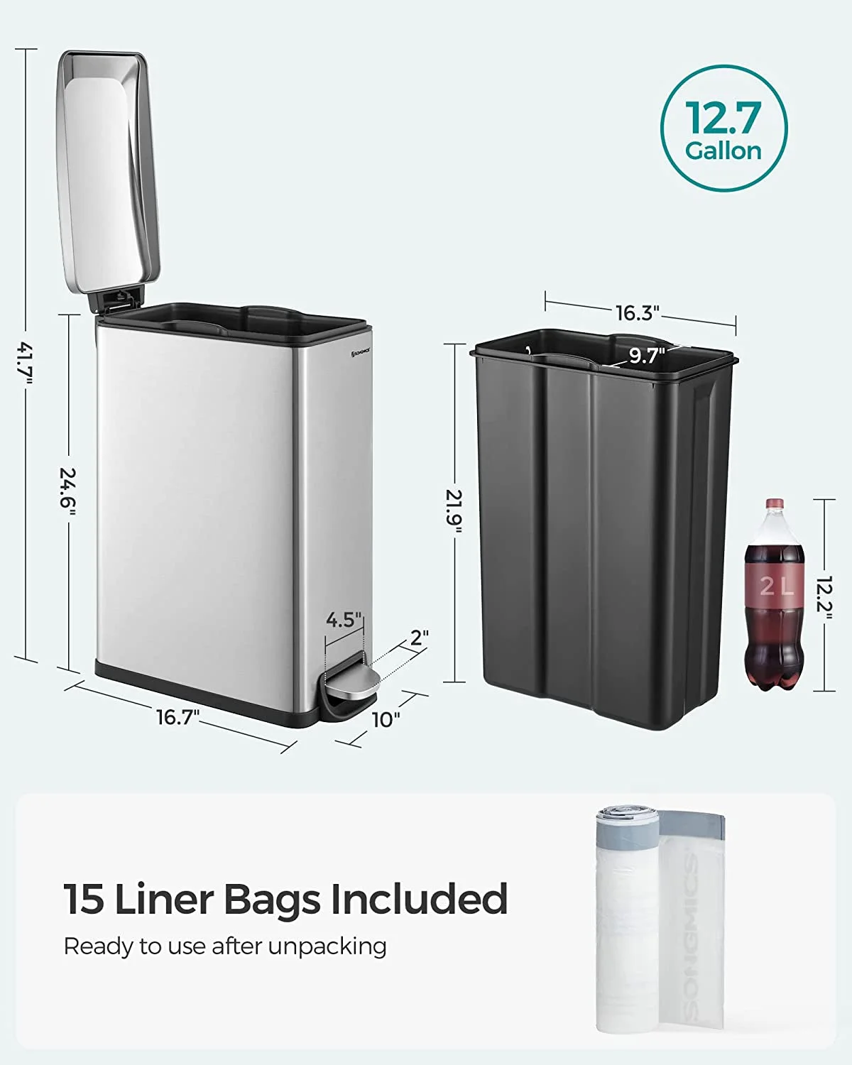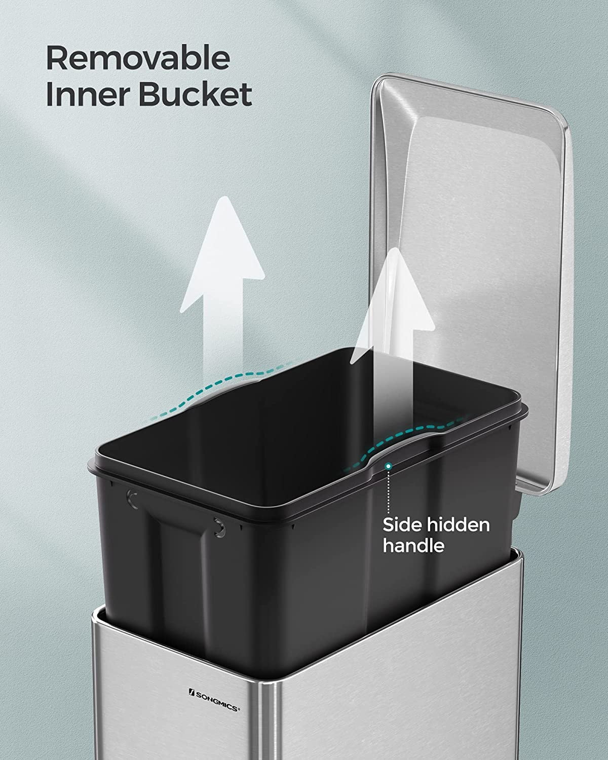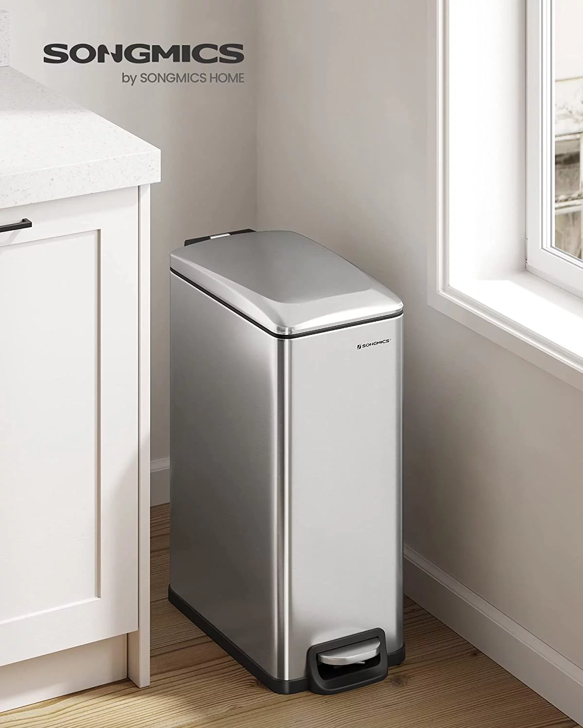 SONGMICS 12.7 Gallon Slim Trash Can, Kitchen Garbage Can for Narrow Spaces, Stainless Steel, Silver