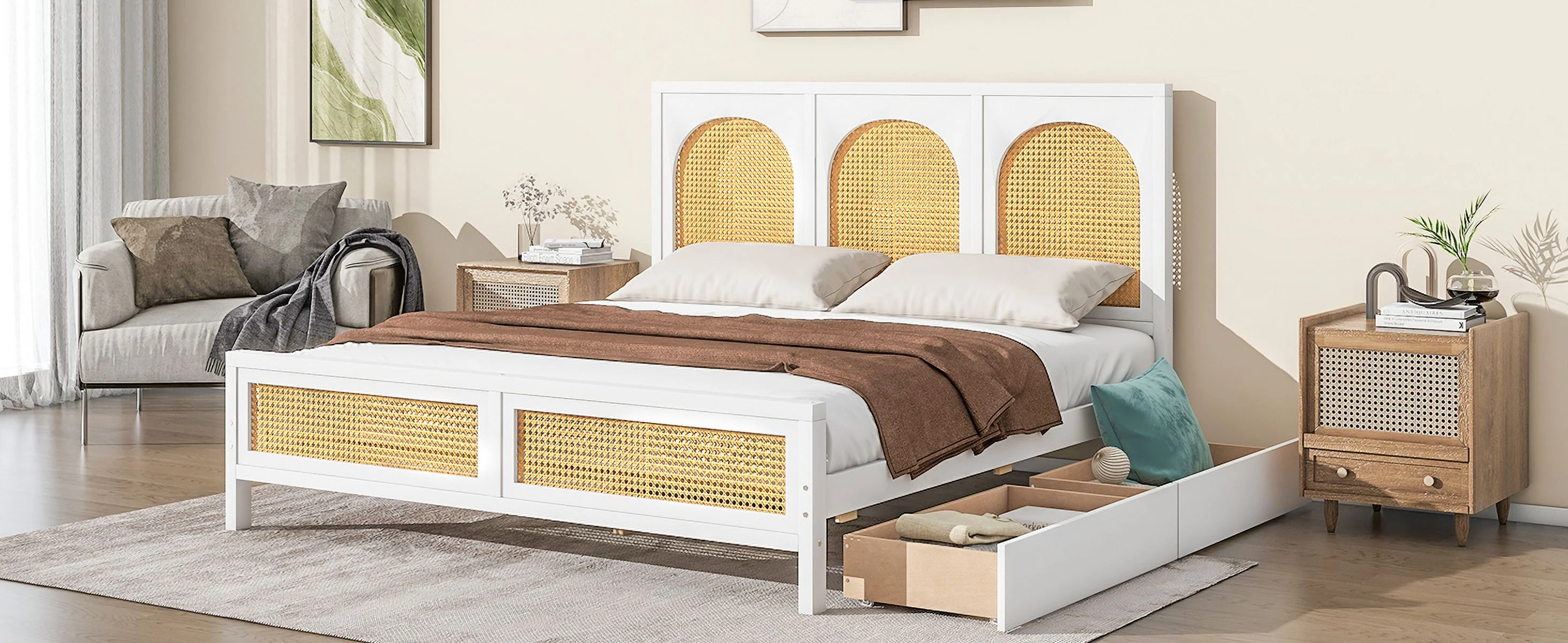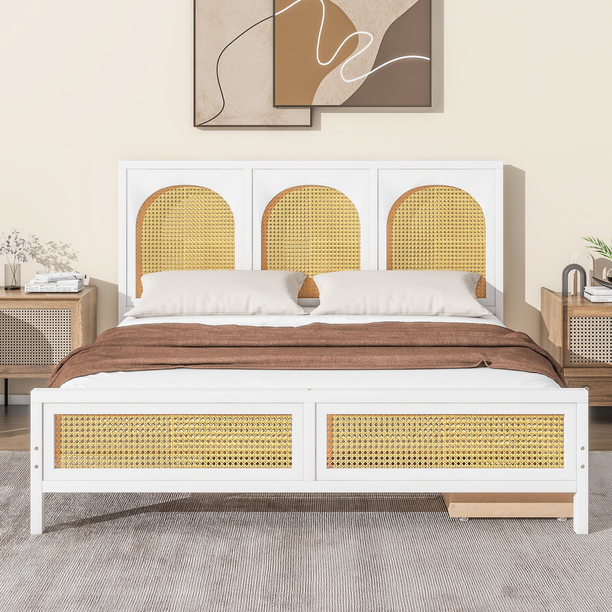 CoSoTower Queen Size Wood Storage Platform Bed with 2 Drawers, Rattan Headboard and Footboard, White