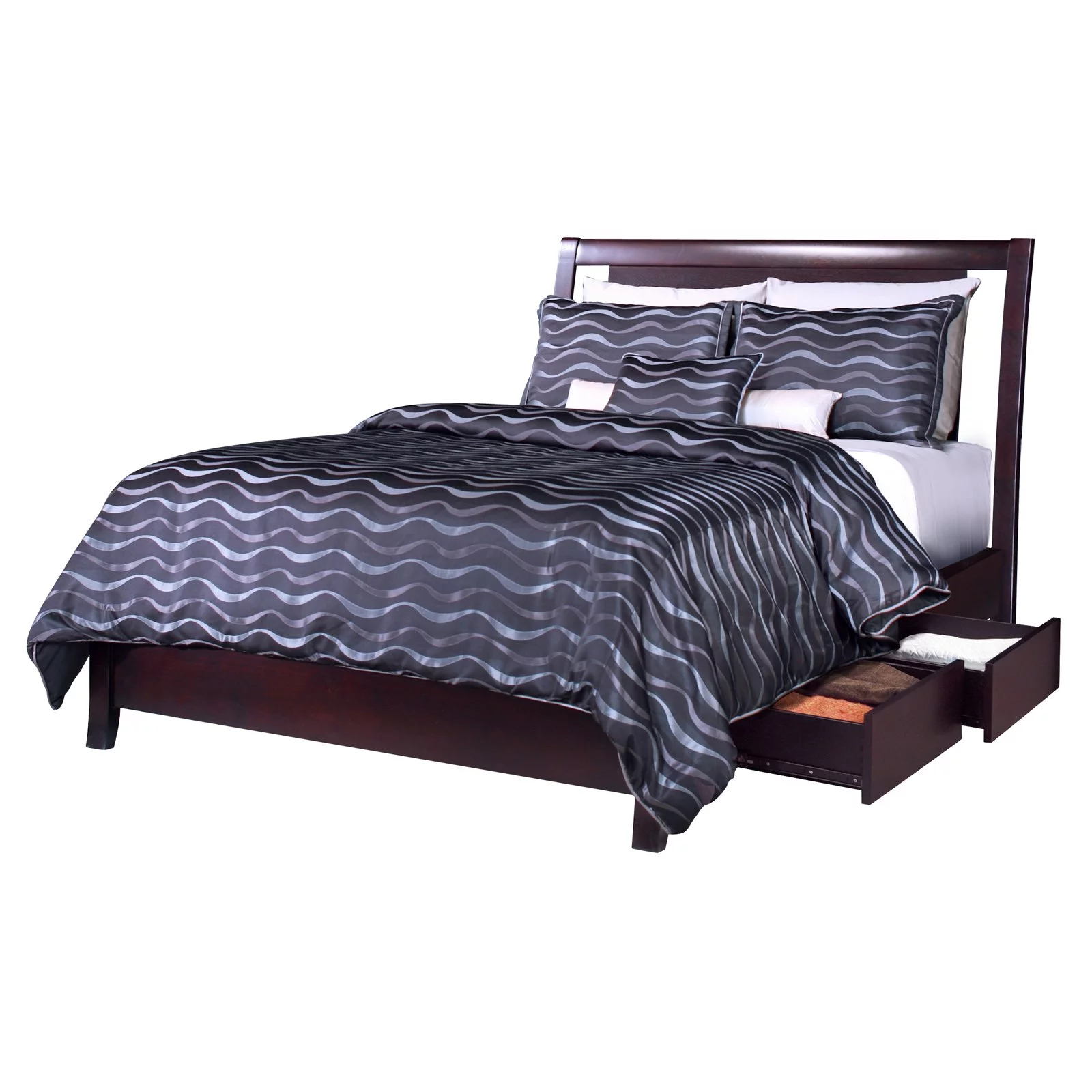 Benjara Regi Queen Bed, 2 Storage Drawers, Silver Striped Headboard, Black Wood