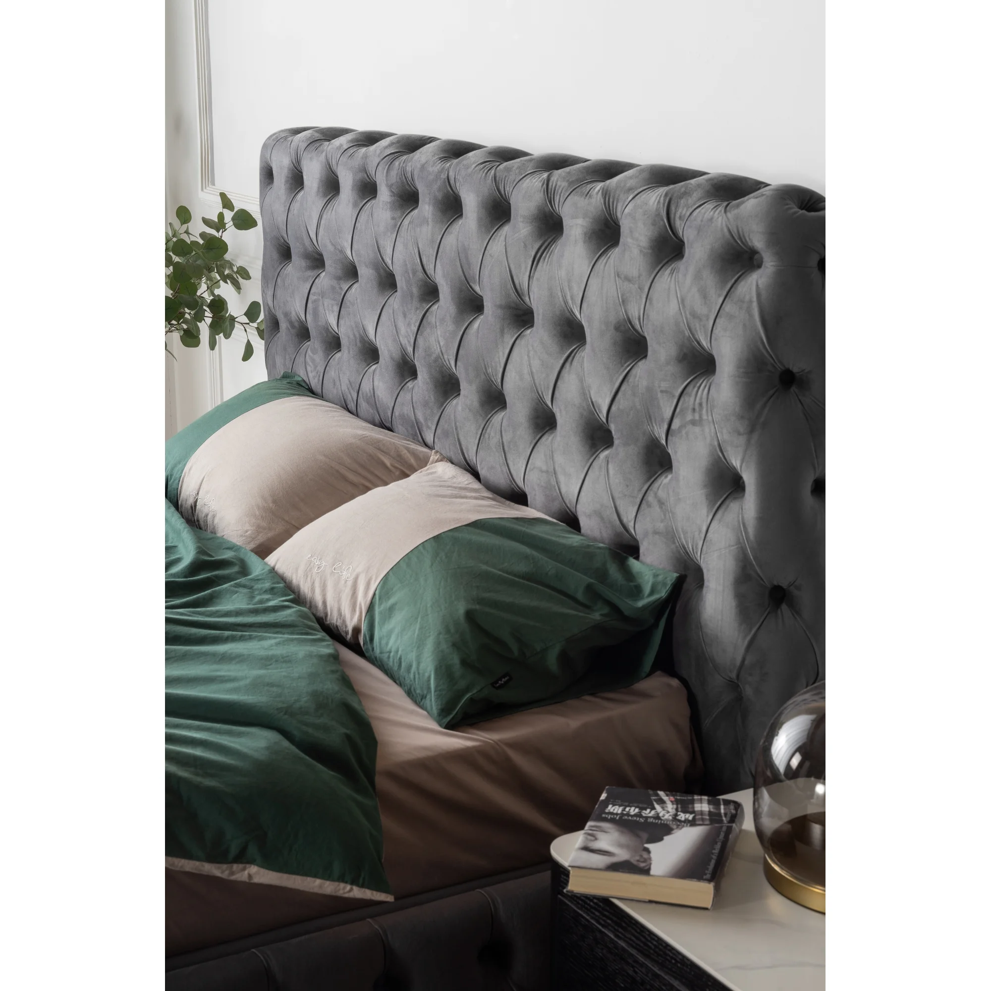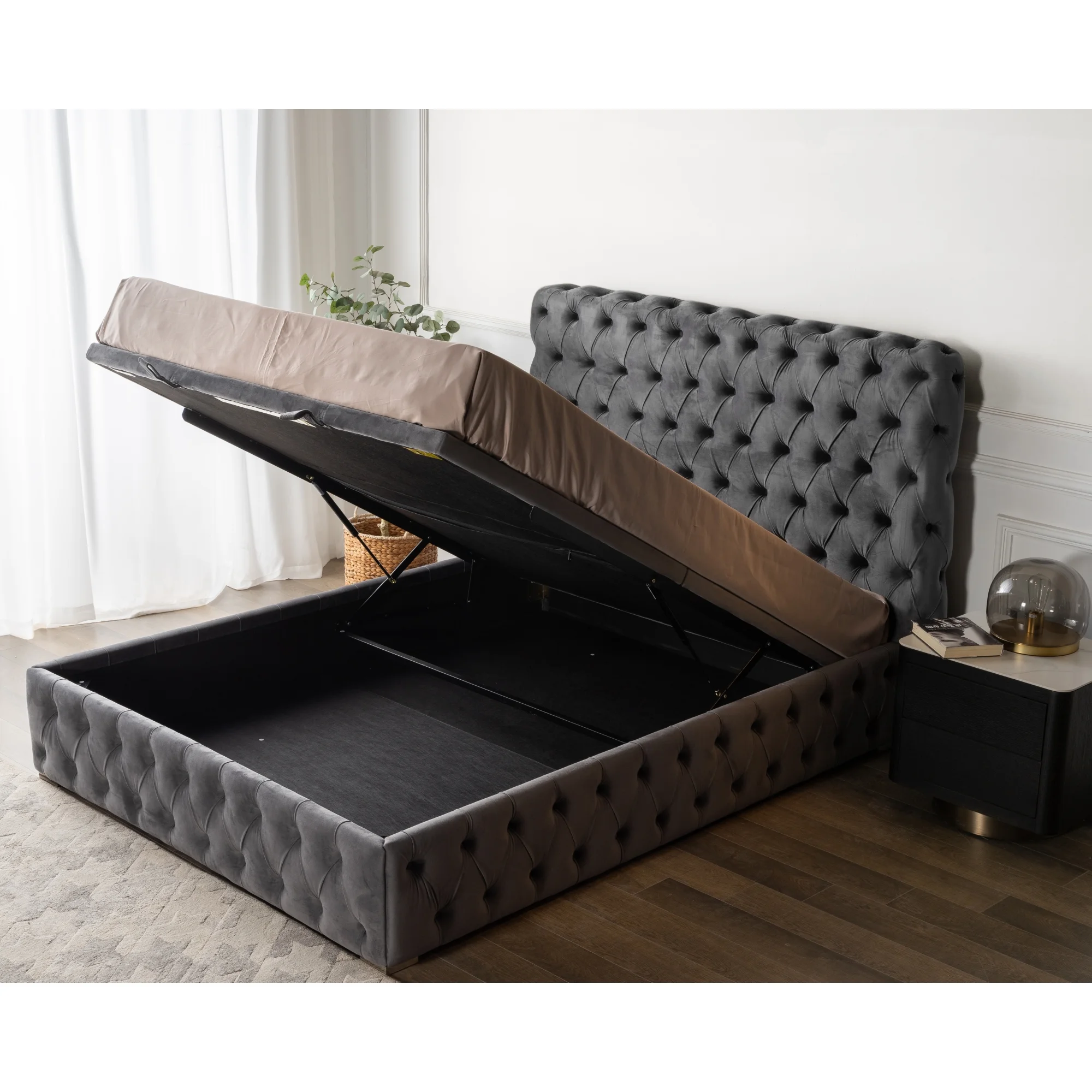 3585QUEEN BED Beautiful line stripe cushion headboard,Portable pneumatic connection rod+Grey Flannelette