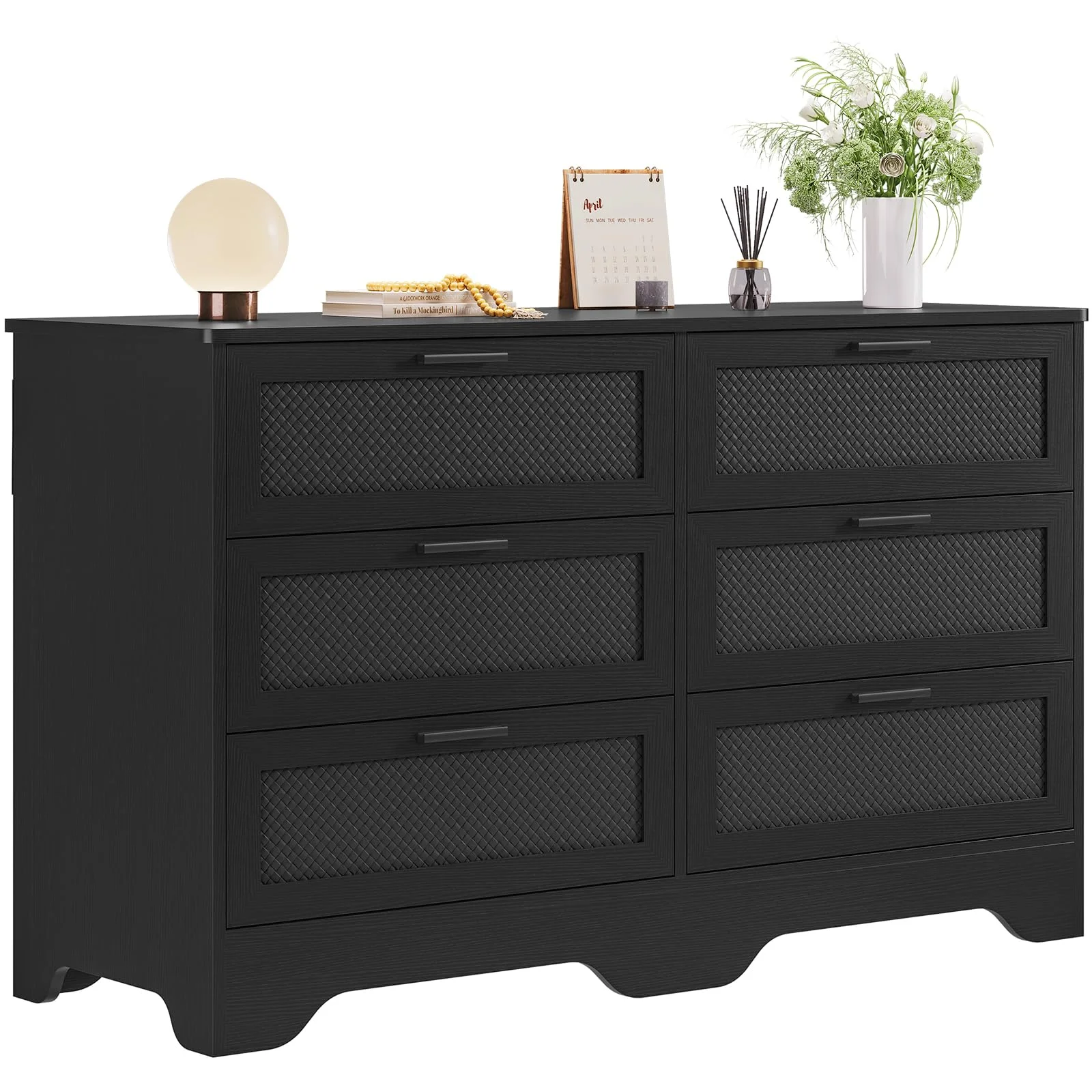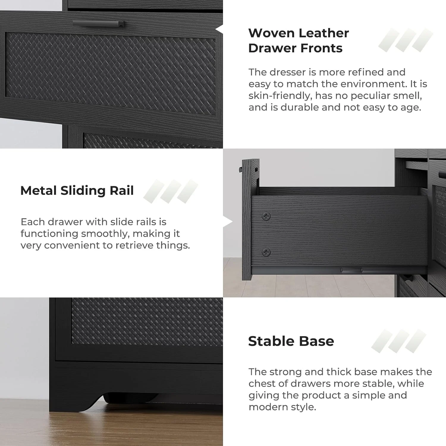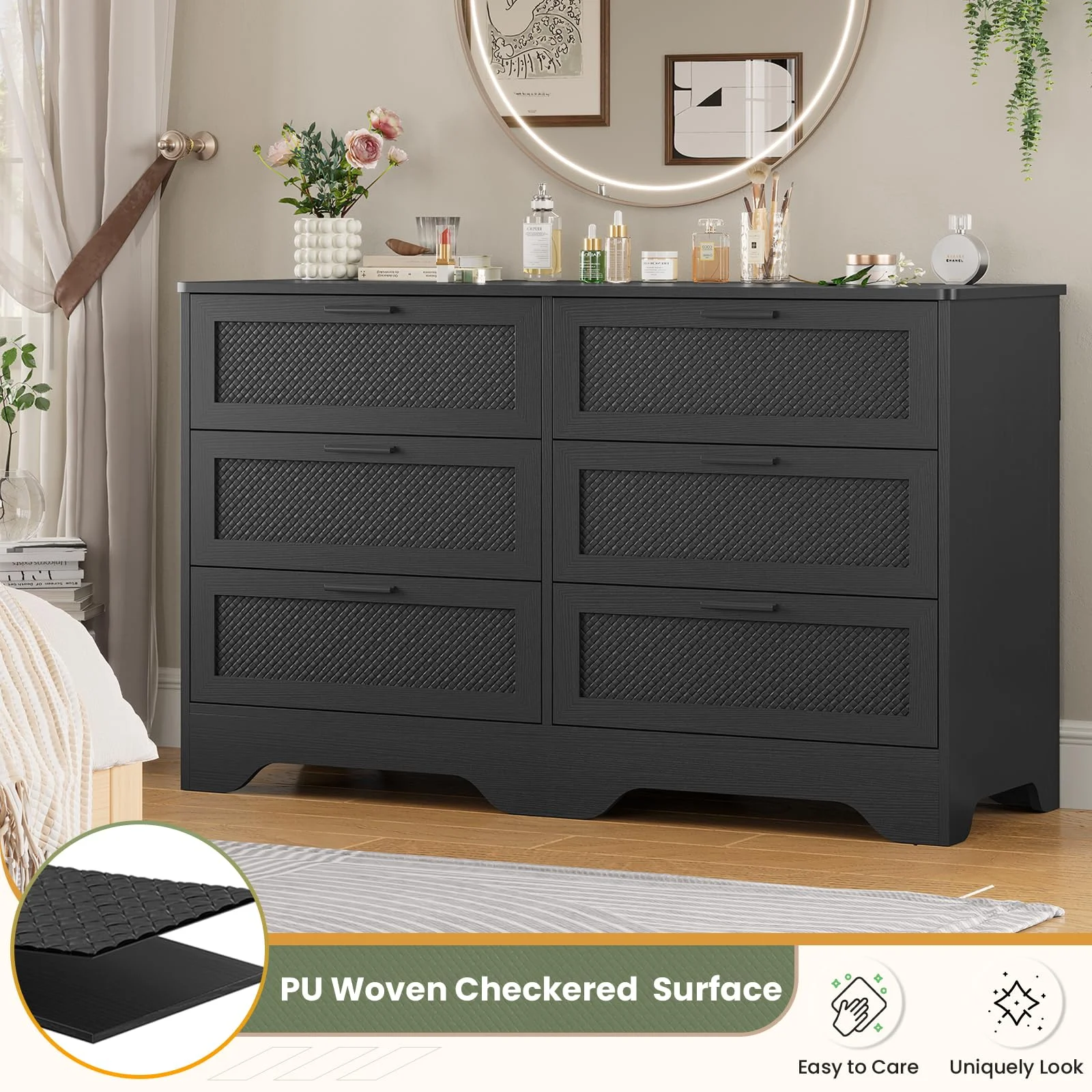 Black Chest of Drawers for Bedroom with 6 Drawers,Modern Wide Dresser with Woven Leather for Living Room Entrance