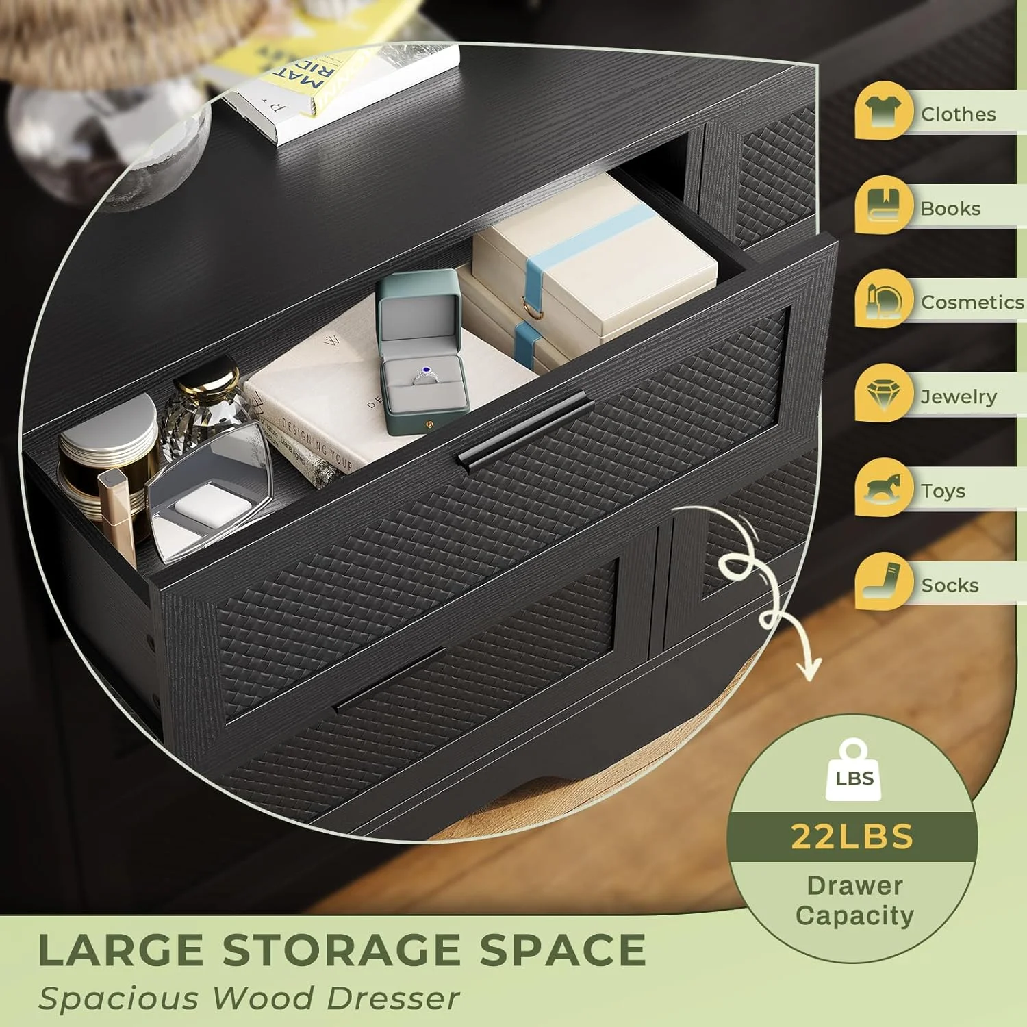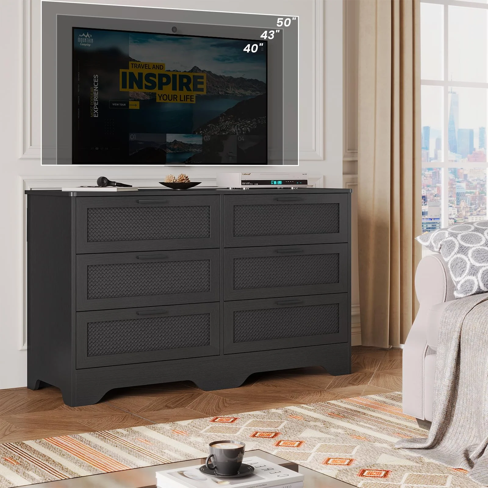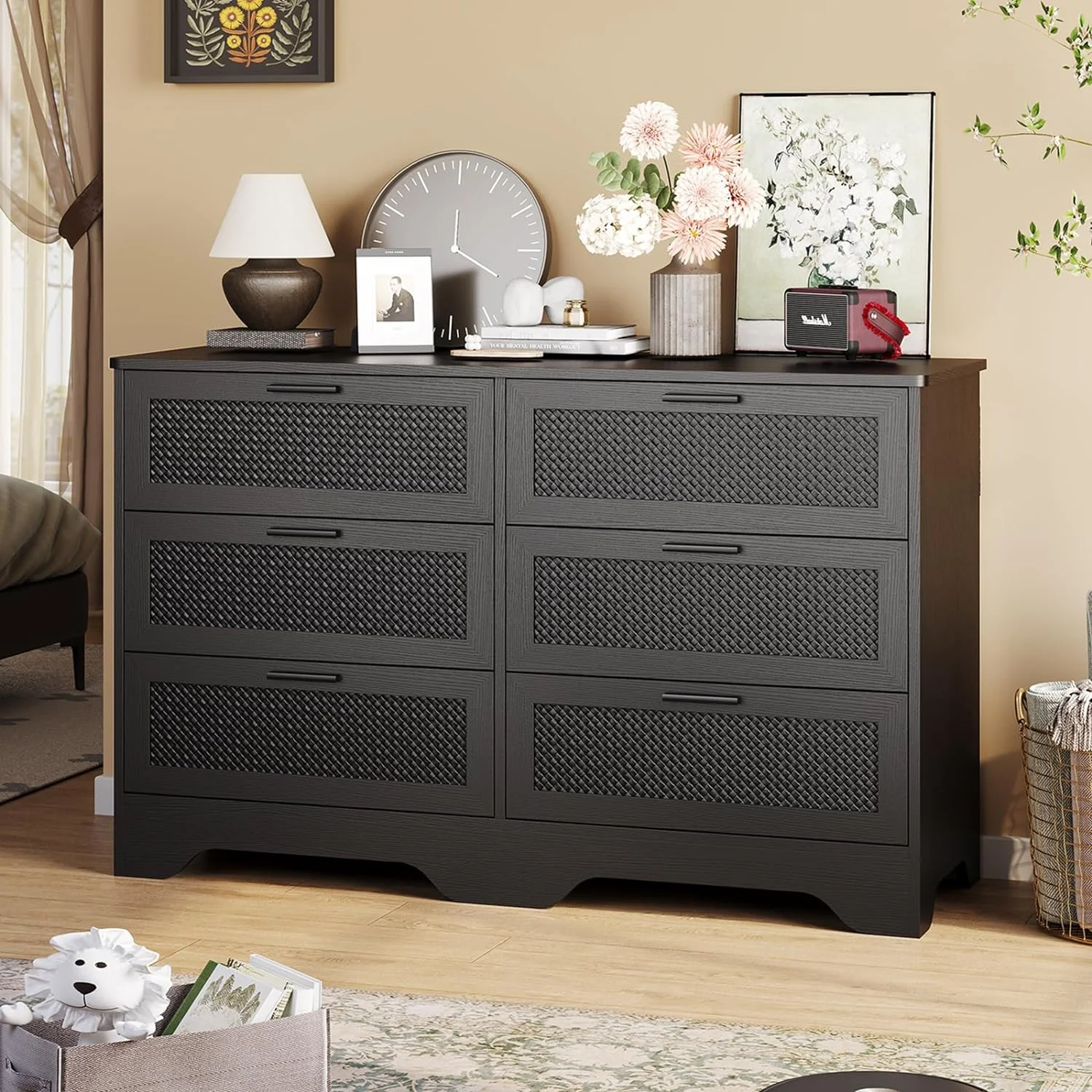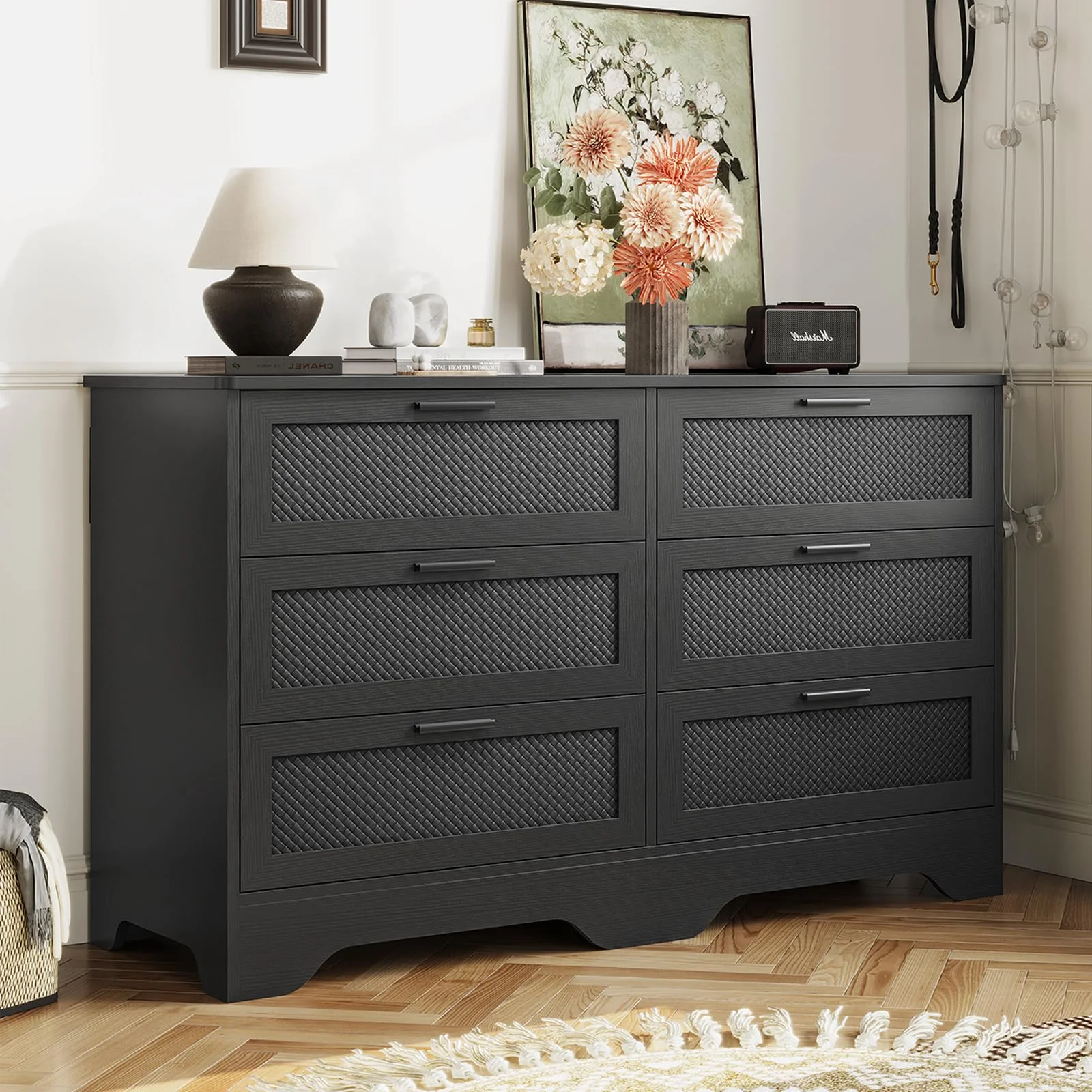 Black Chest of Drawers for Bedroom with 6 Drawers,Modern Wide Dresser with Woven Leather for Living Room Entrance