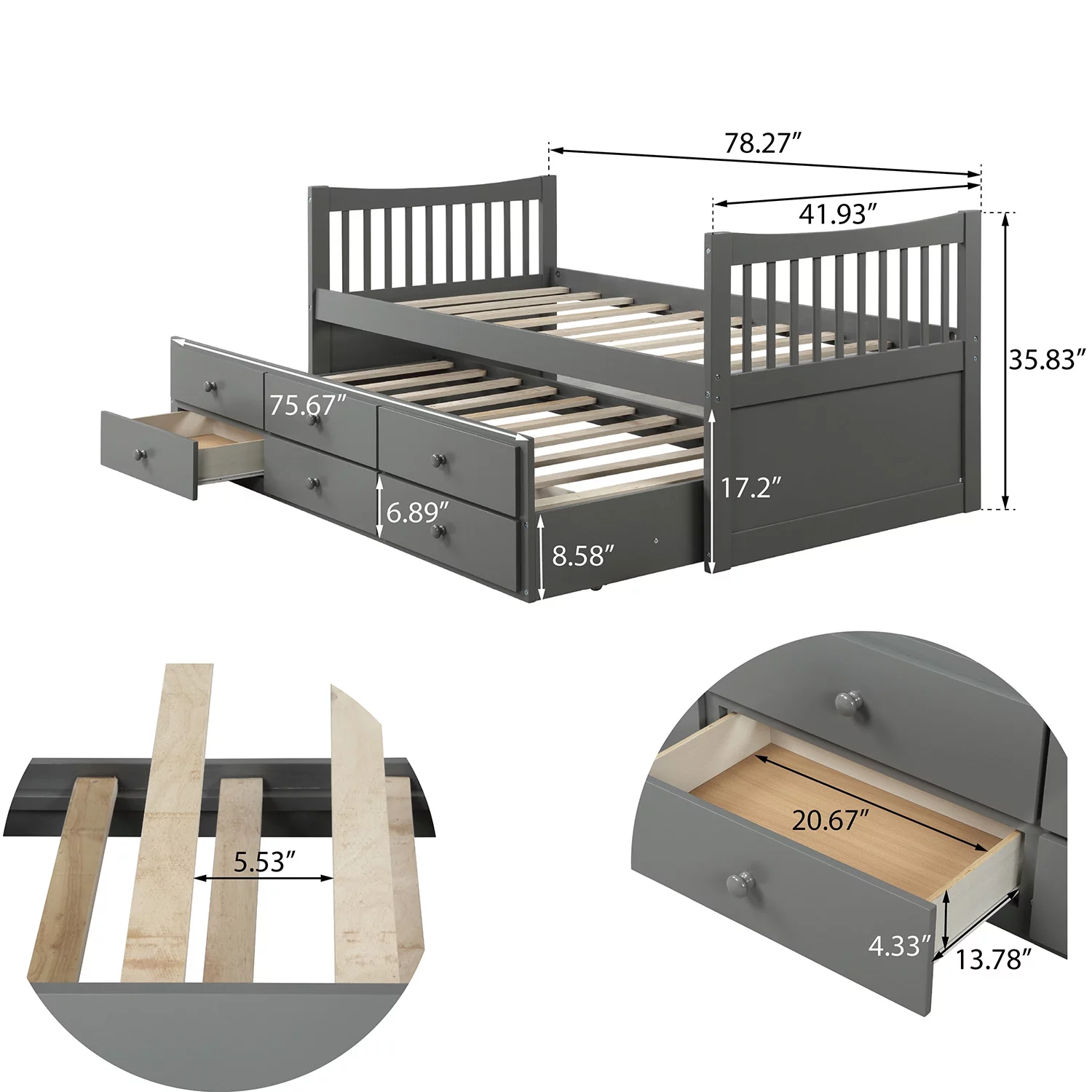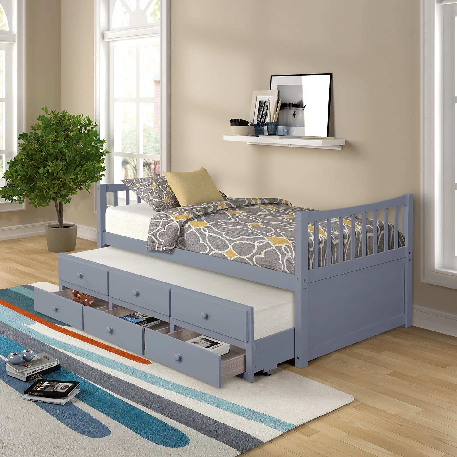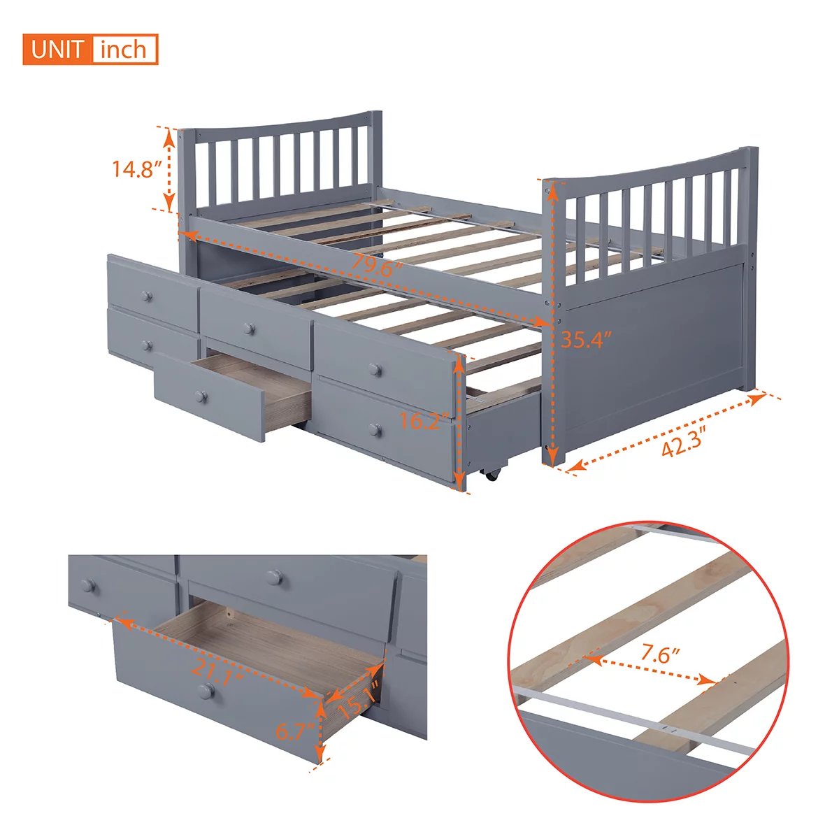 Wood Bed Captain's Bed Storage Twin Daybed with Trundle Bed and Storage Drawers Platform Bed Kids Bed