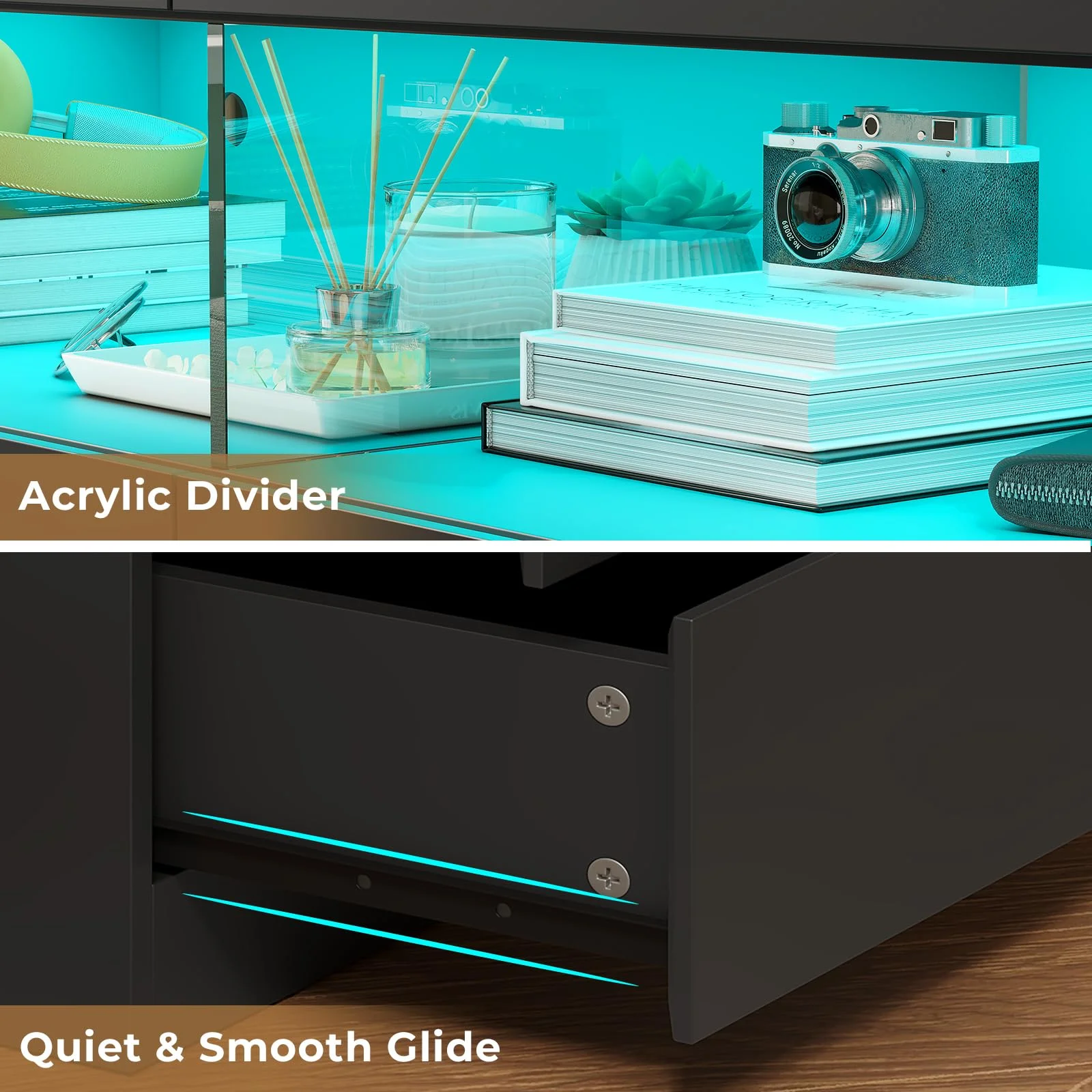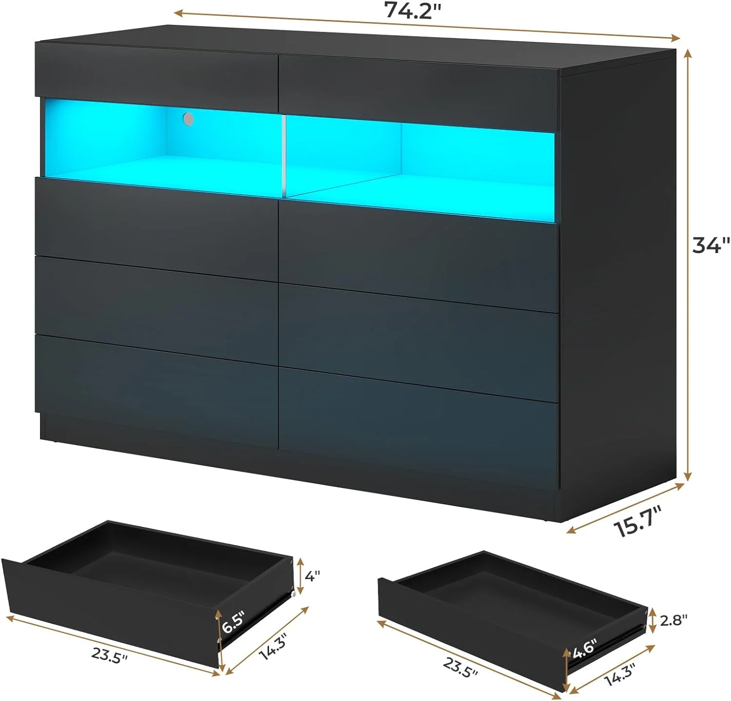 Modern 8 Drawers Wide Dresser with LED Light for Bedroom Living Room,No-Handle Chest of Drawers,Open Storage Space,Black