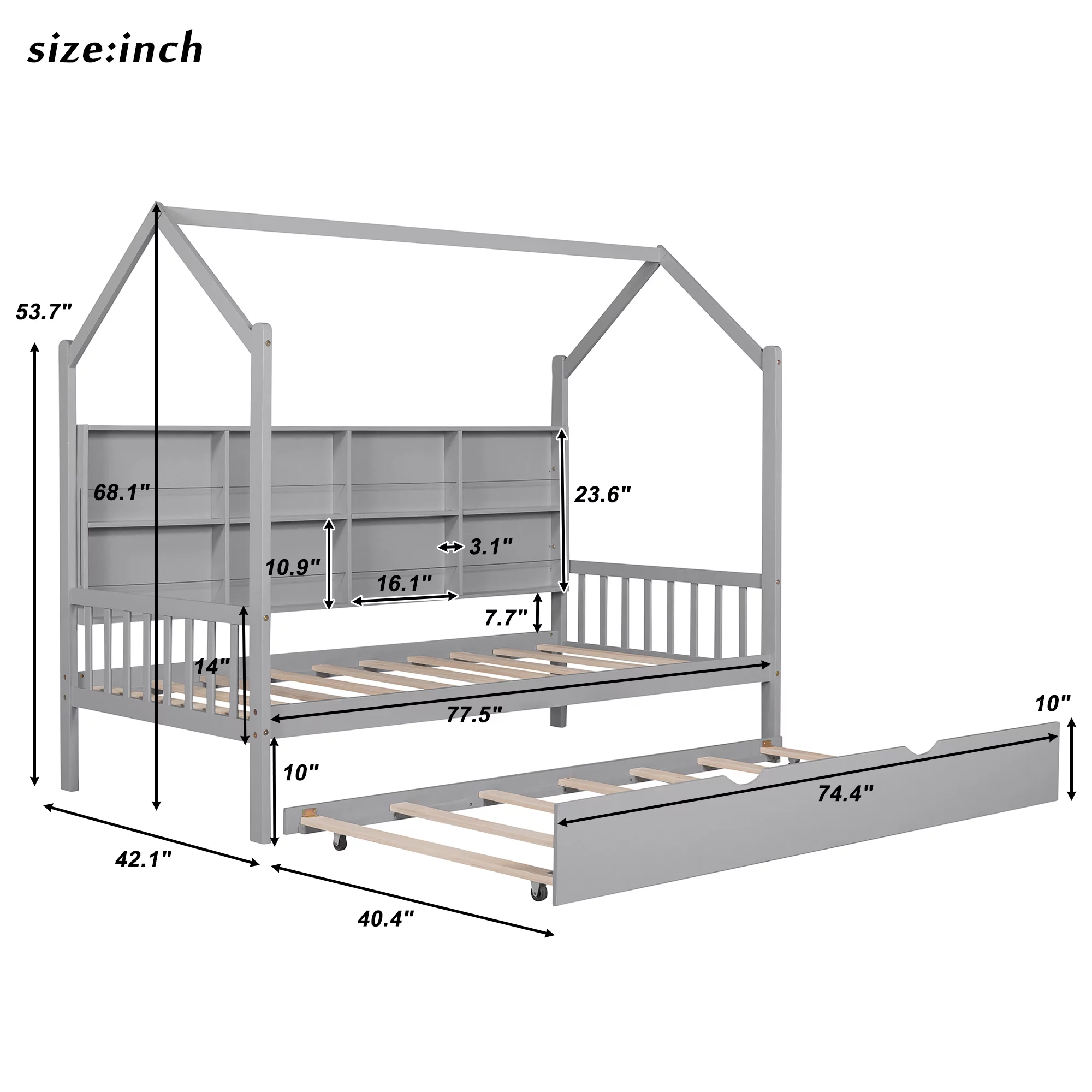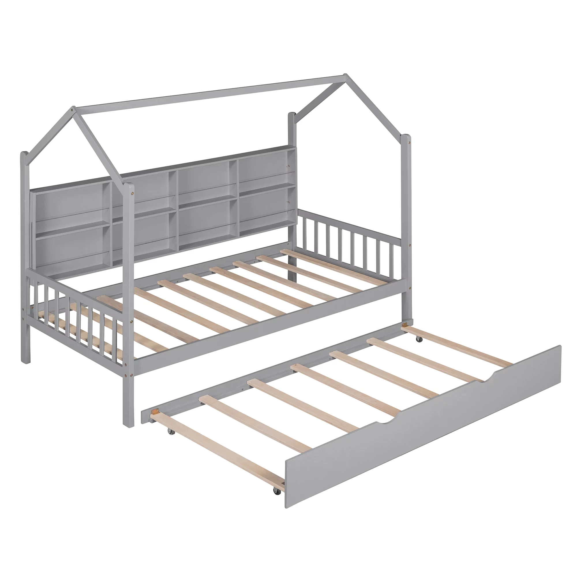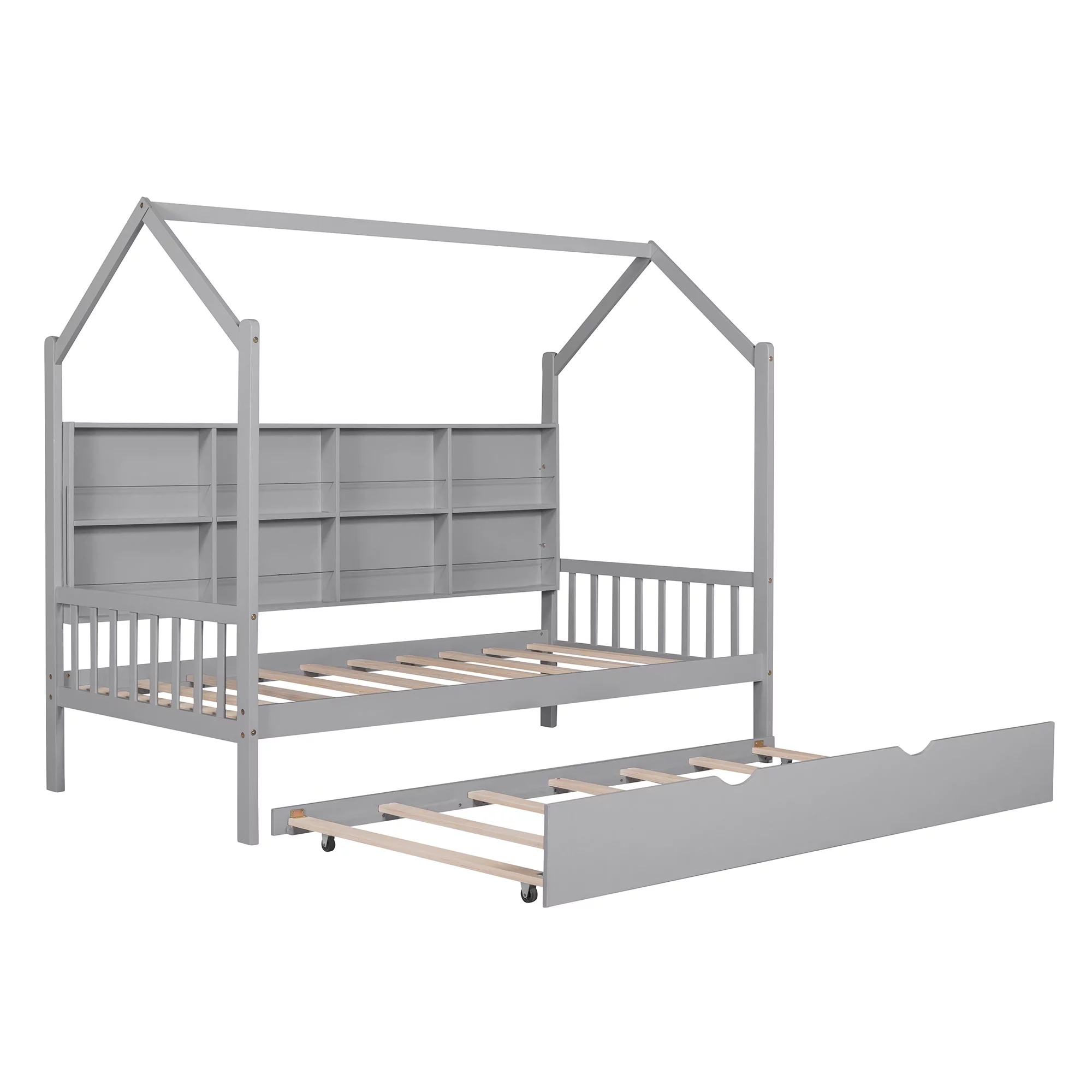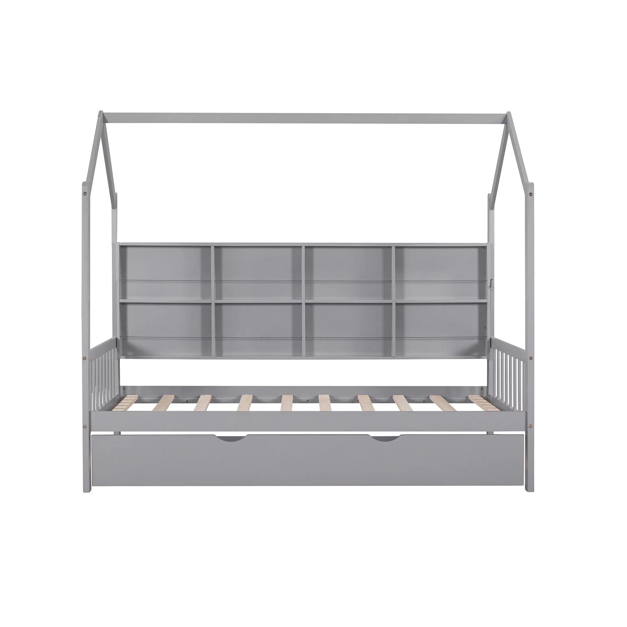 Gewnee Twin House Bed with Trundle and Storage Shelves, Wood Playhouse Bed with Roof for Kids,Gray