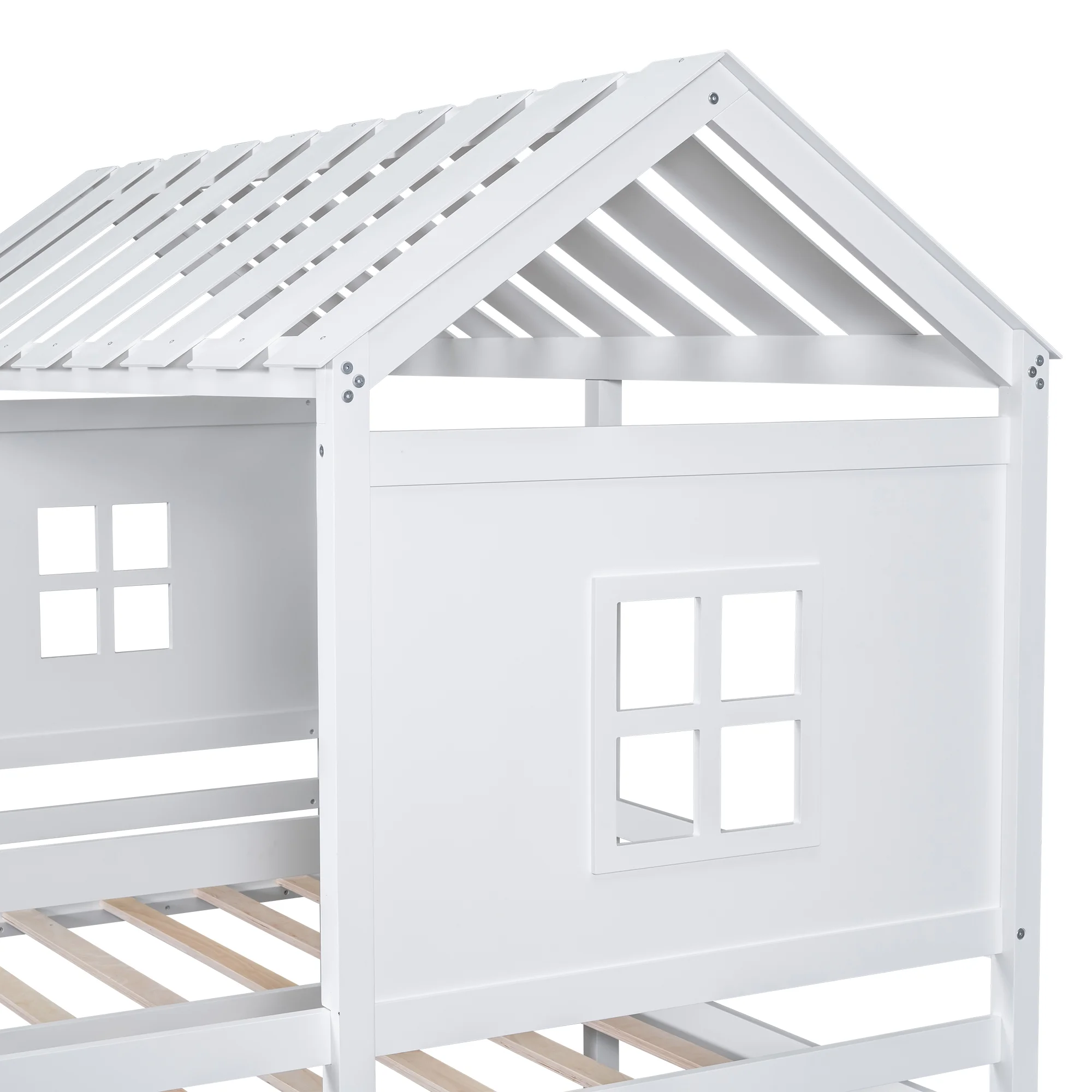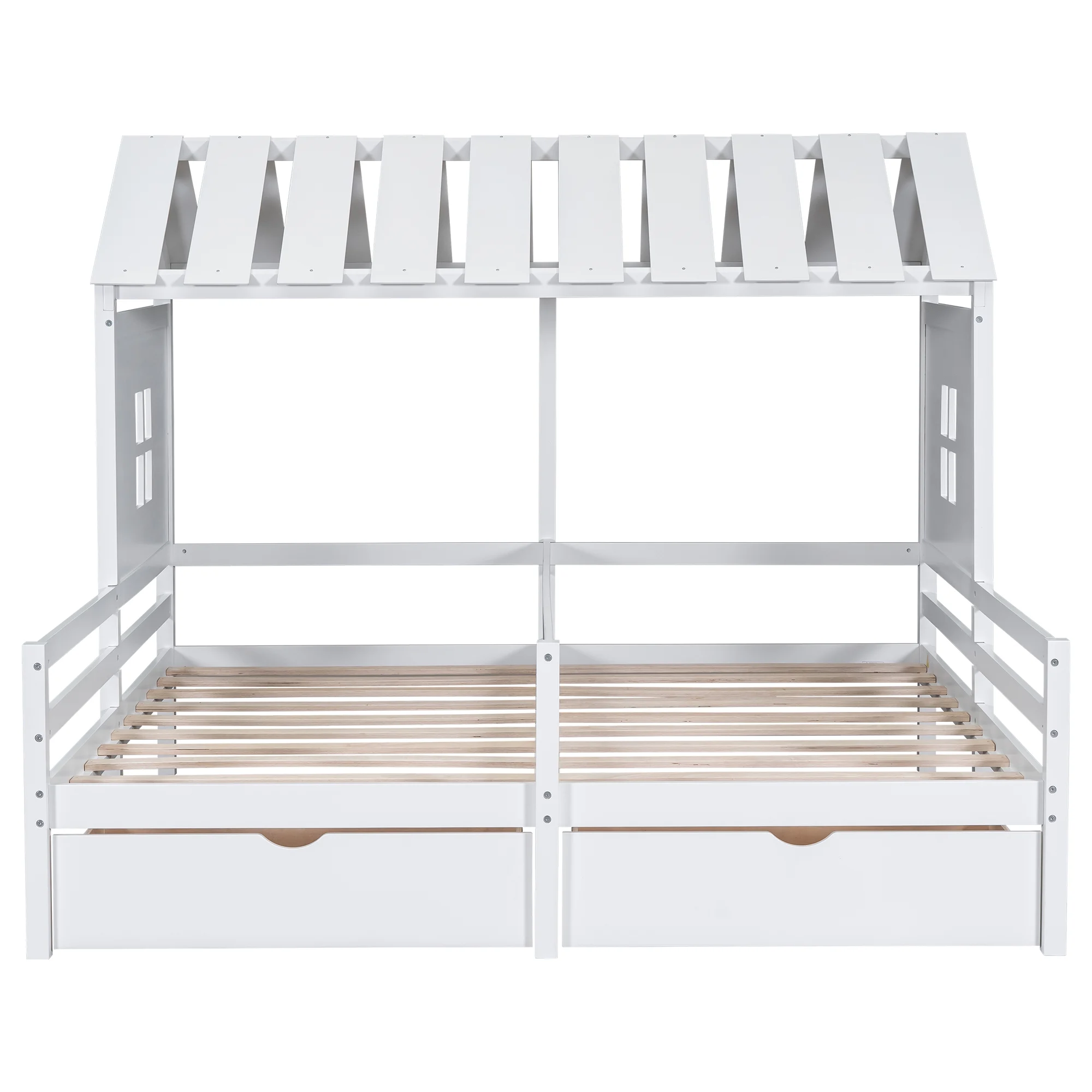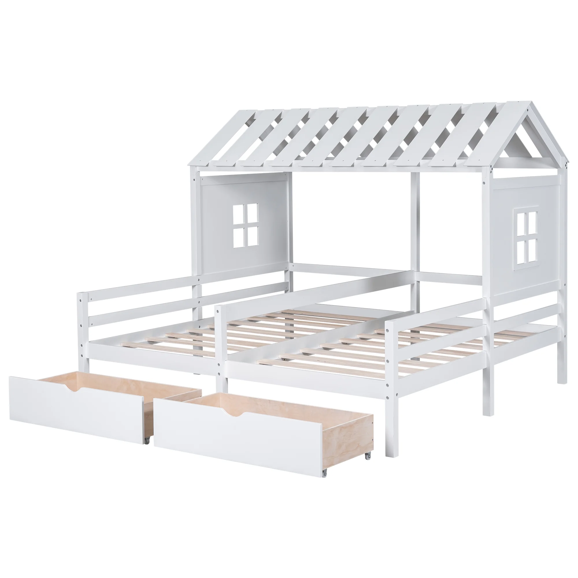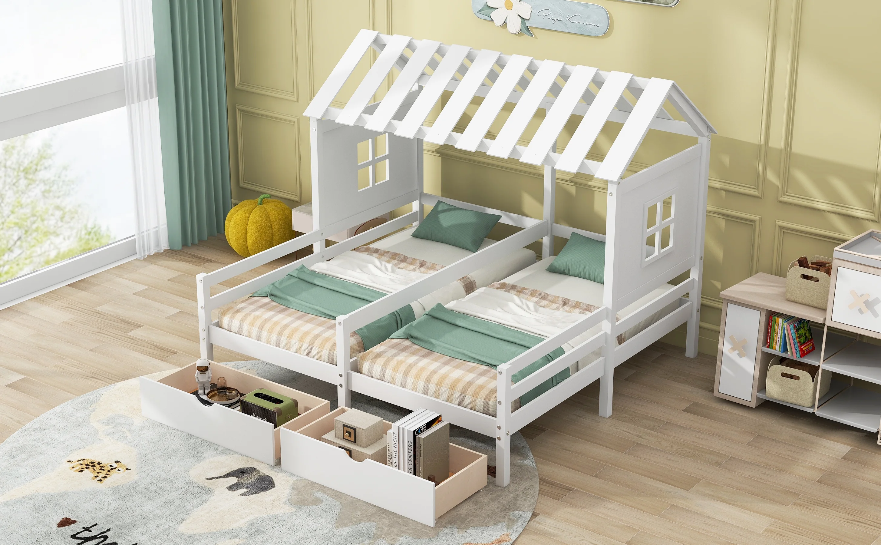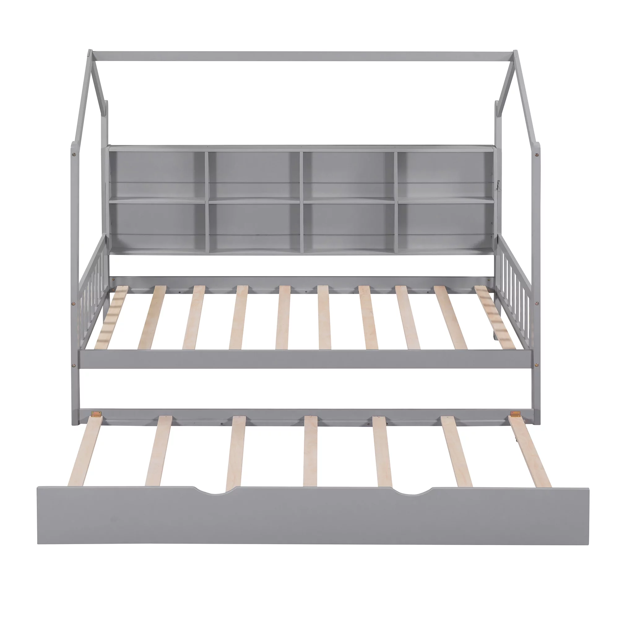 Gewnee Twin House Bed with Trundle and Storage Shelves, Wood Playhouse Bed with Roof for Kids,Gray