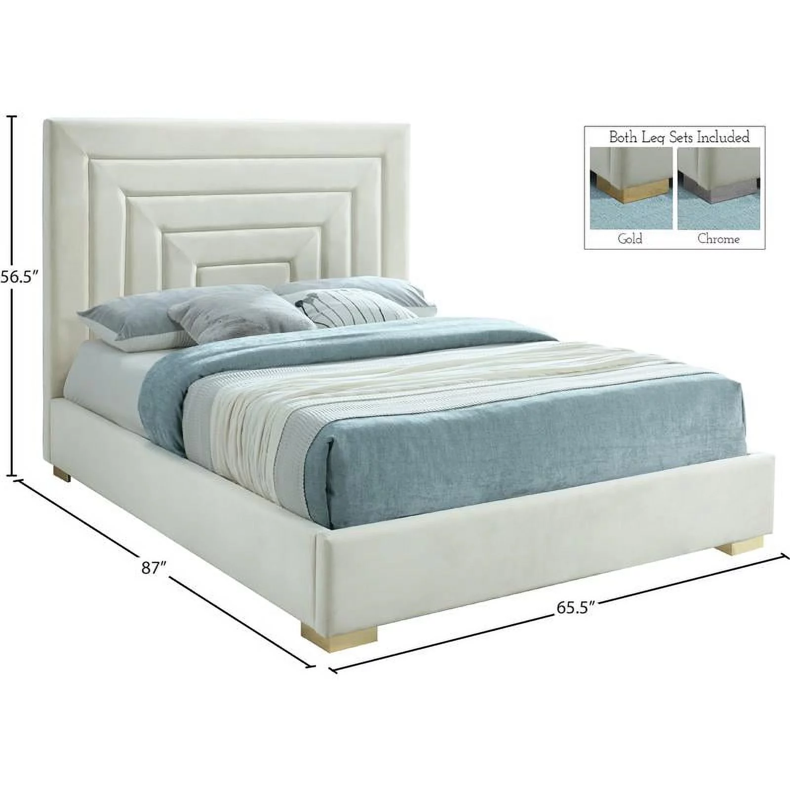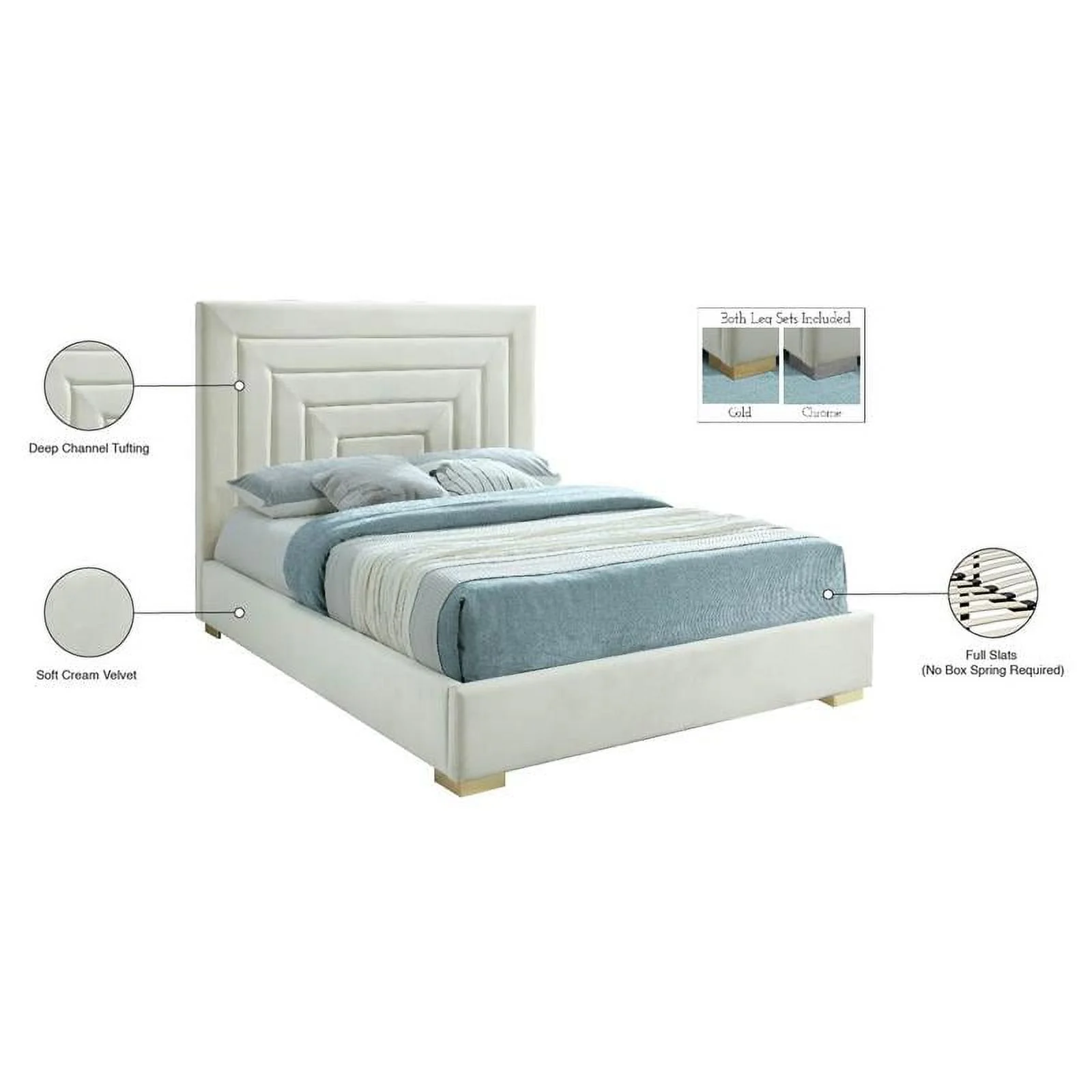 Meridian Furniture Nora Cream Velvet Queen Bed with Gold/Chrome Legs Included