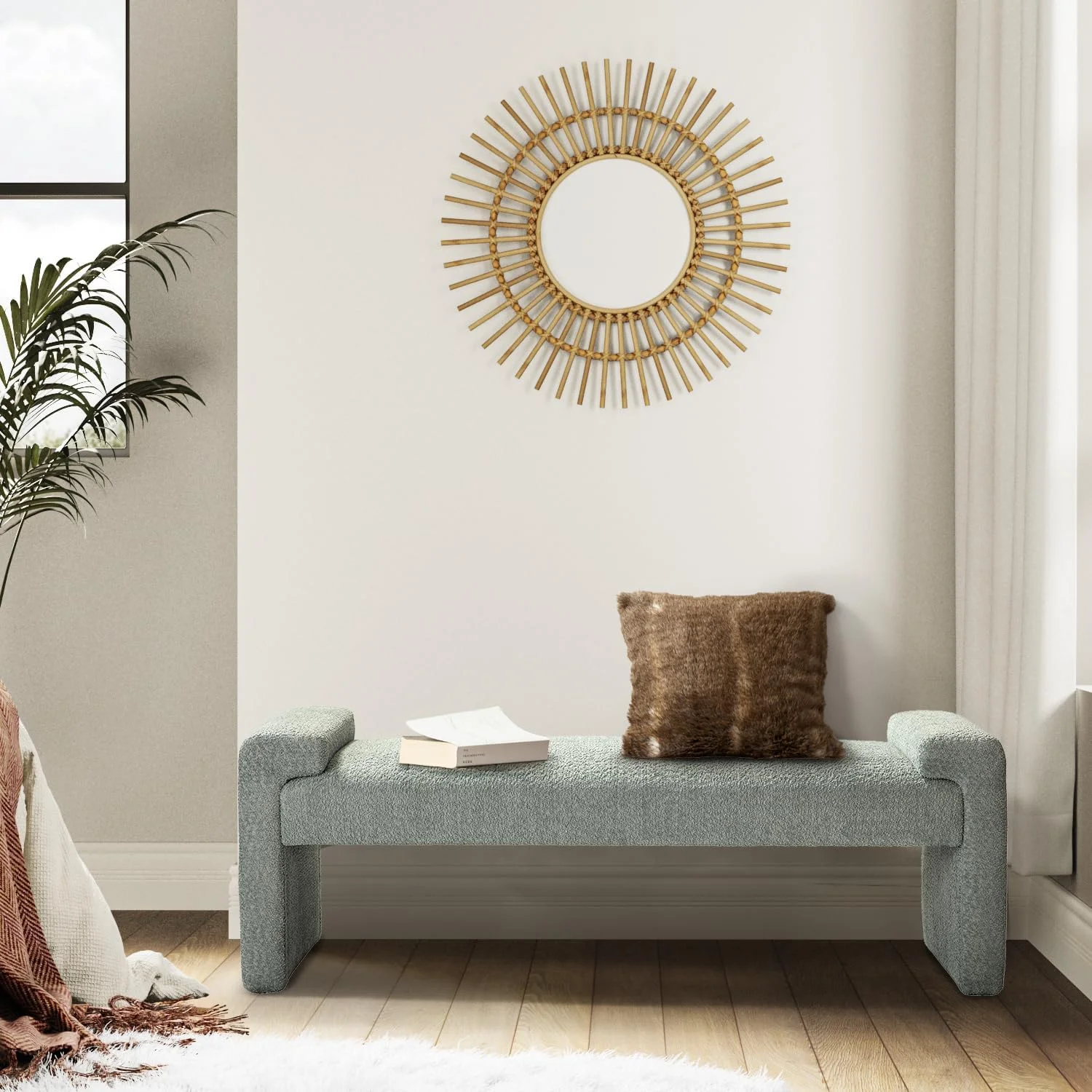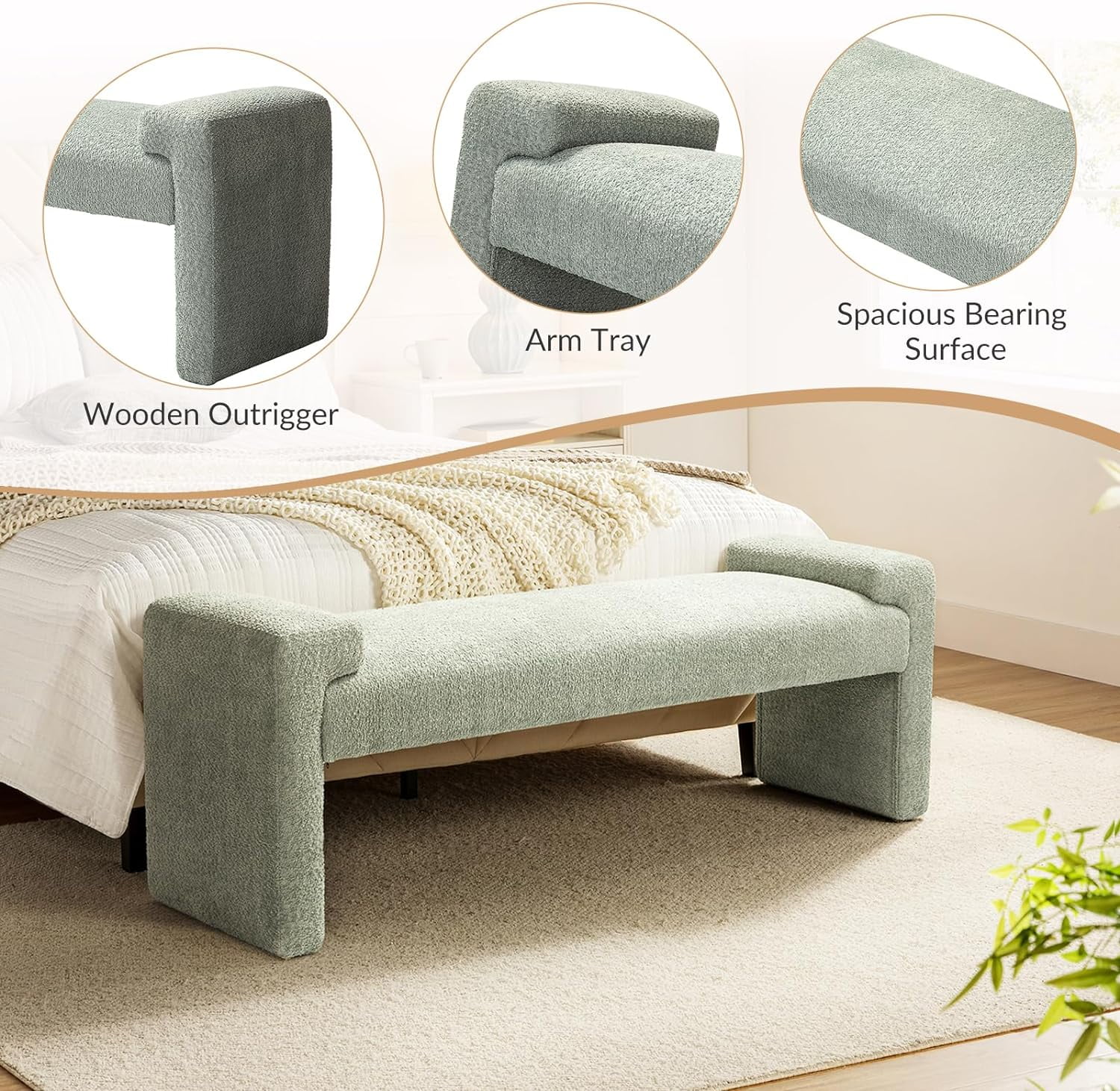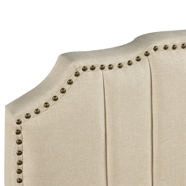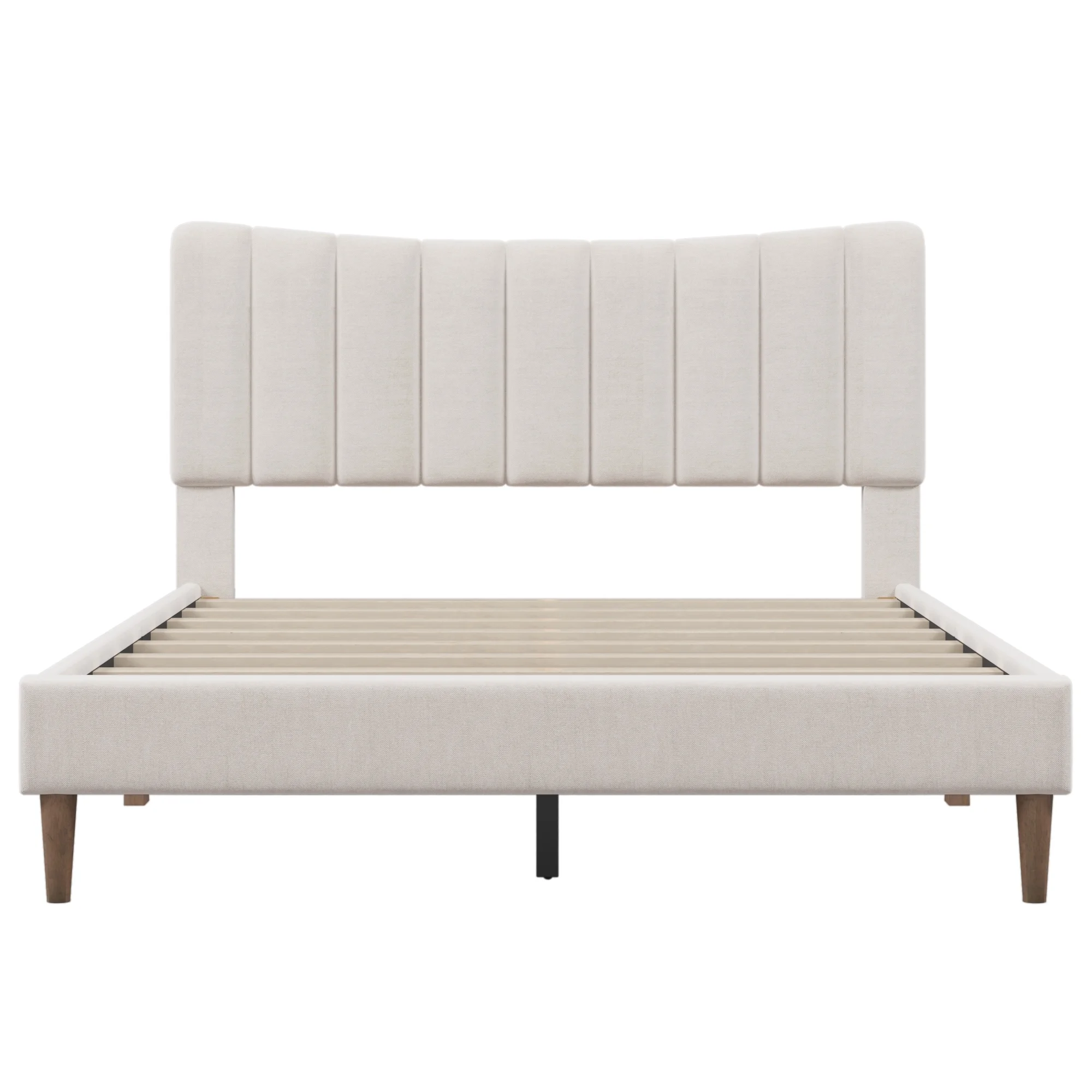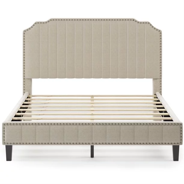 LANTRO JS Modern Linen Curved Upholstered Platform Bed, Solid Wood Frame, Nailhead Trim, Cream (Queen)