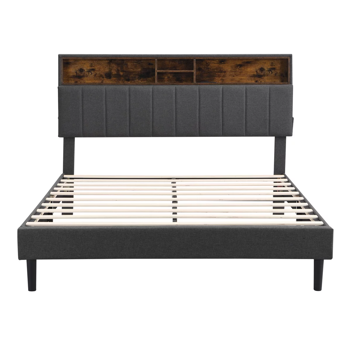 Full Size Upholstered Platform Bed with Storage Headboard and USB Port, Linen Fabric Upholstered Bed (Gray)
