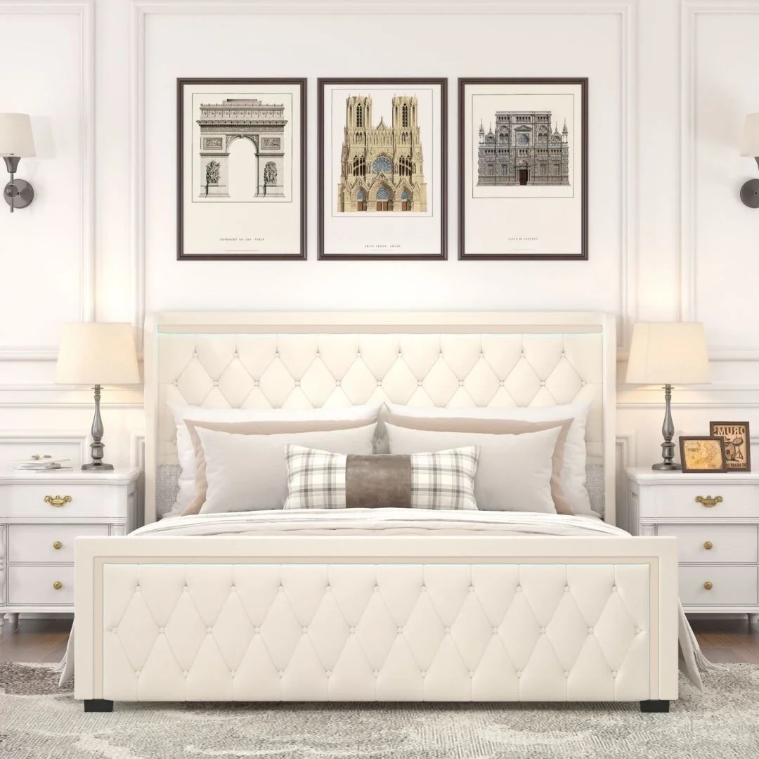 Queen Velvet Upholstered Bed With Tufted Buttons and LED Light Decorative Headboard Beige