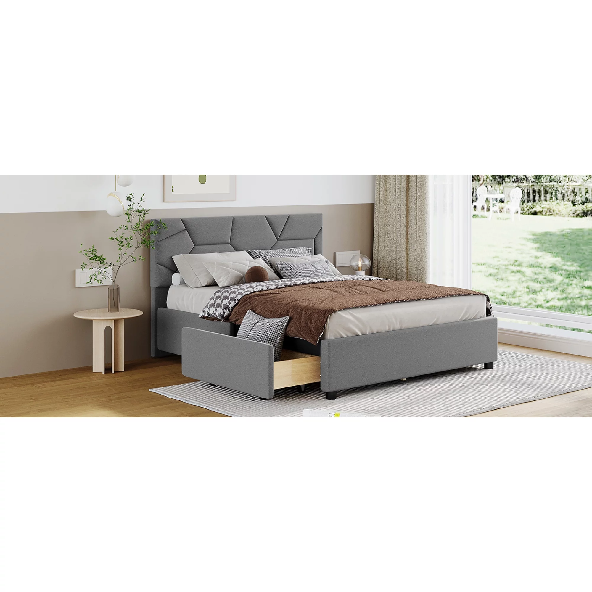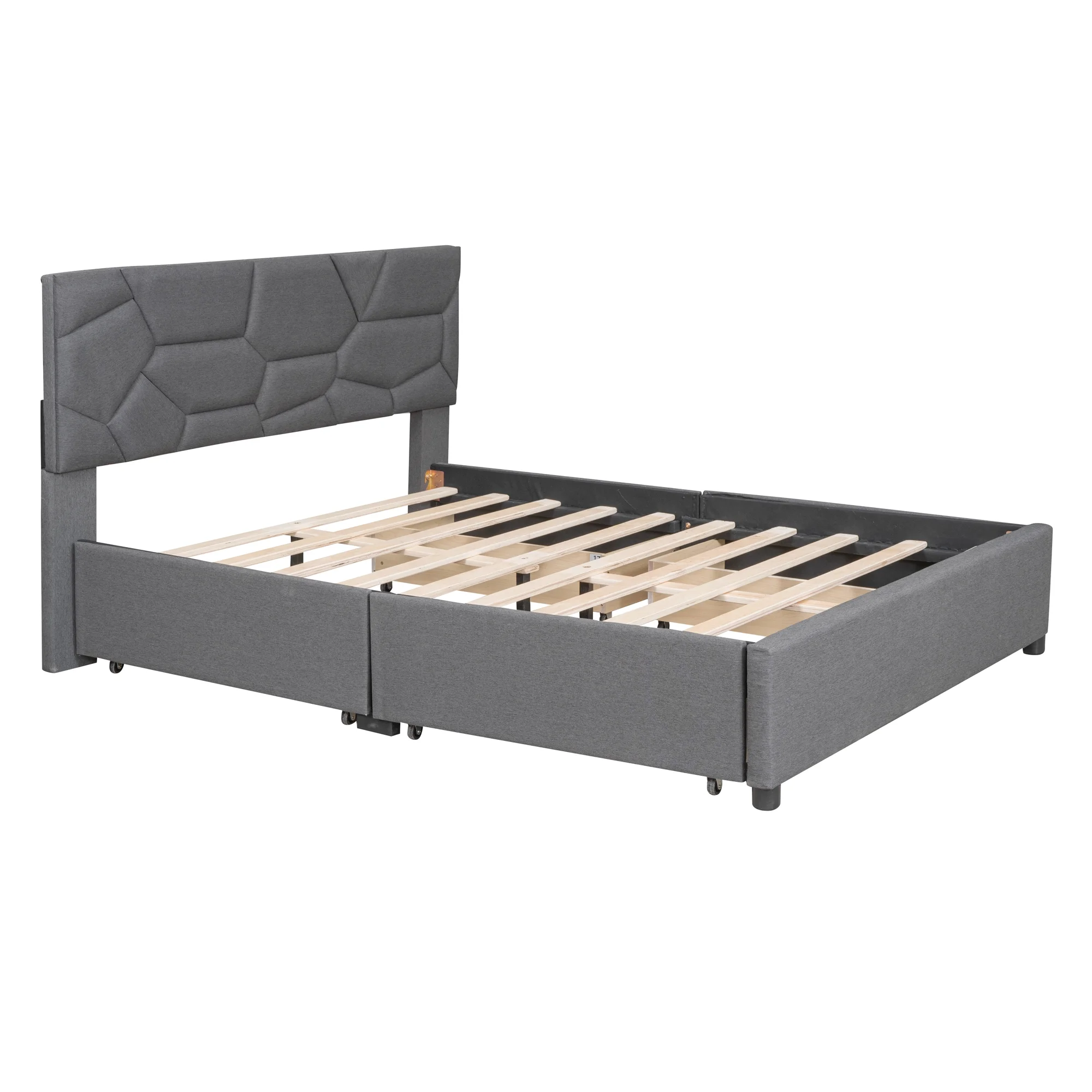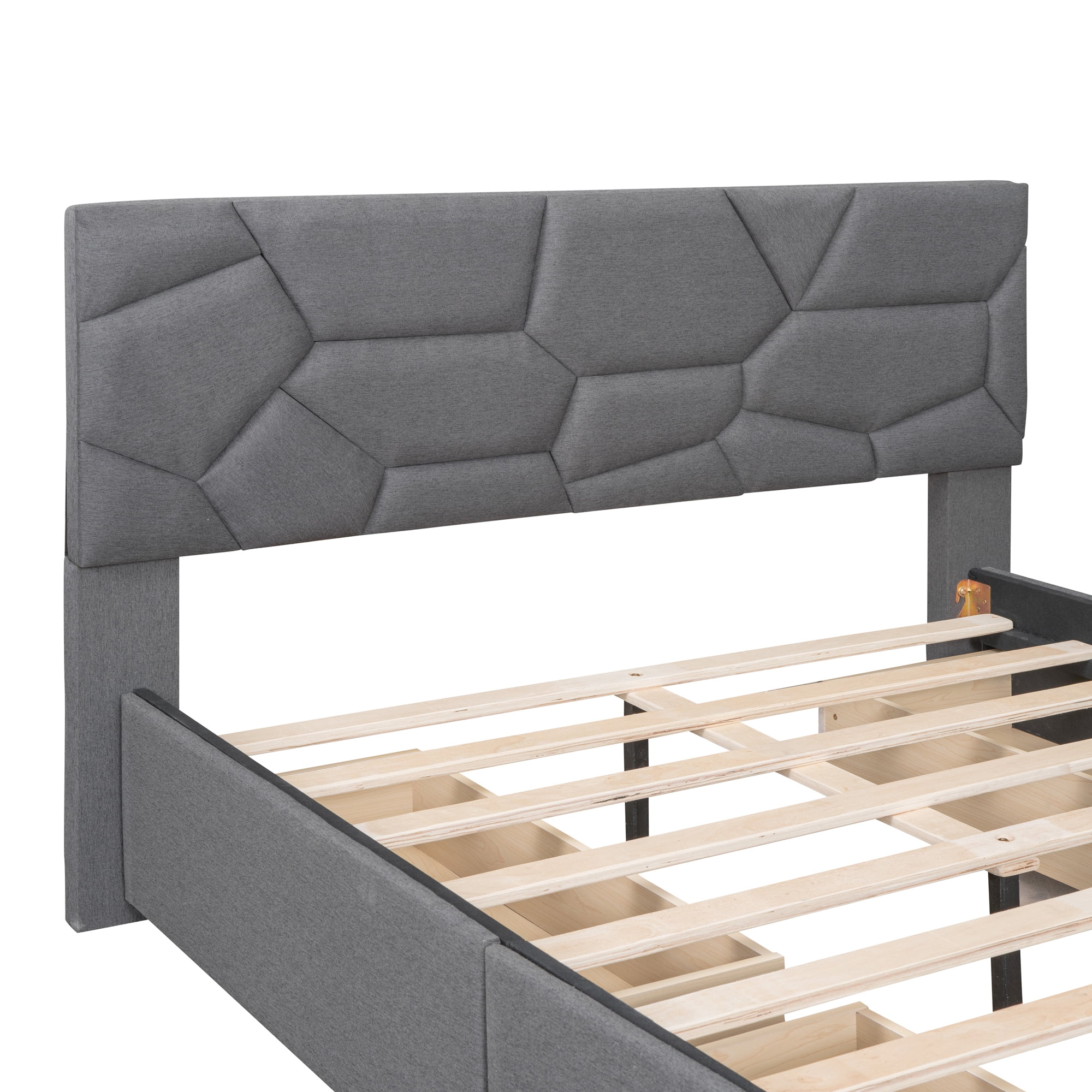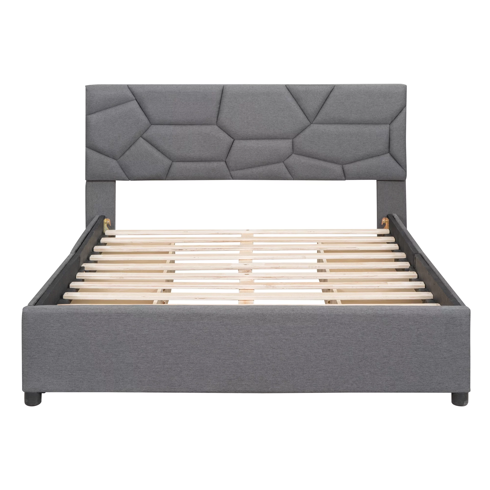 Dawn Whisper Full Size Upholstered Platform Bed with Brick Pattern Headboard and 4 Drawers, Linen Fabric, Gray