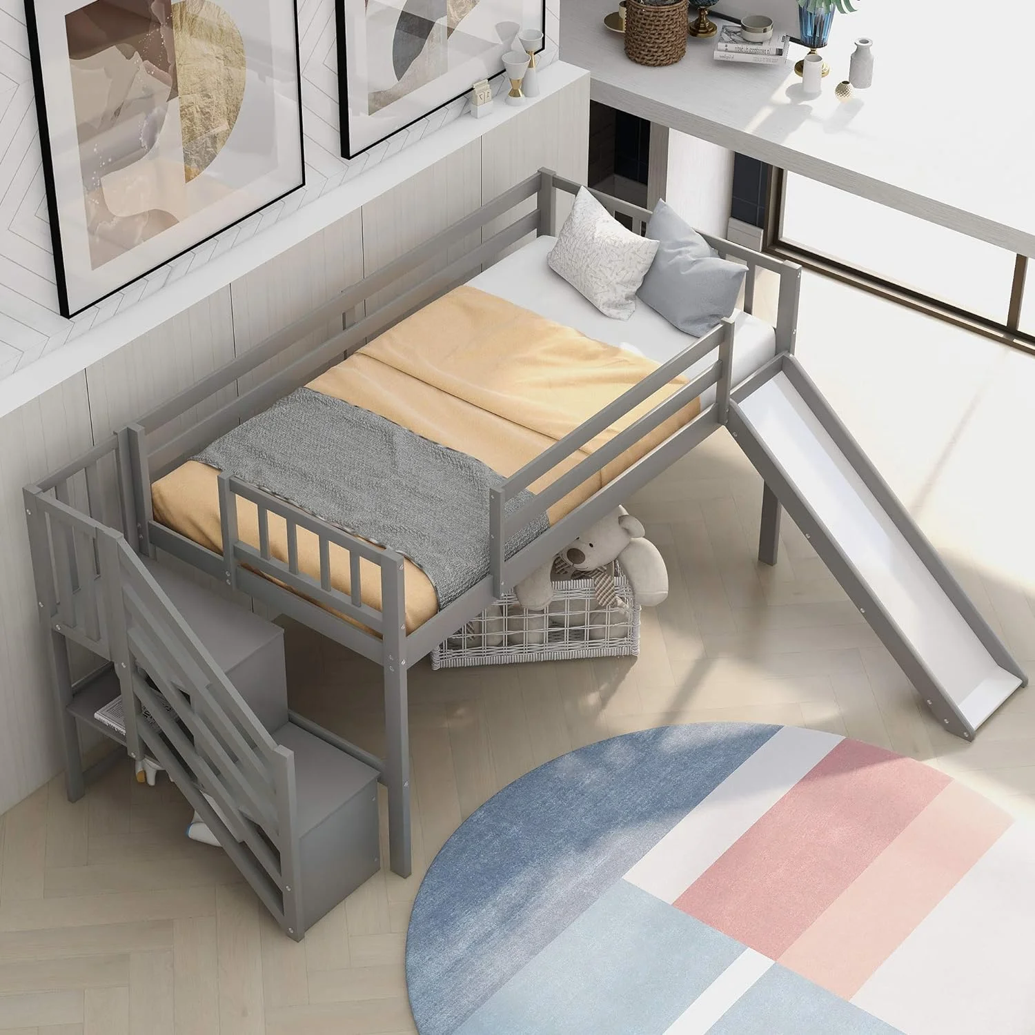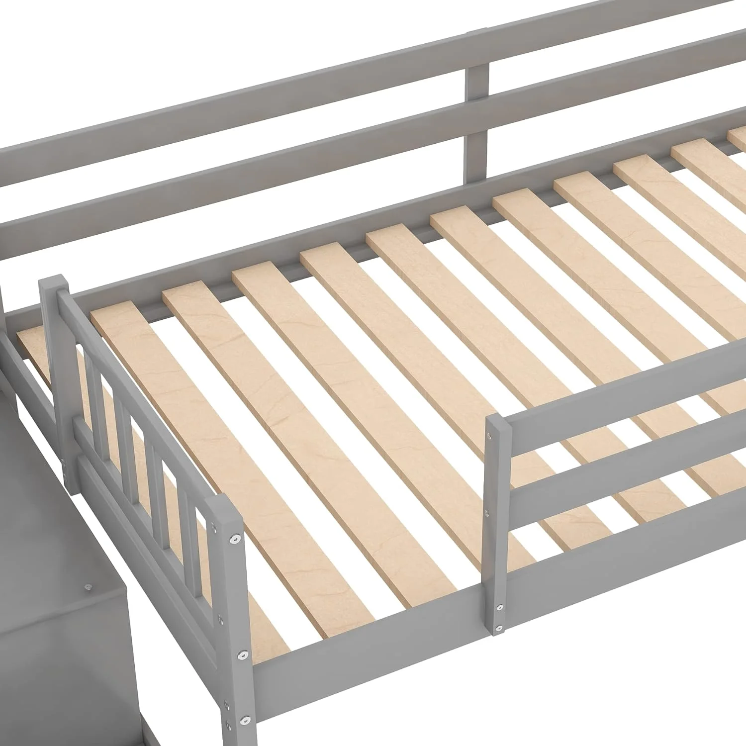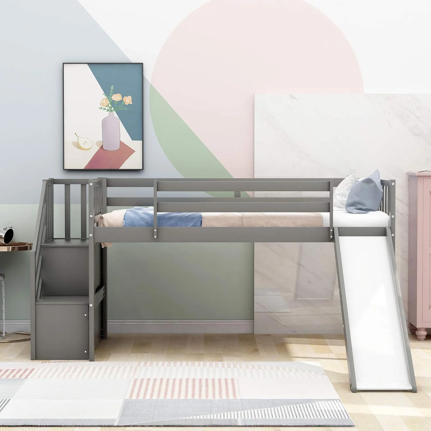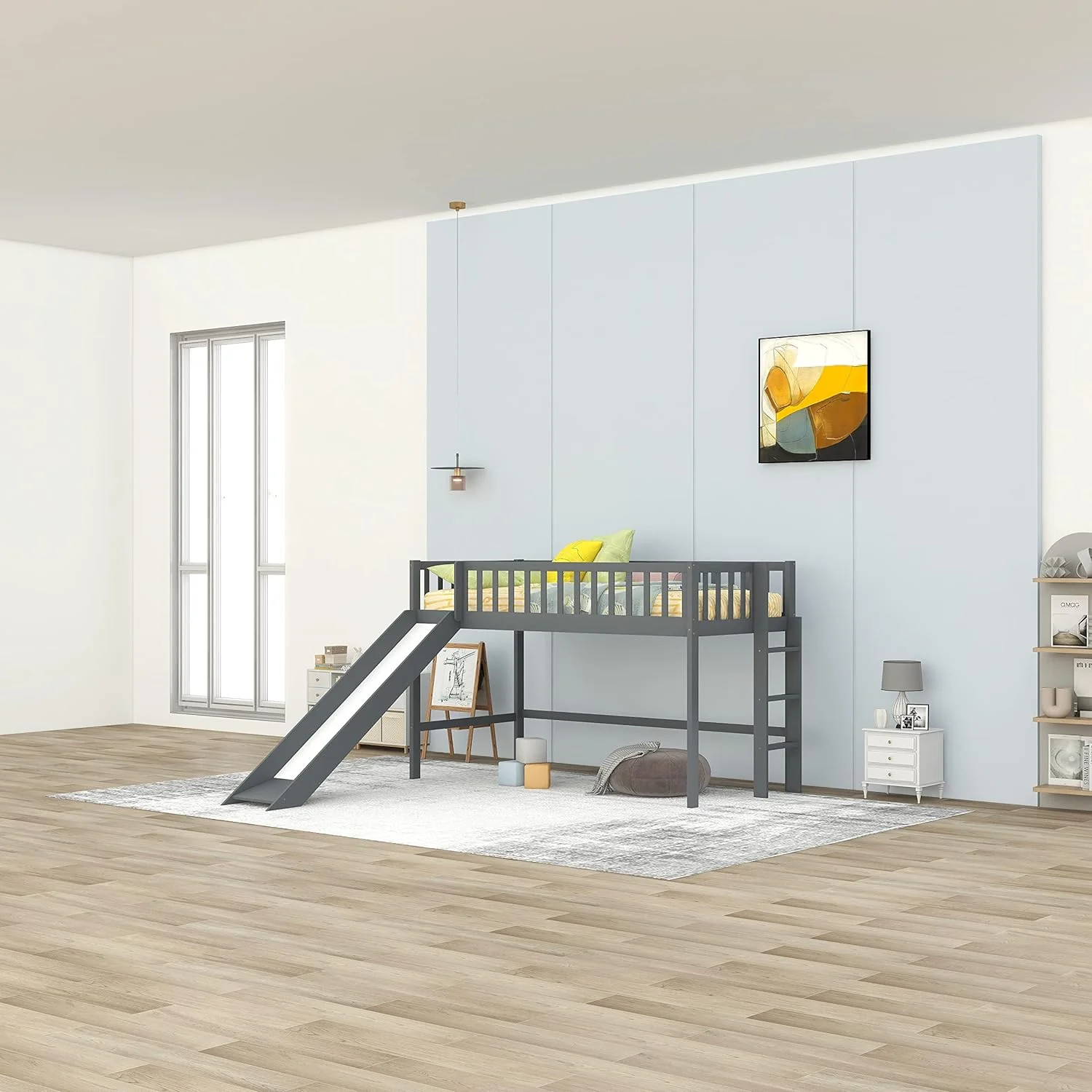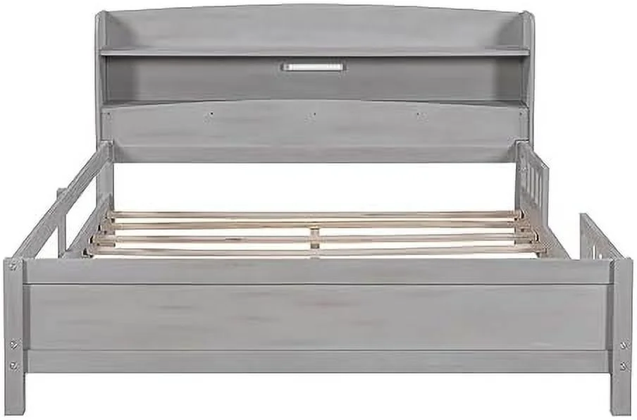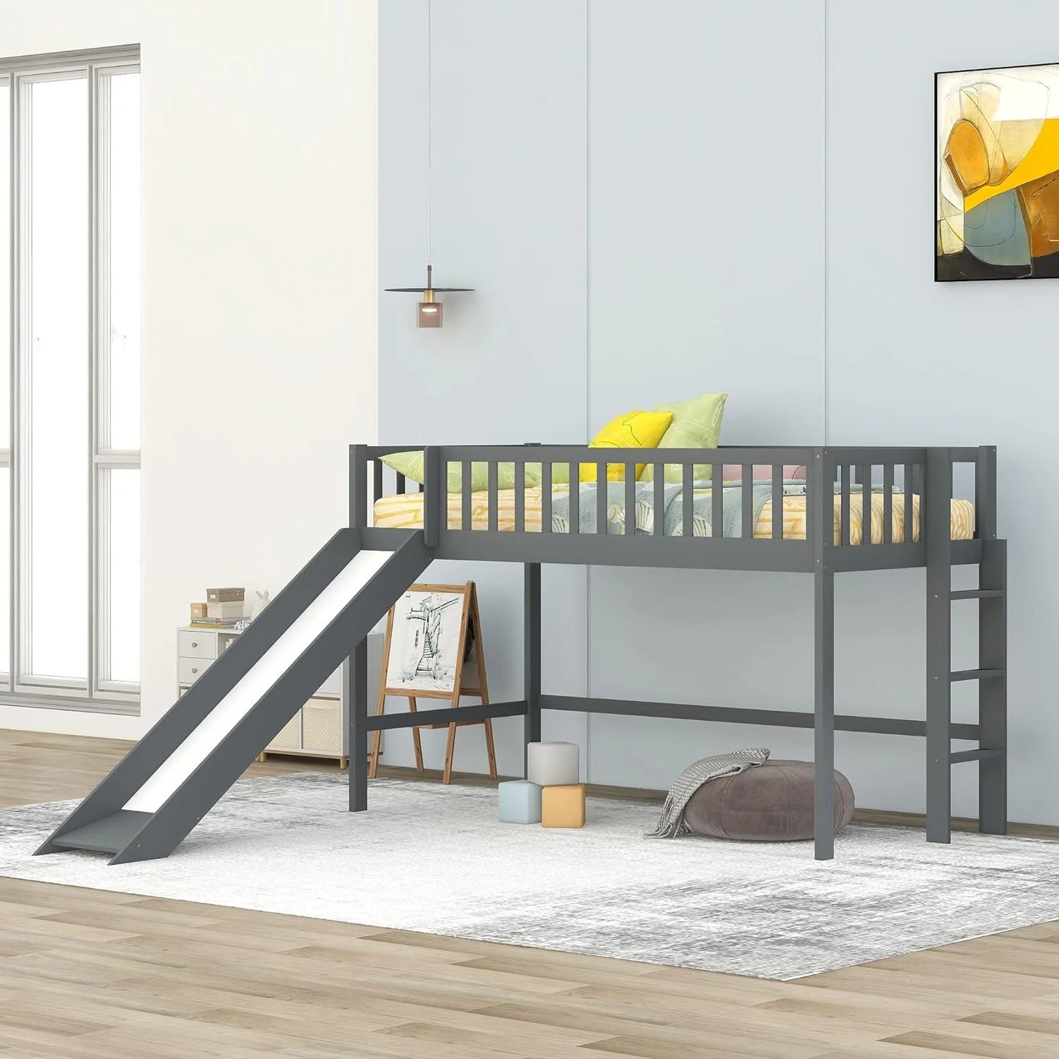 Low Lof Bed Wih Slide, Wood Size Lof Bed Frame Wih Ladder Ad Guardrails For Kids, oddlers, ees, o Box Sprig(Gray)