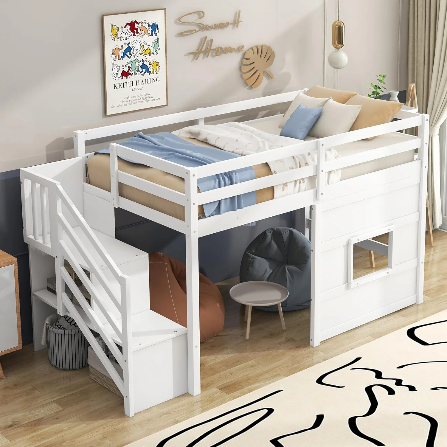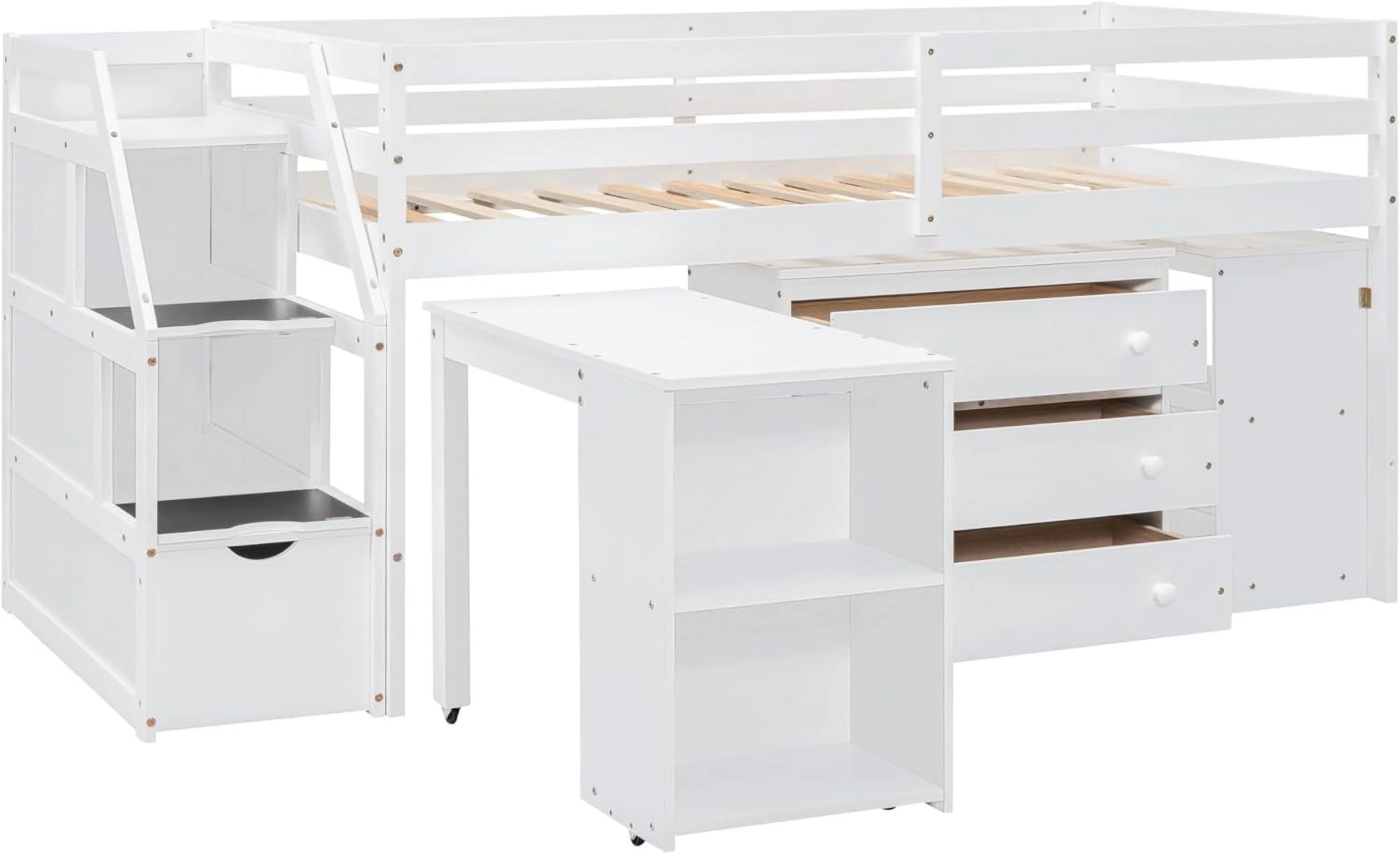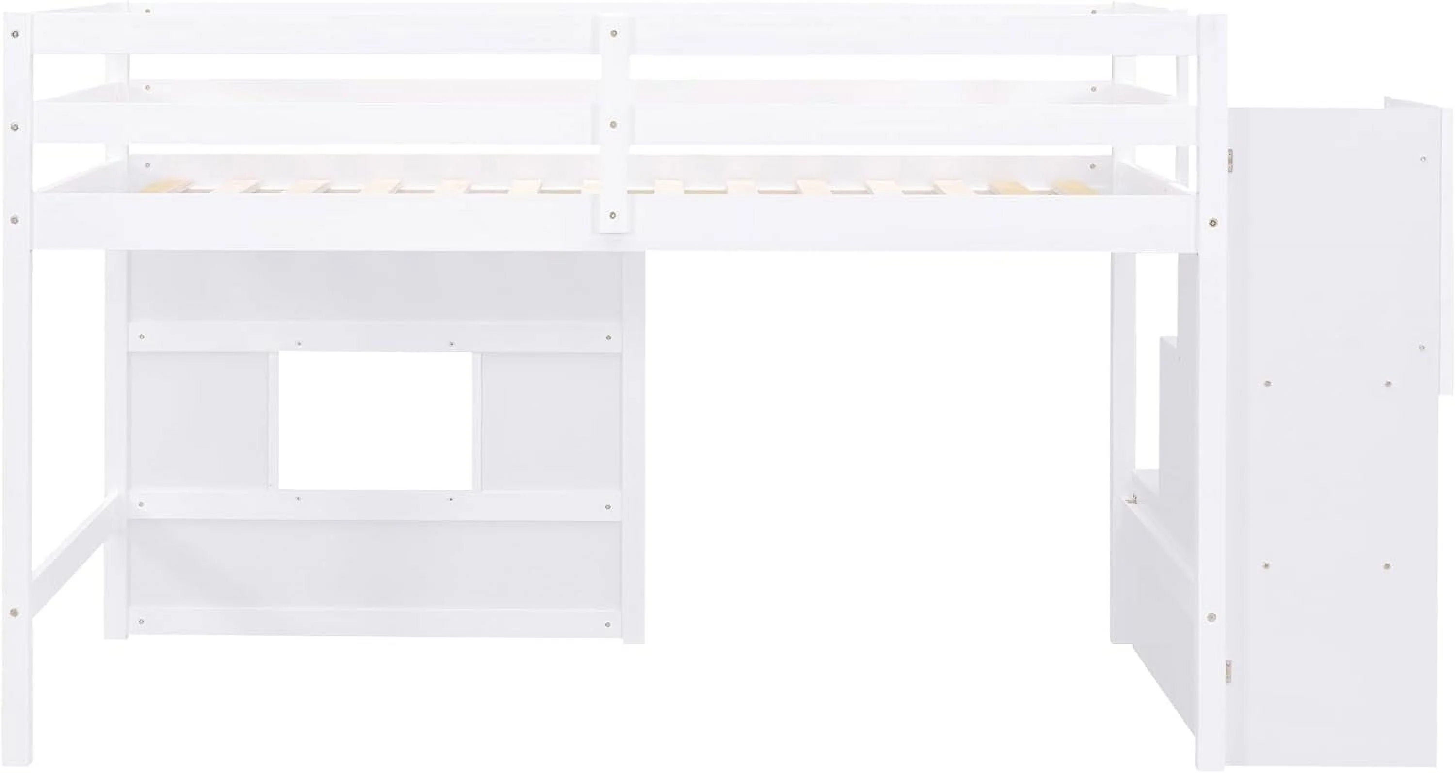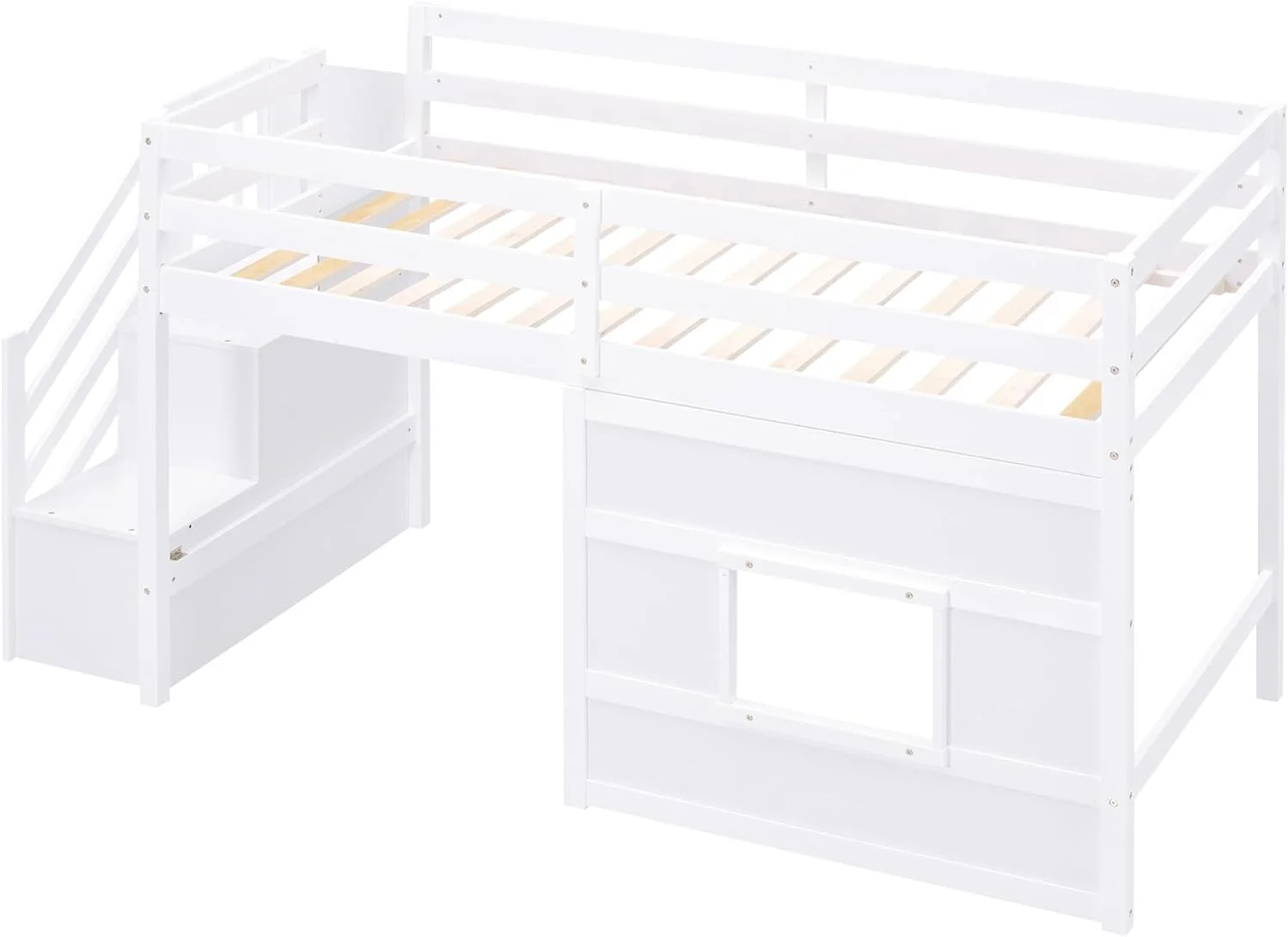 Size Low Lof Bed Wih Sorage Saircase Ad Widow, Woode Lof Bed Frame For Kids, ees, Boys, Girls, o Box Sprig eeded (, Whie)