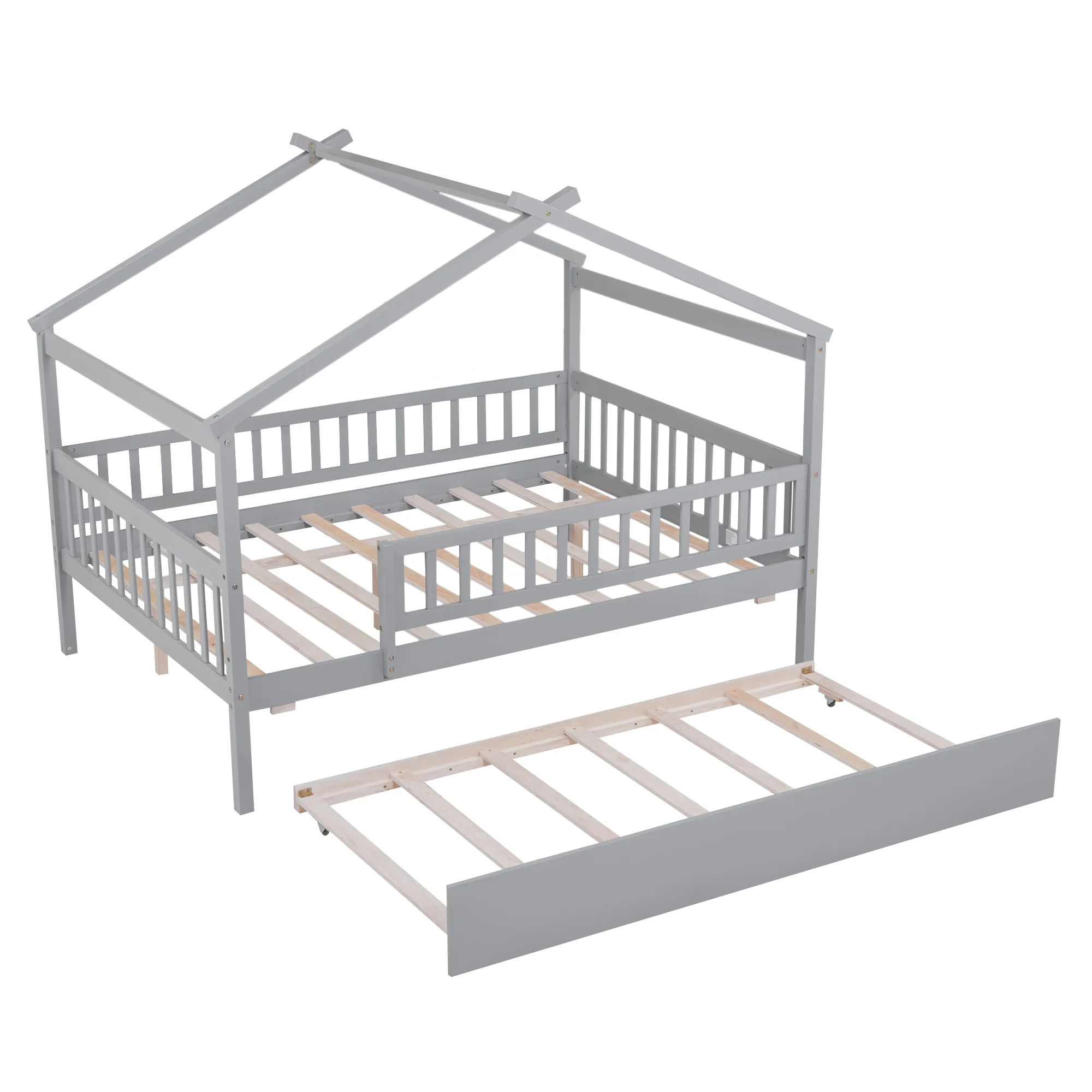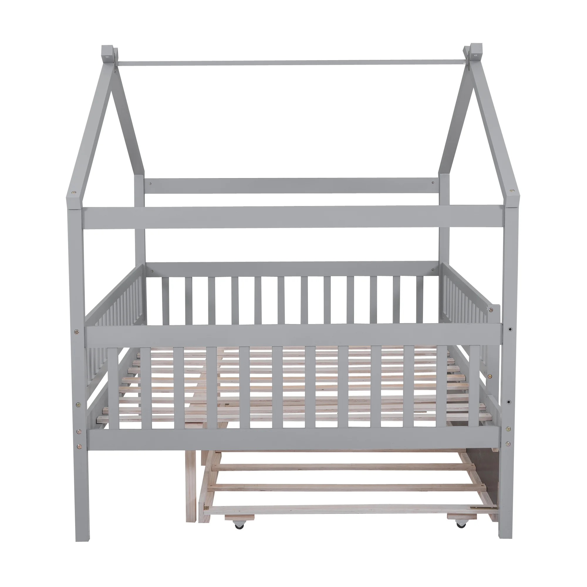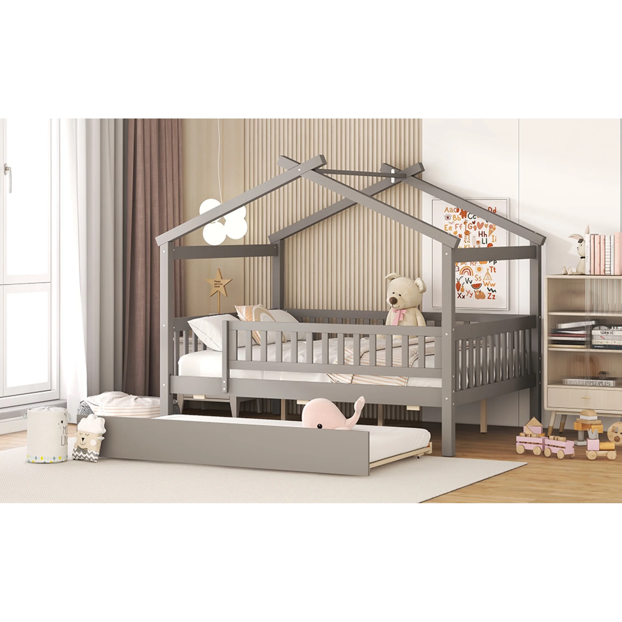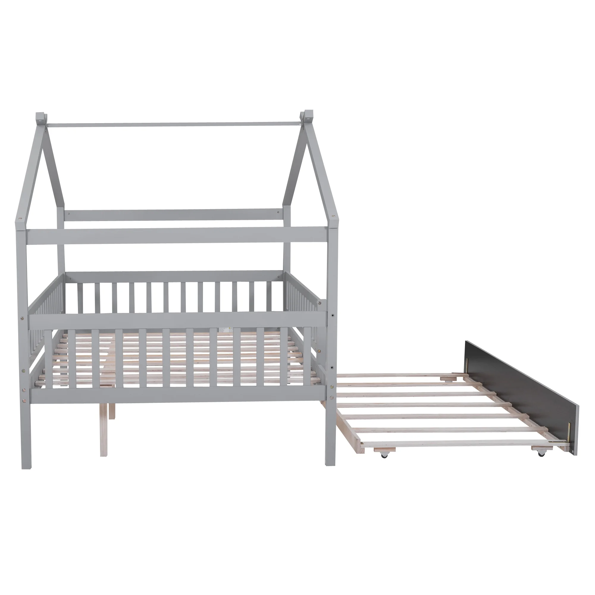 "Charming Gray Full-Size Wooden House Bed Frame with Convenient Twin-Size Trundle for Guest Sleeping"