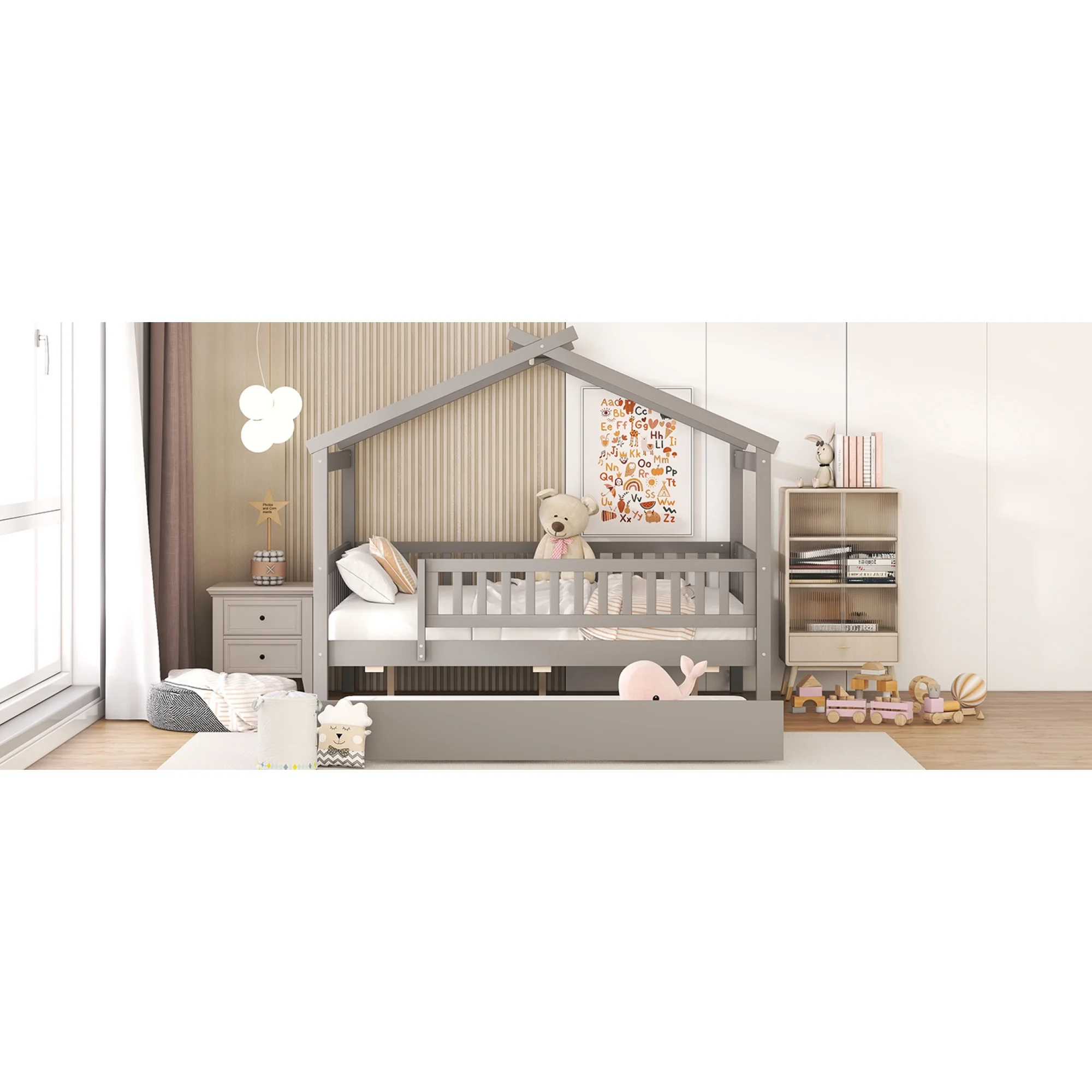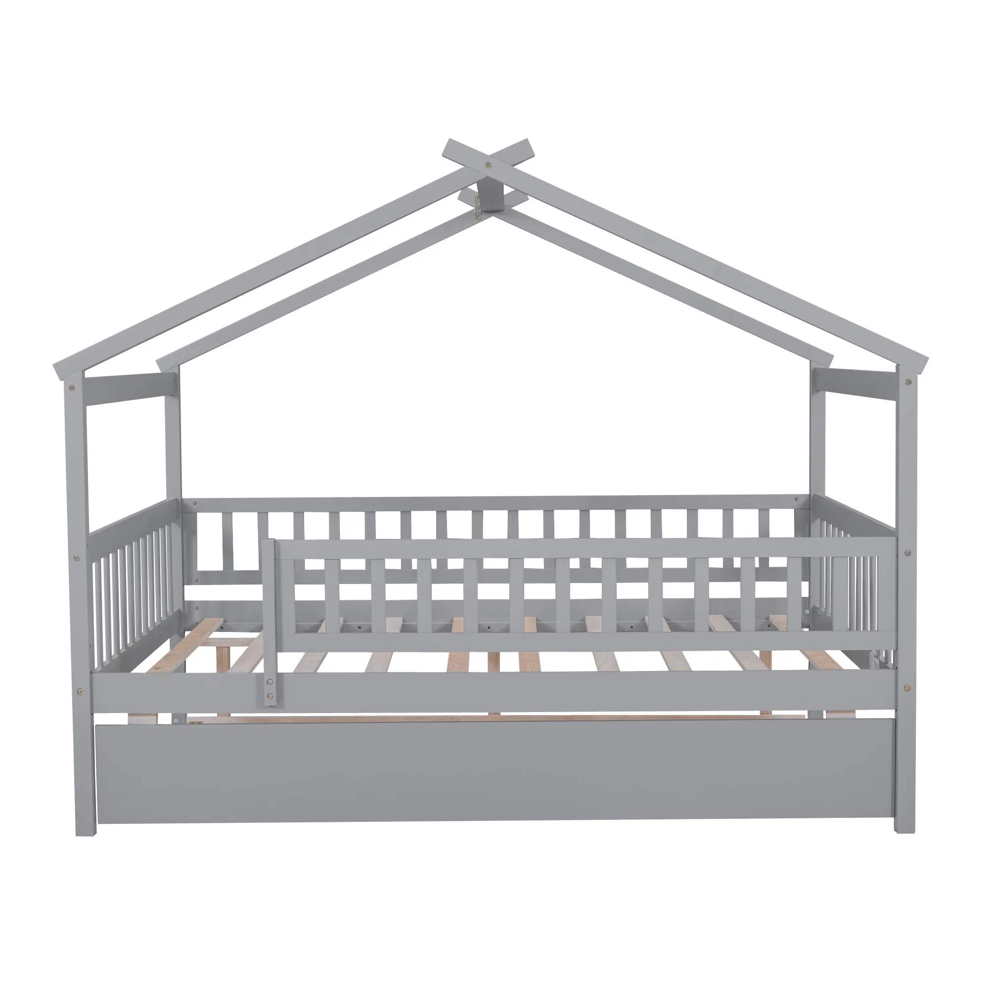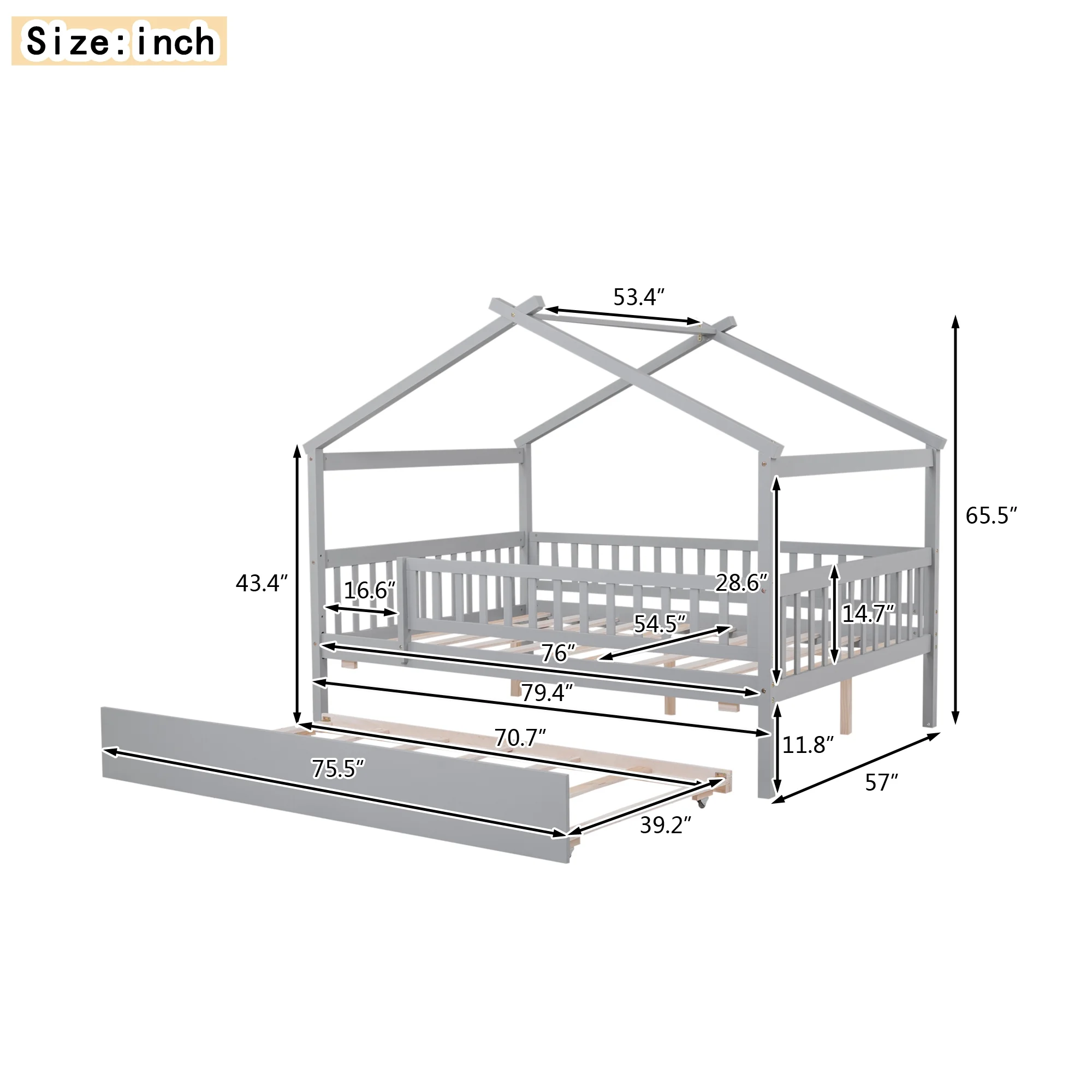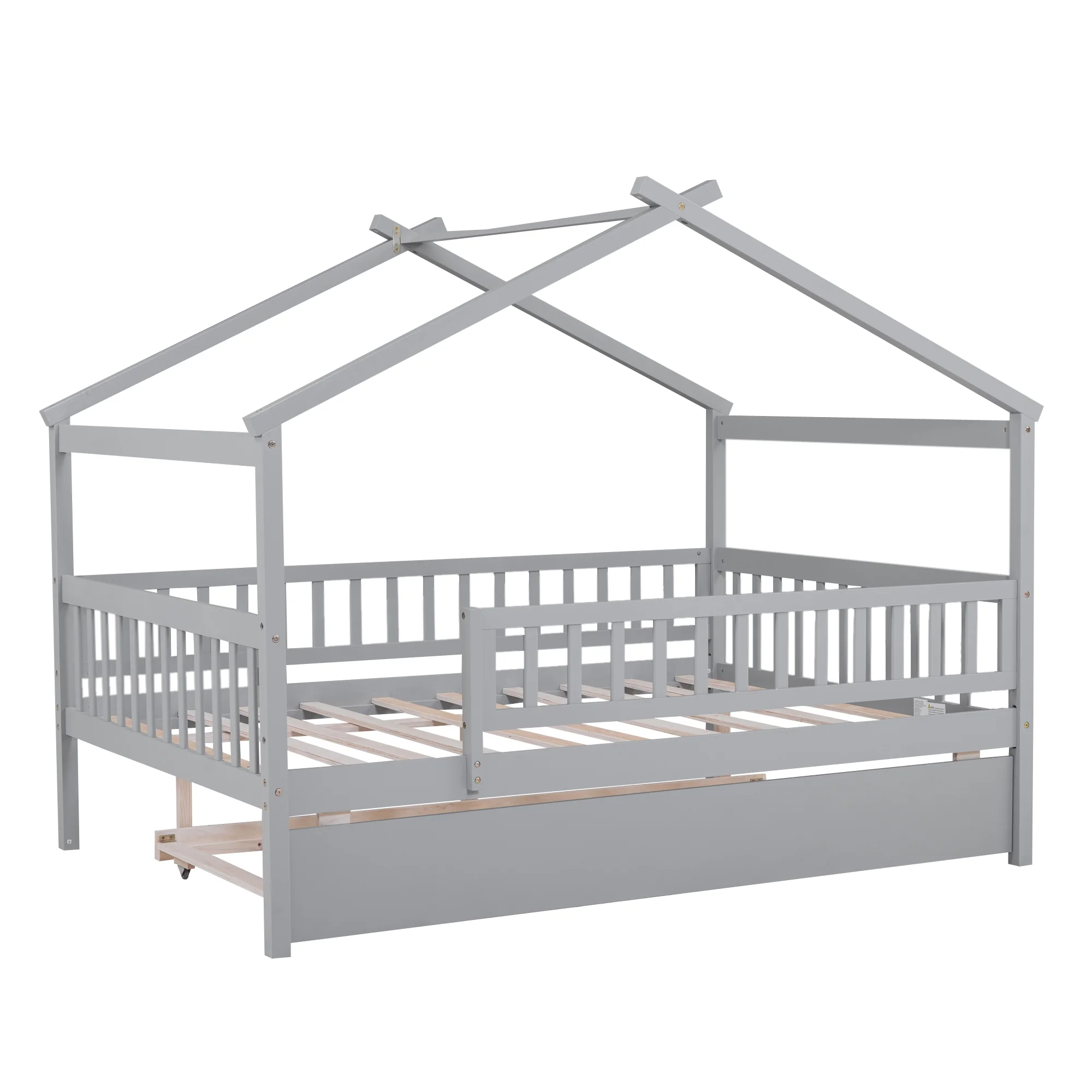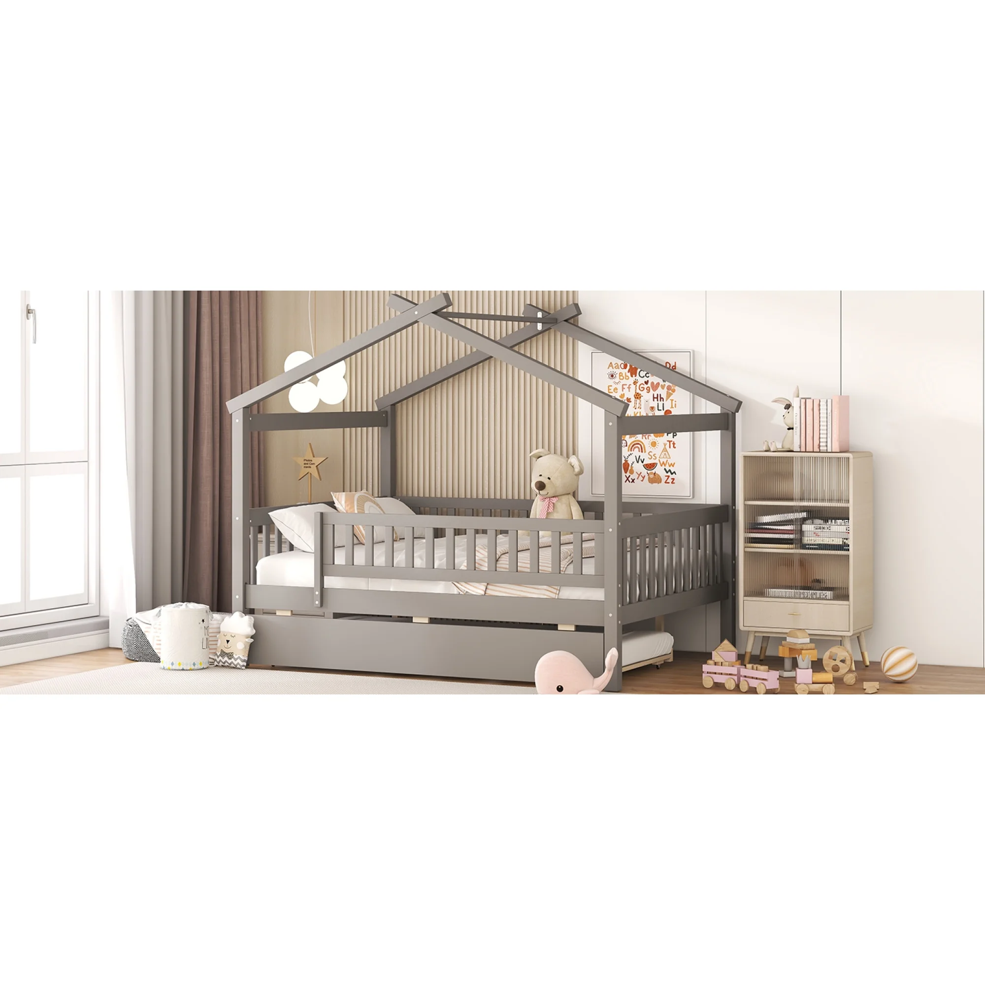 "Charming Gray Full-Size Wooden House Bed Frame with Convenient Twin-Size Trundle for Guest Sleeping"