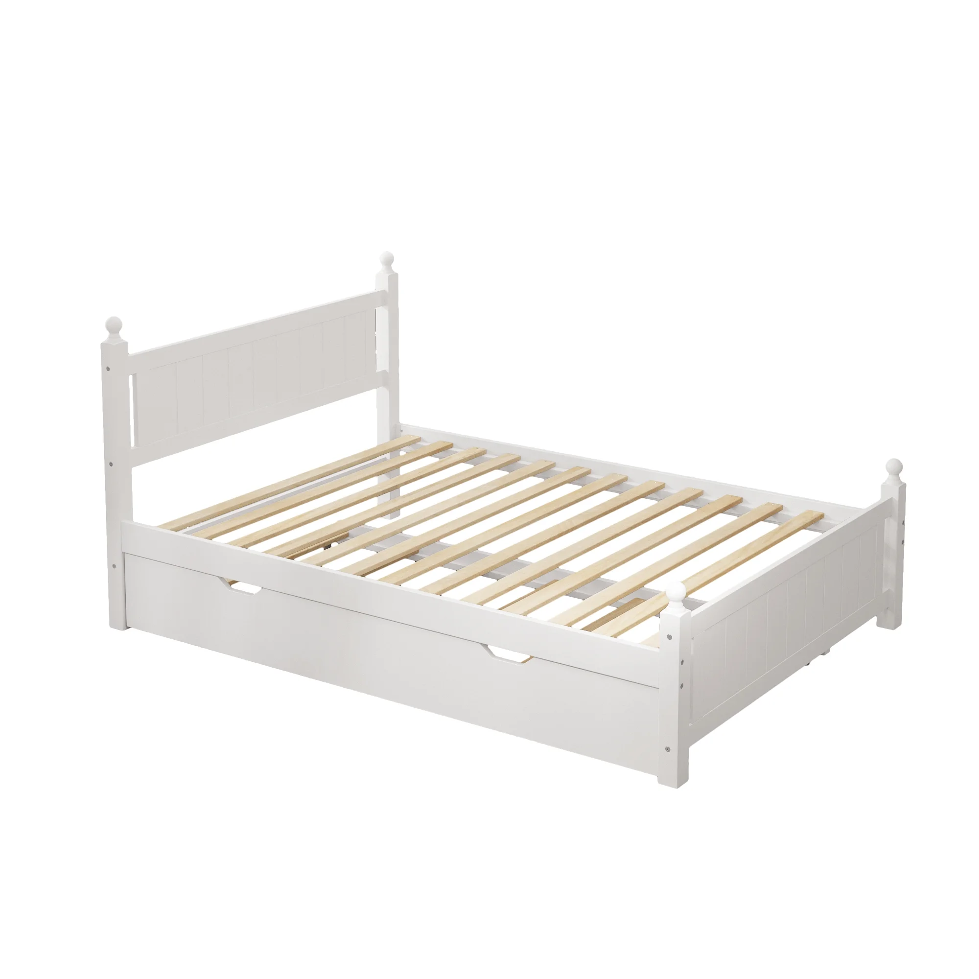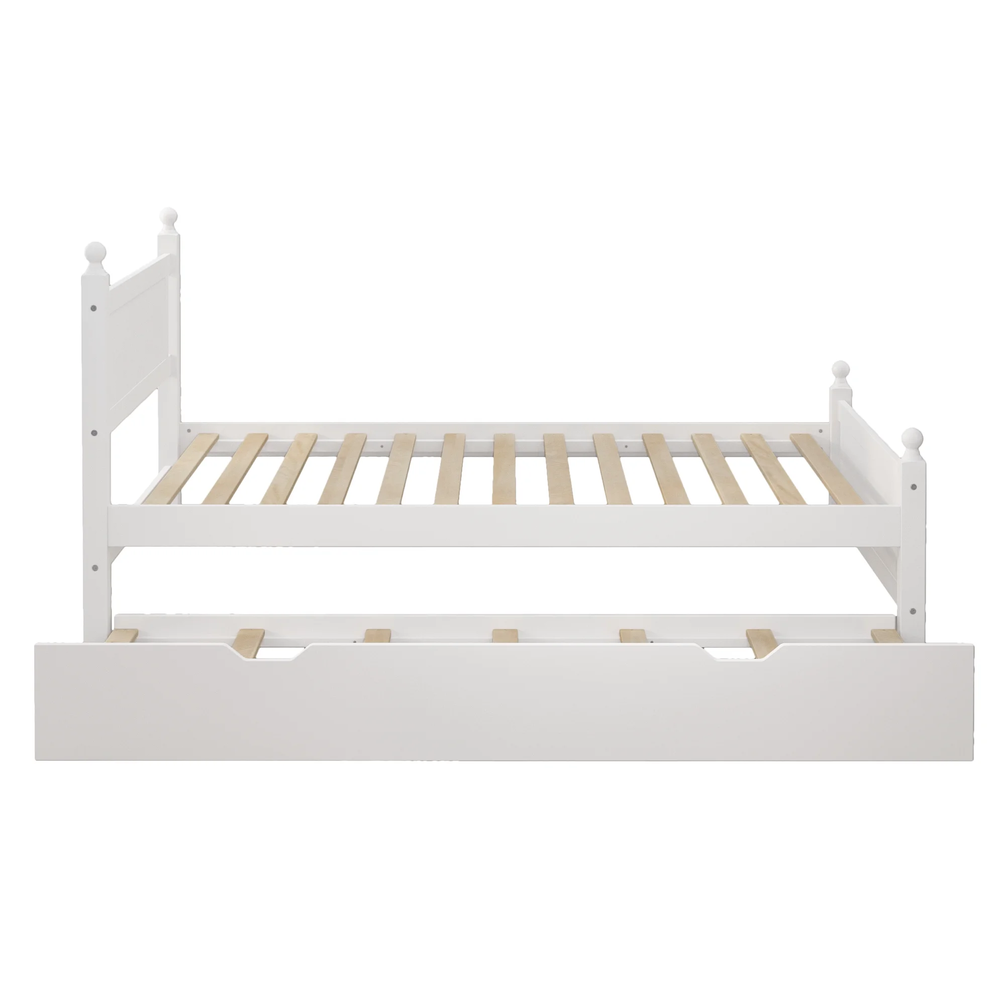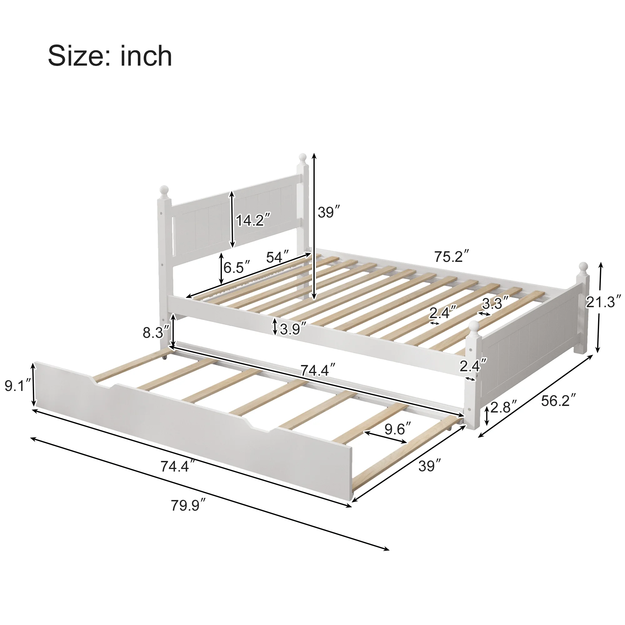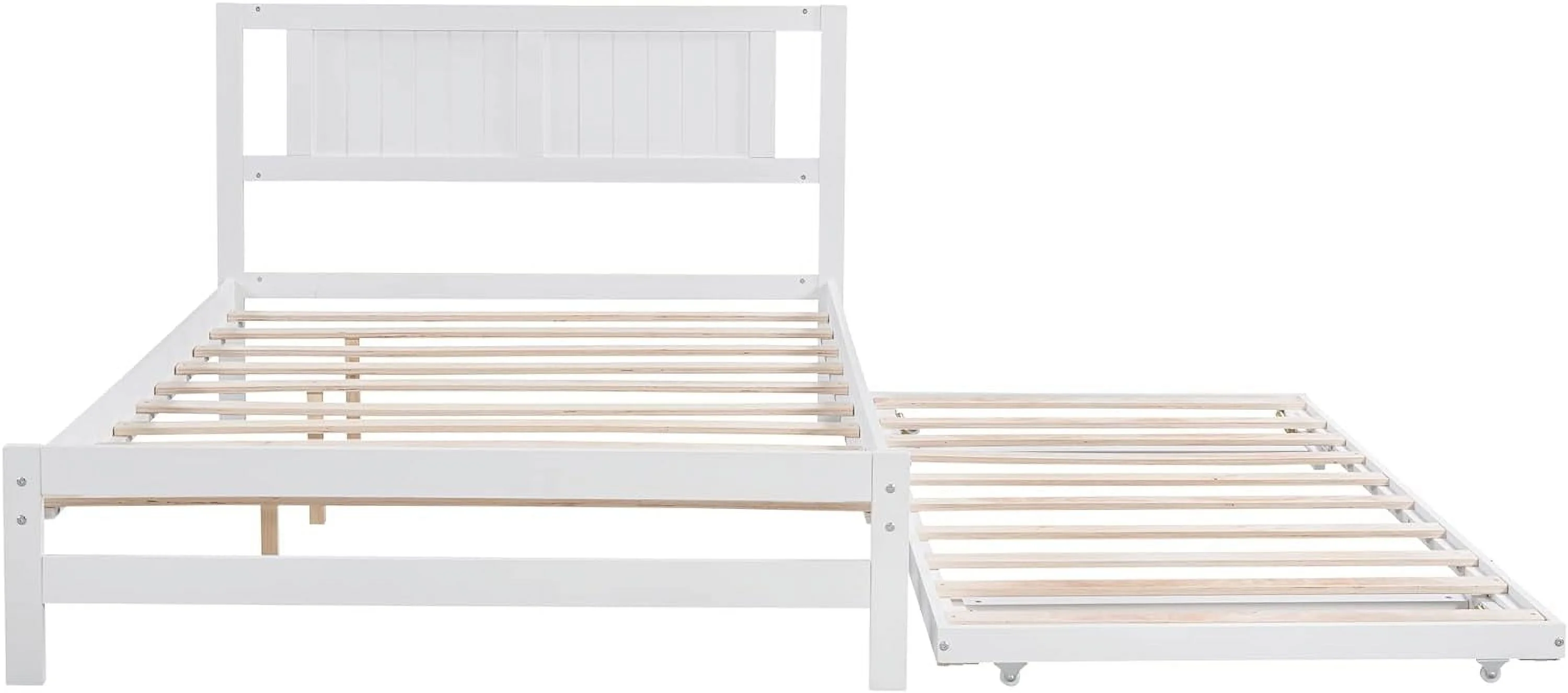 Full Size Solid Wood Platform Bed Frame with Trundle - Perfect for Limited Space, Kids, Teens, Adults, White
