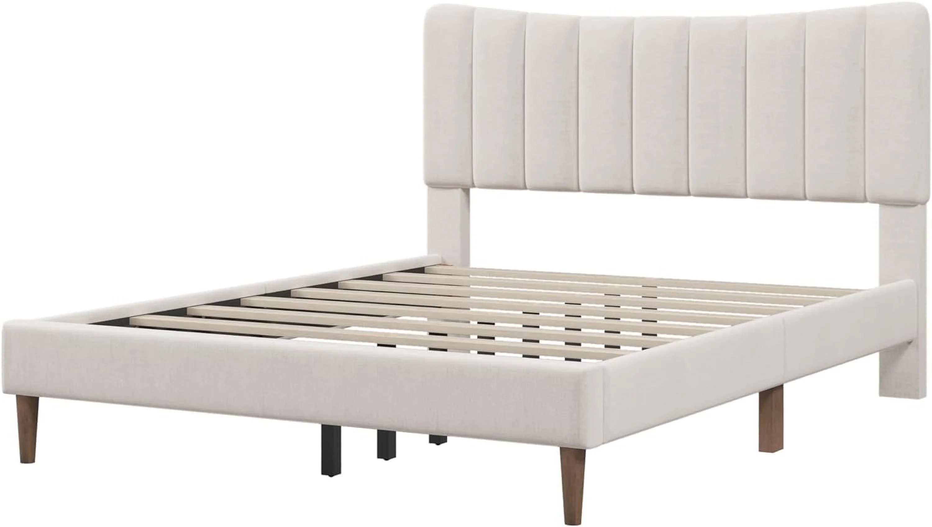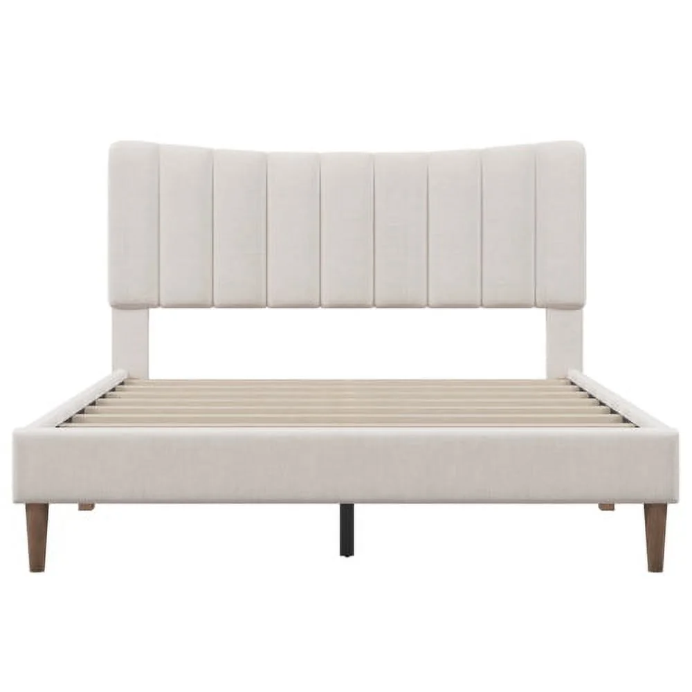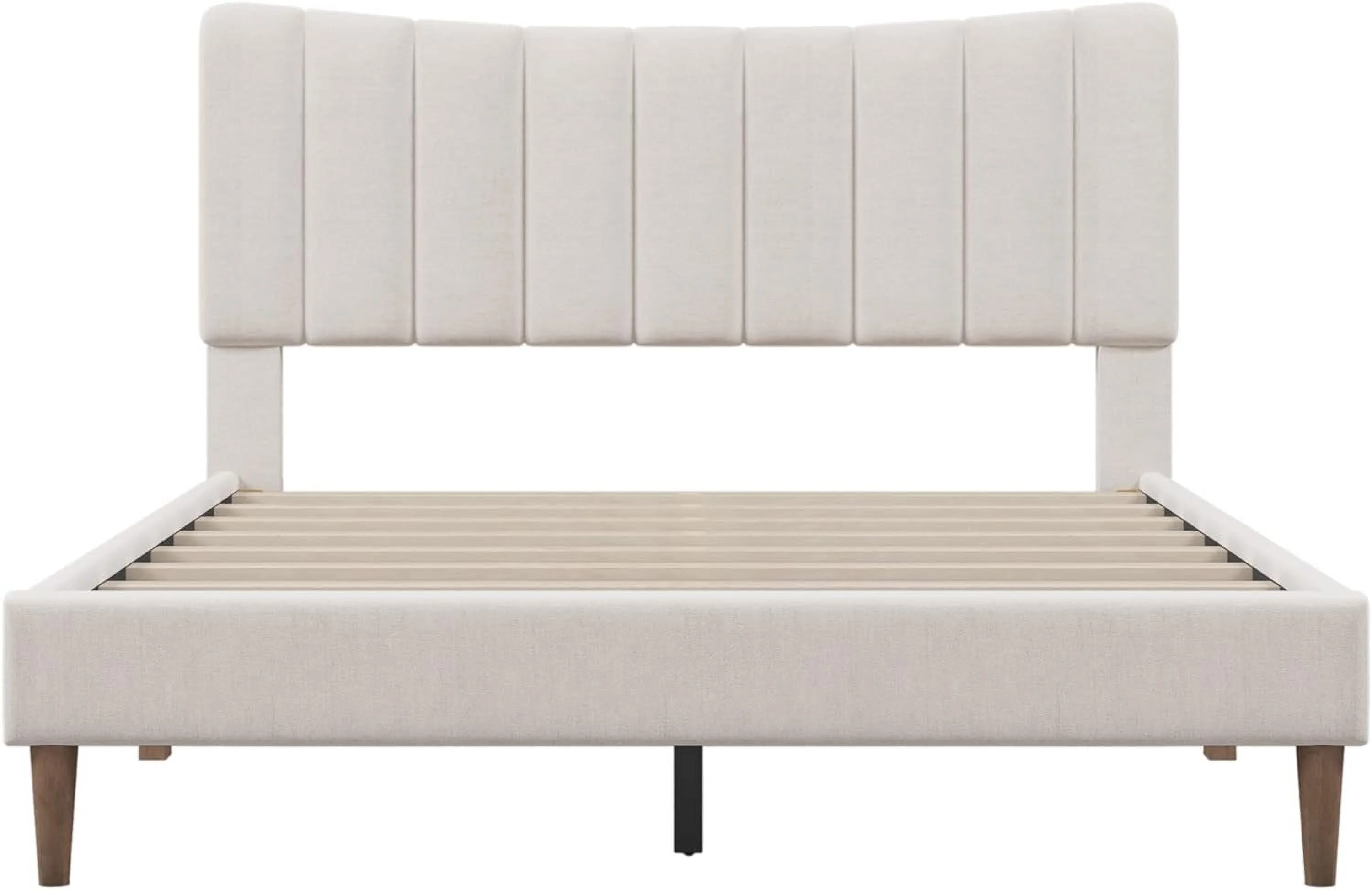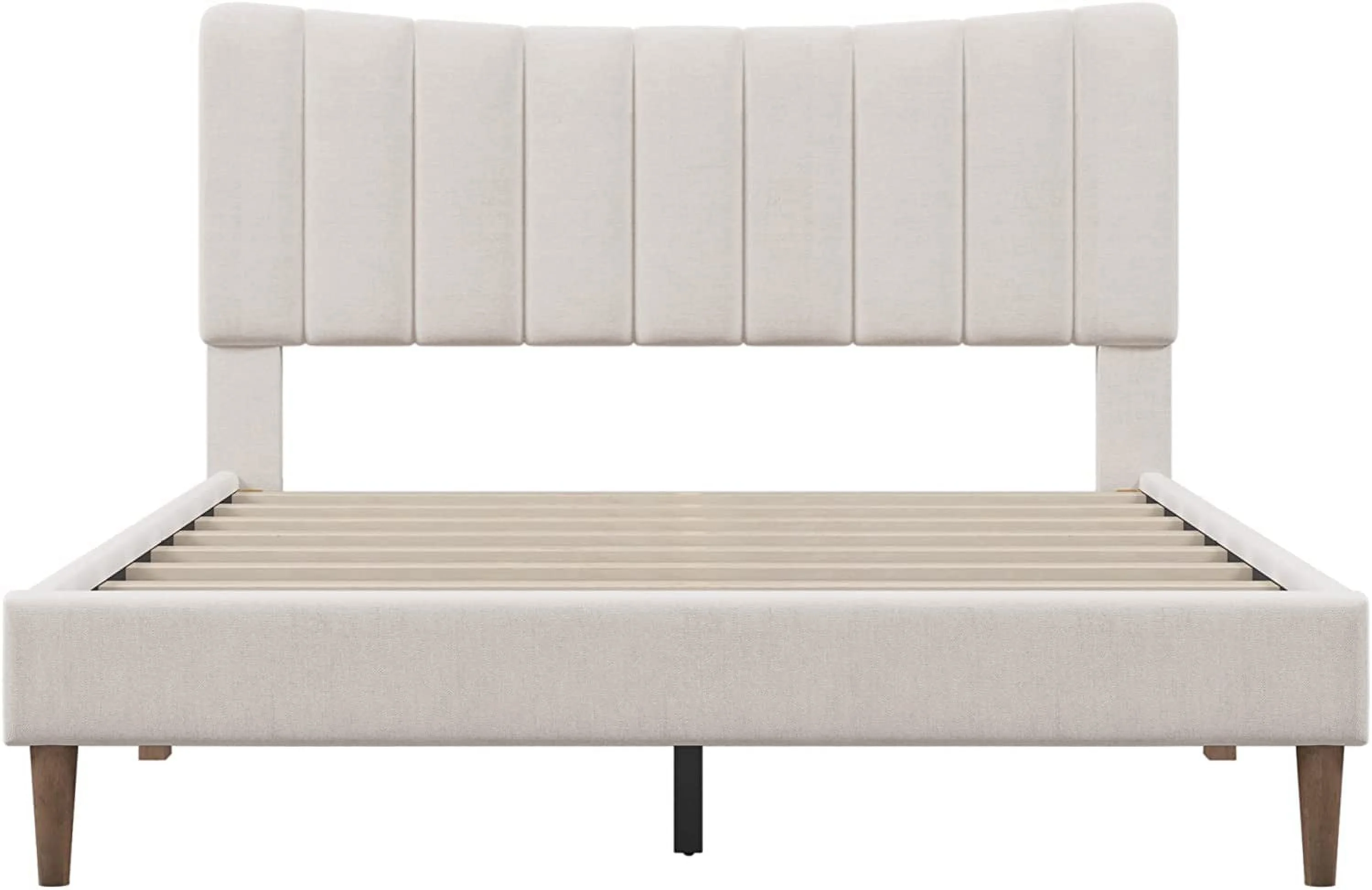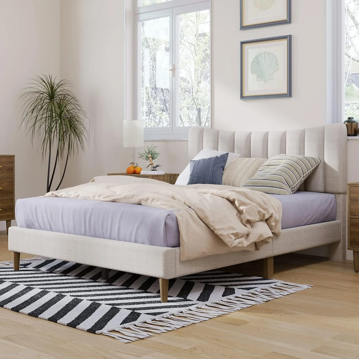 Saim Upholstered Platform Bed Frame with Vertical Channel Tufted Headboard, No Box Spring Needed, Queen,Cream