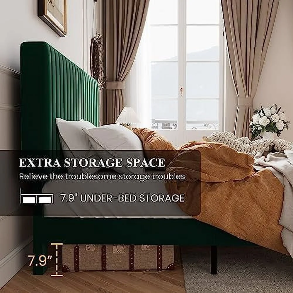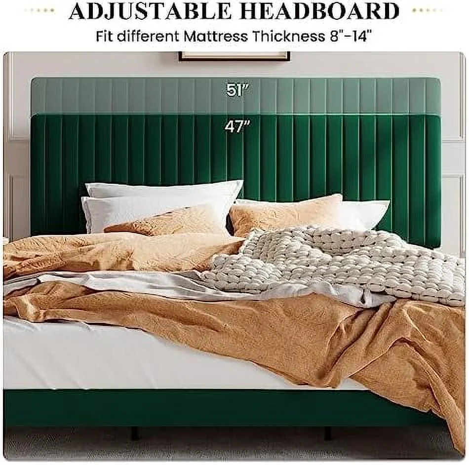 LANTRO JS Queen Bed Frame, Velvet Upholstered Bed Frame with Vertical Channel Tufted Headboard Beige
