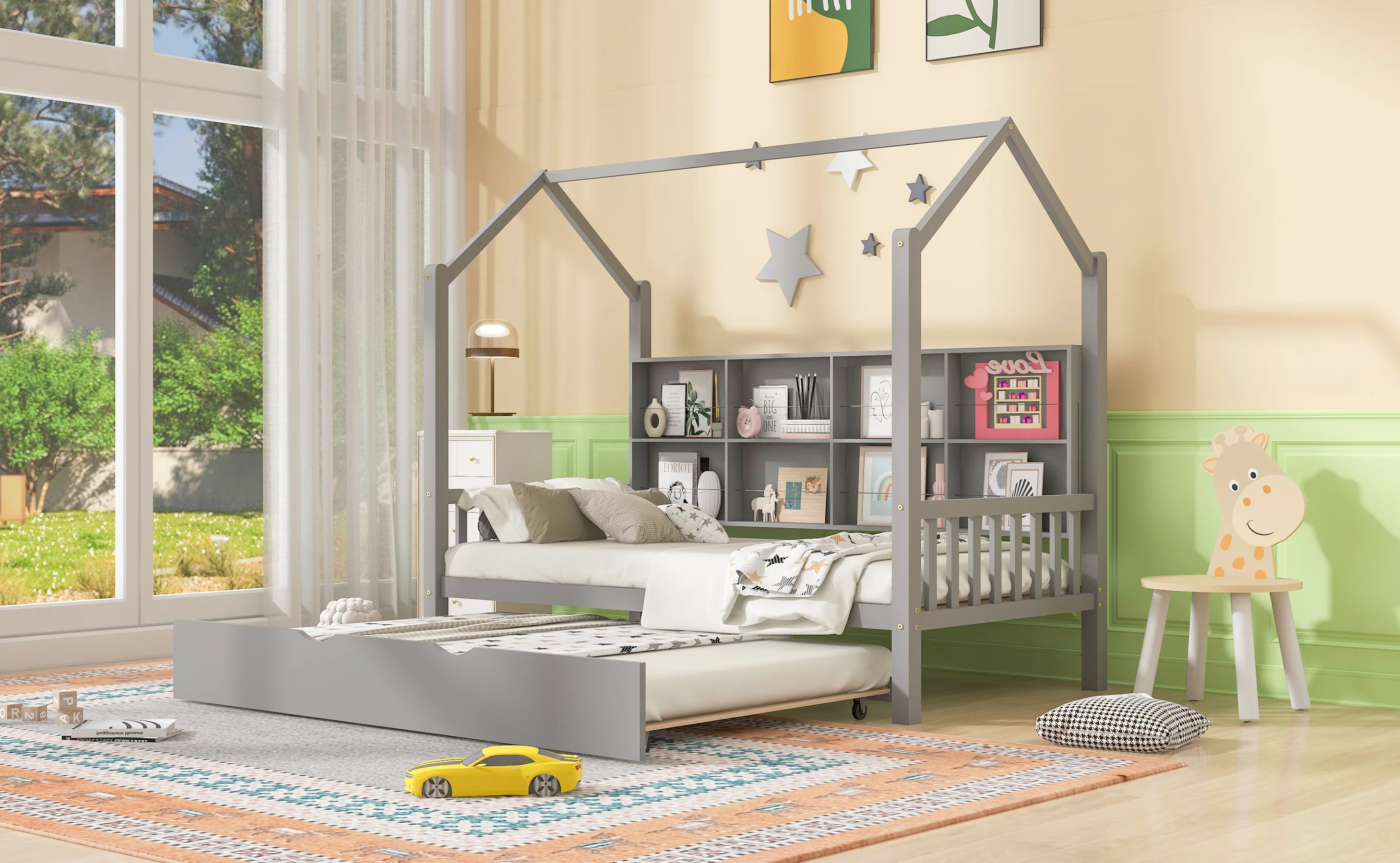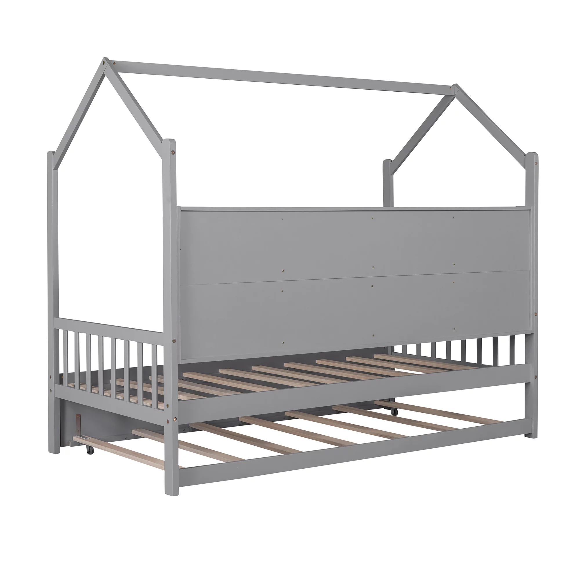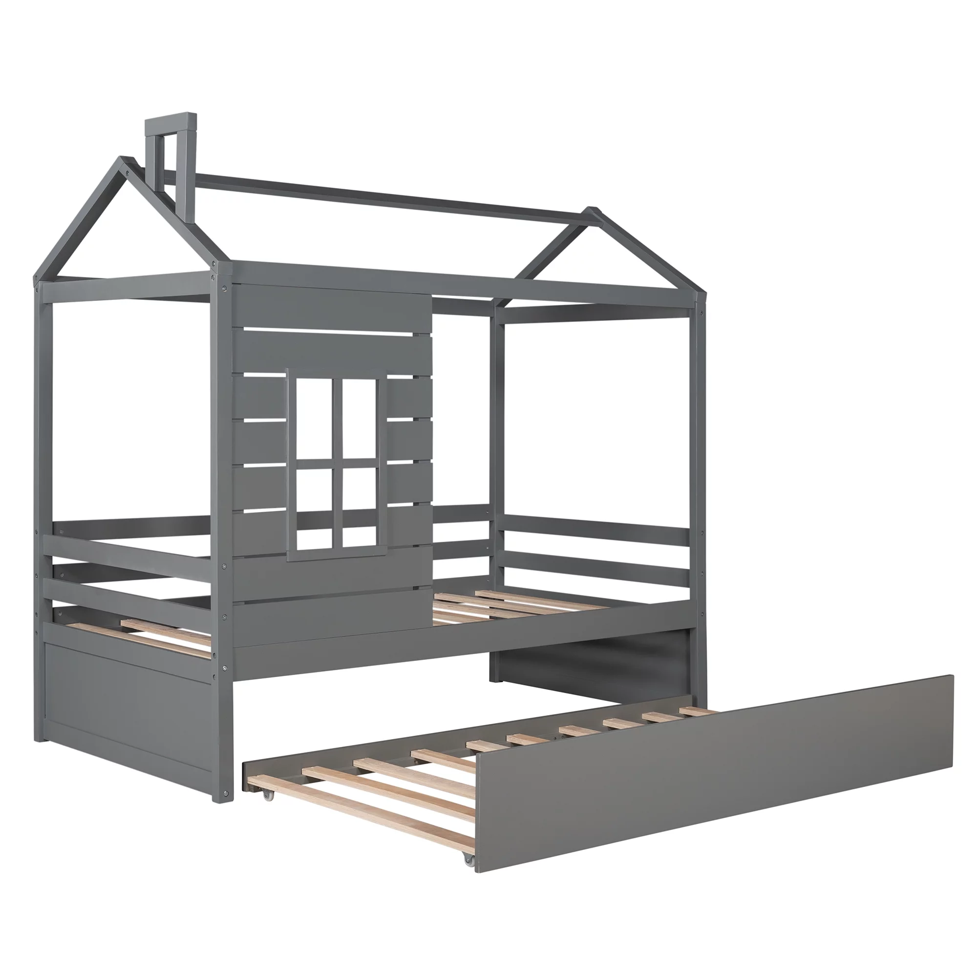 CoSoTower Wooden Twin Size House Bed with Trundle, Kids Bed with Shelf, Gray