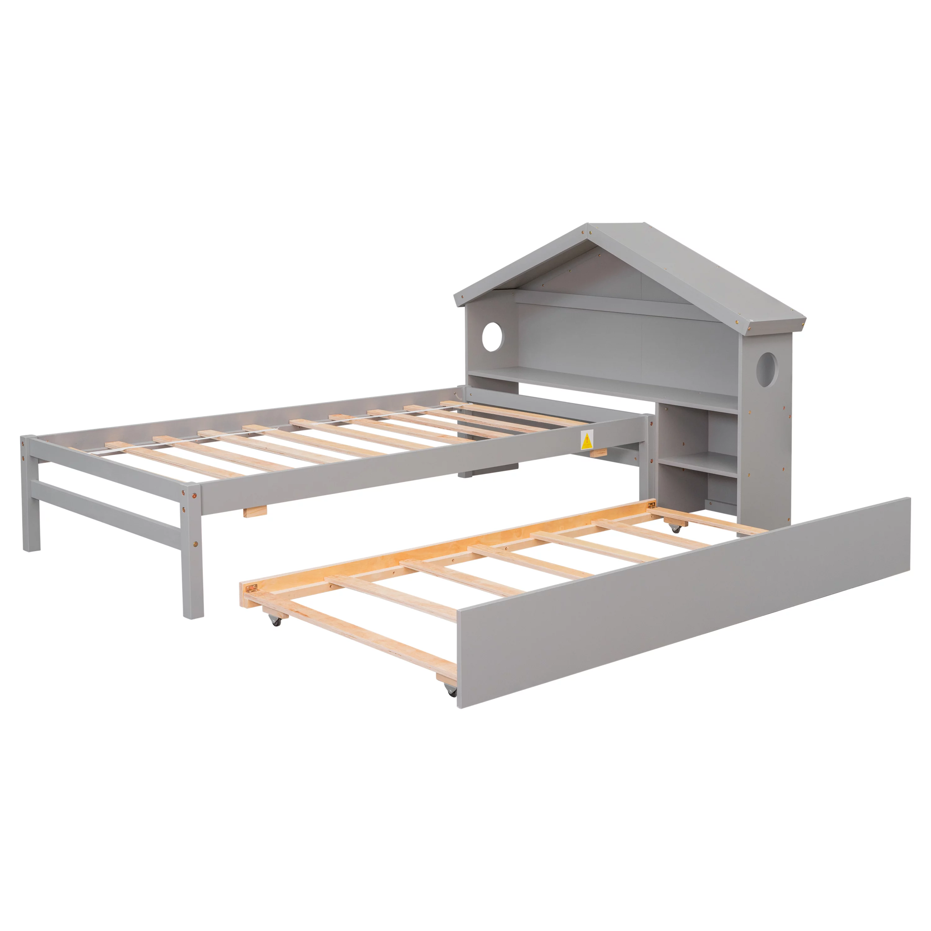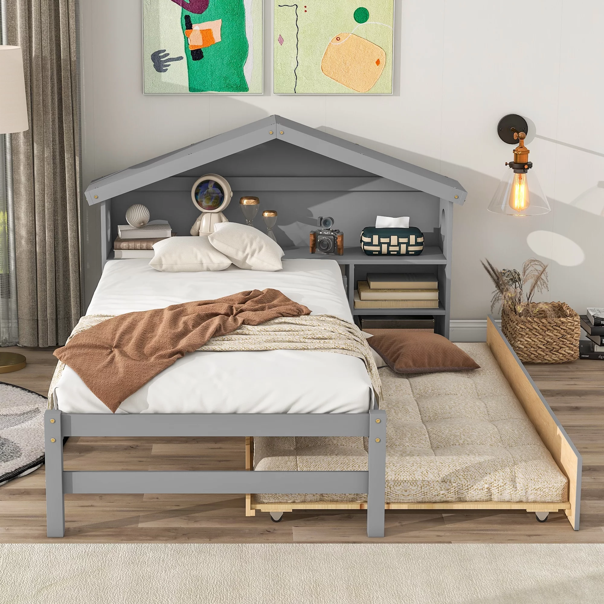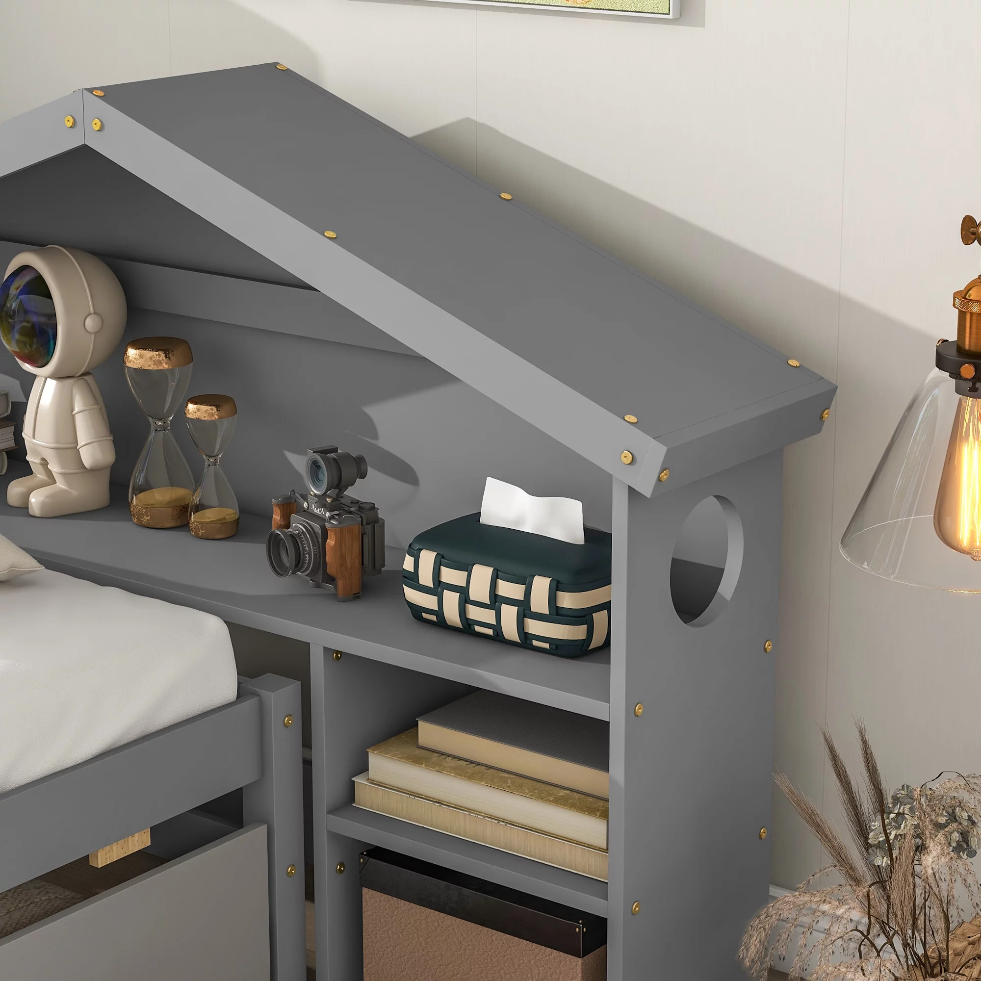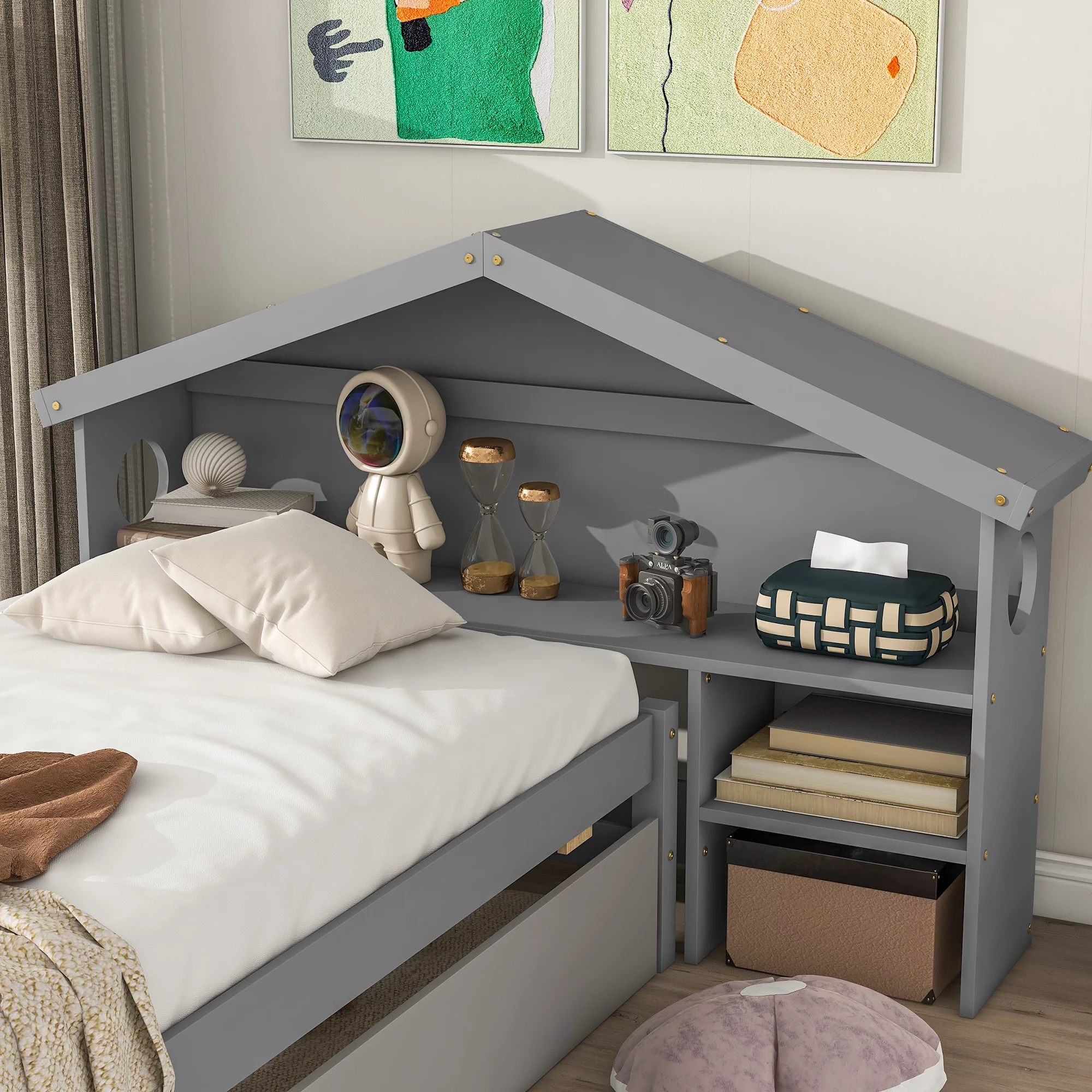 Twin Storage House Bed for kids with Bedside Table Under Bed Storage Mattress, Trundle, Grey