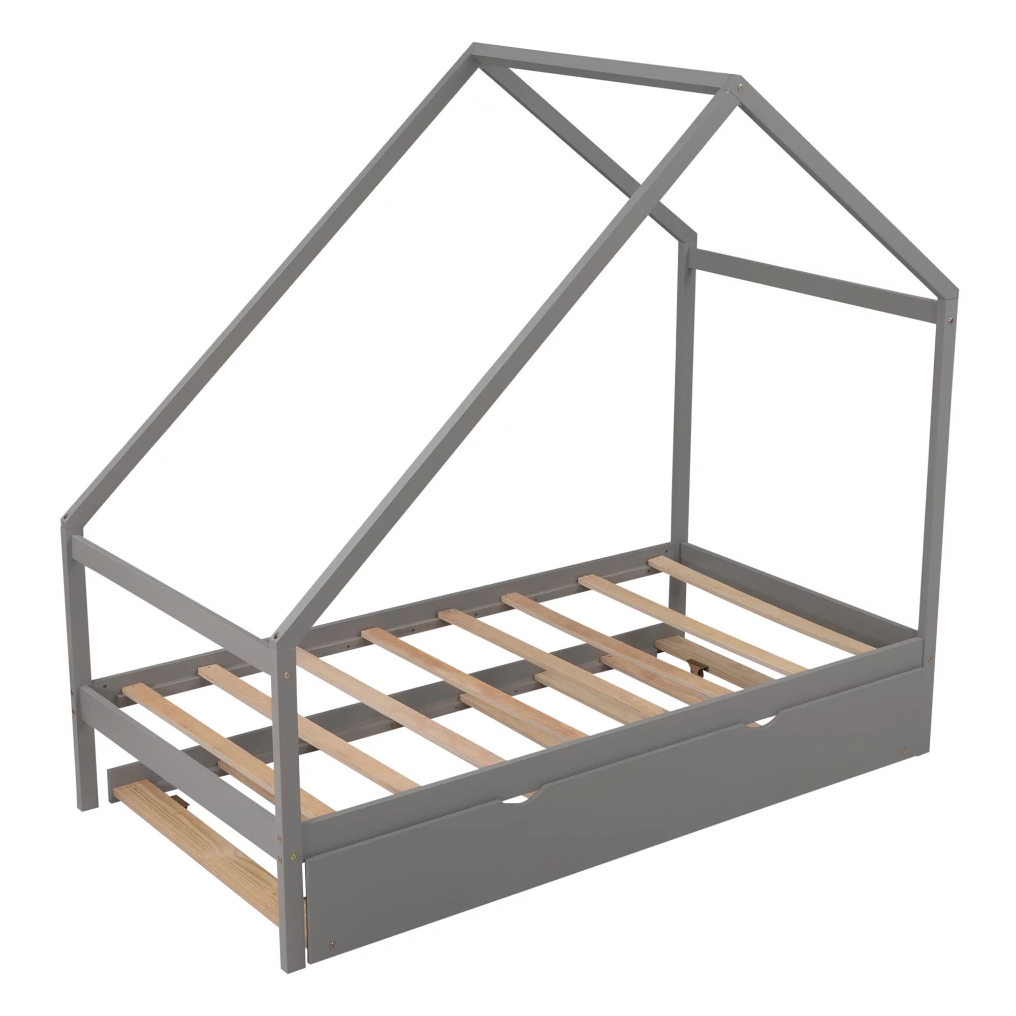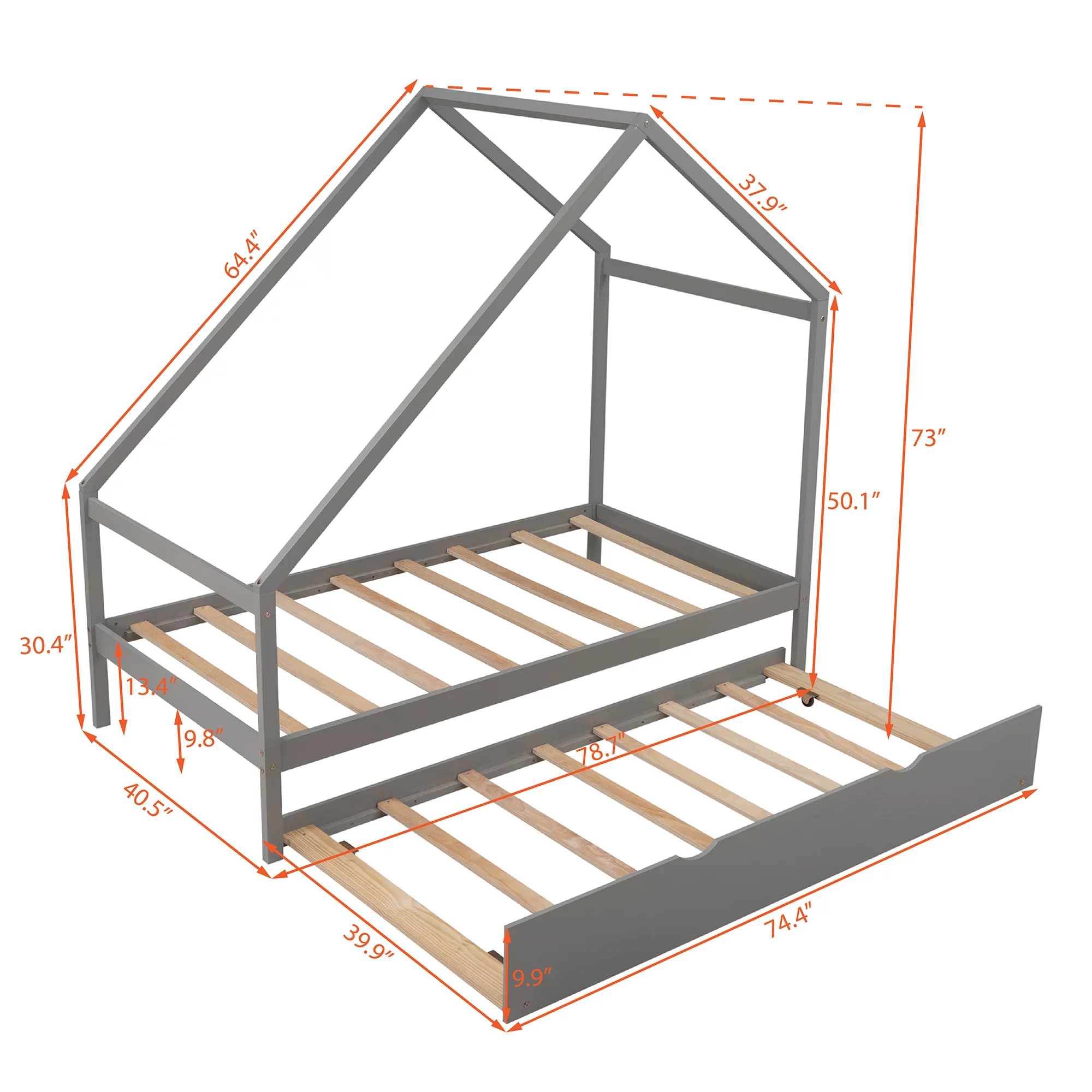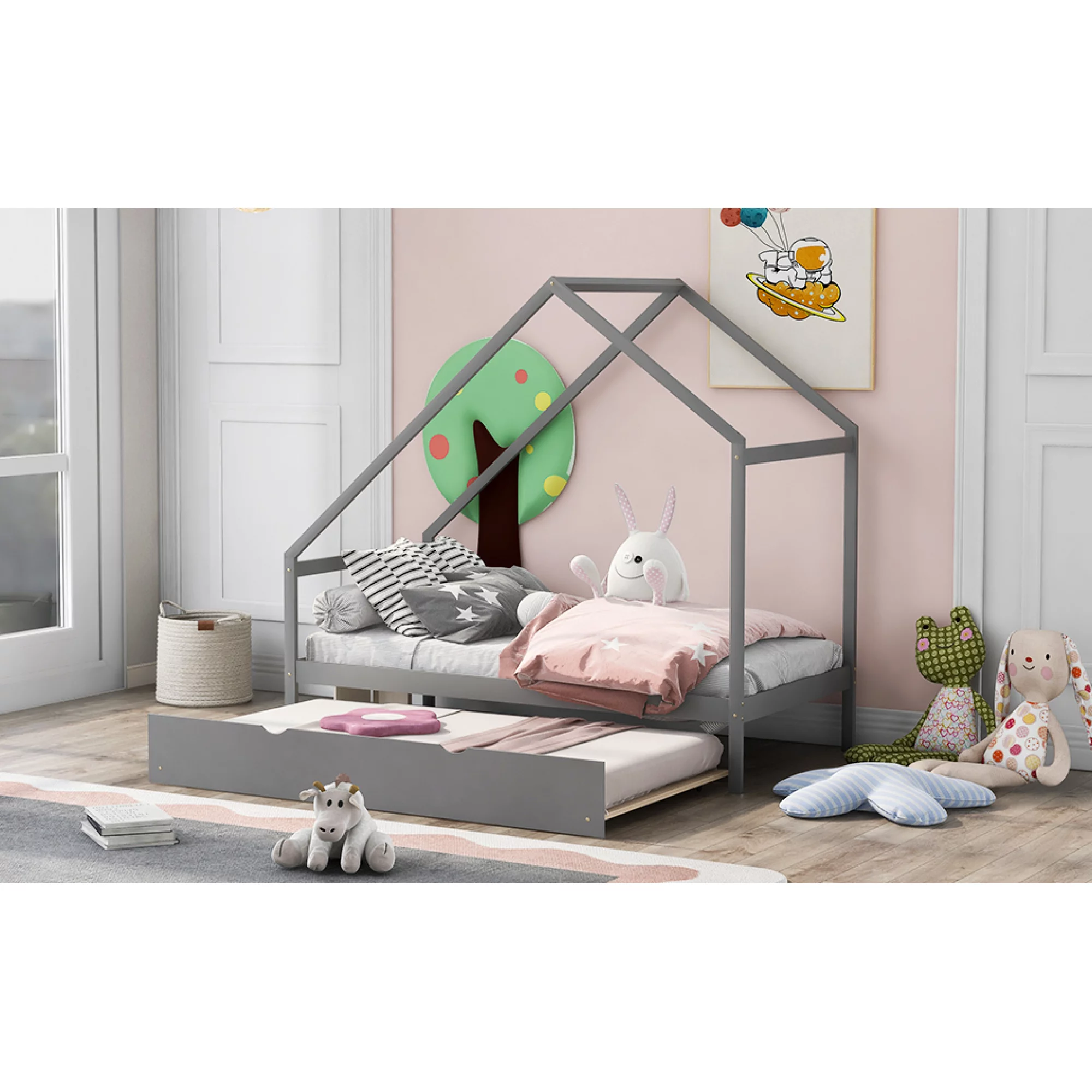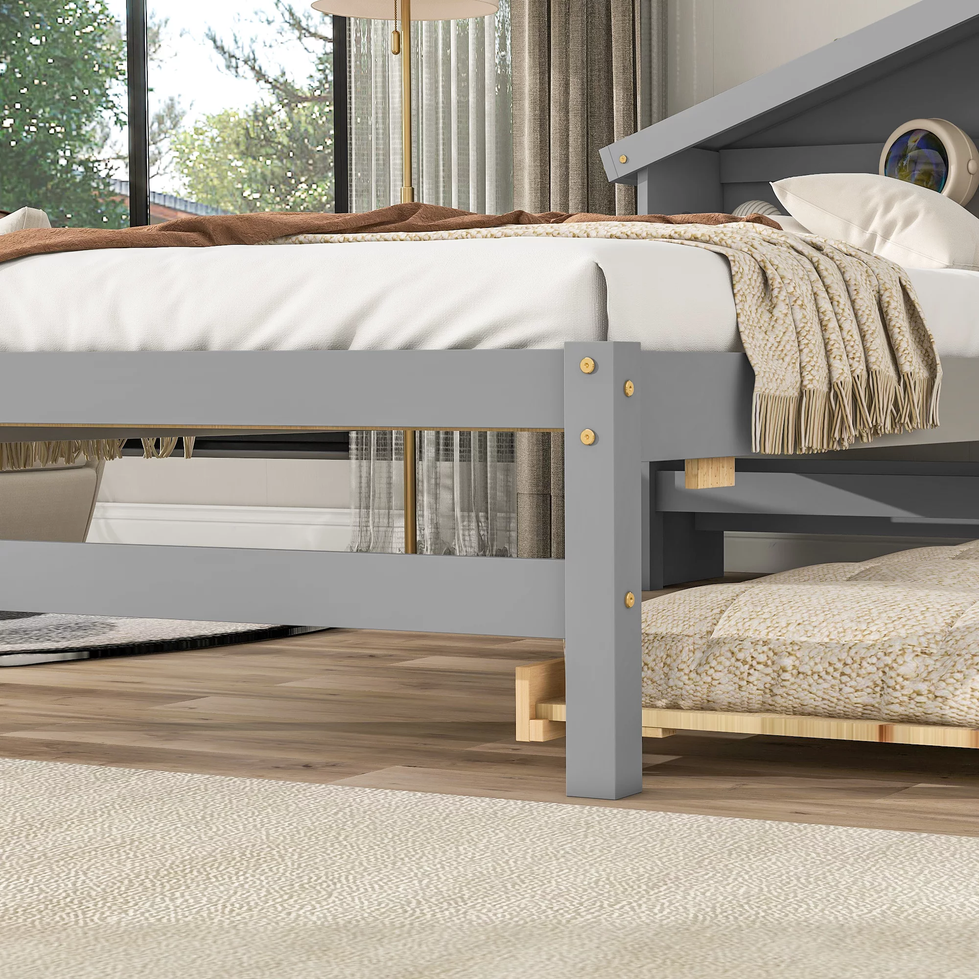 Twin Storage House Bed for kids with Bedside Table Under Bed Storage Mattress, Trundle, Grey