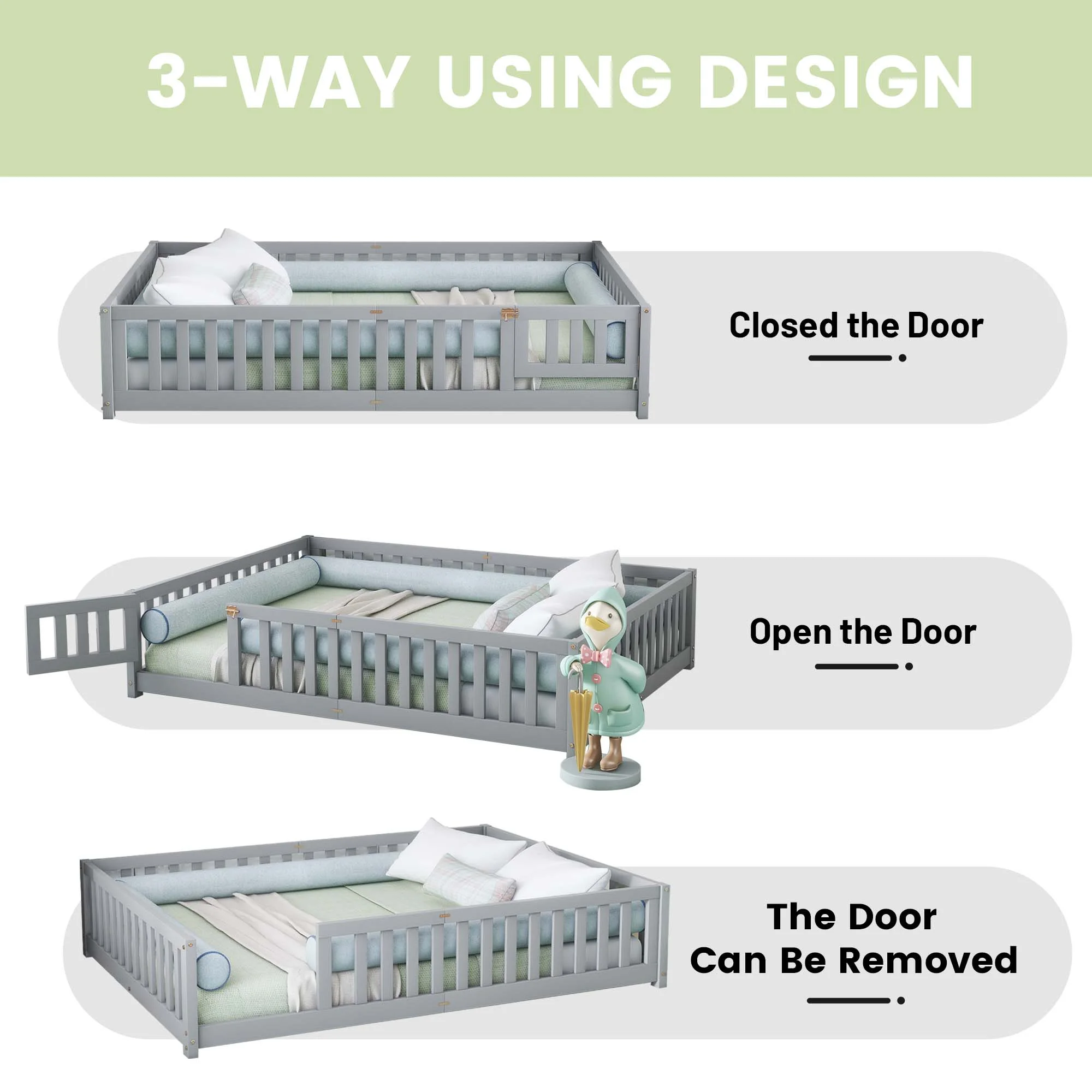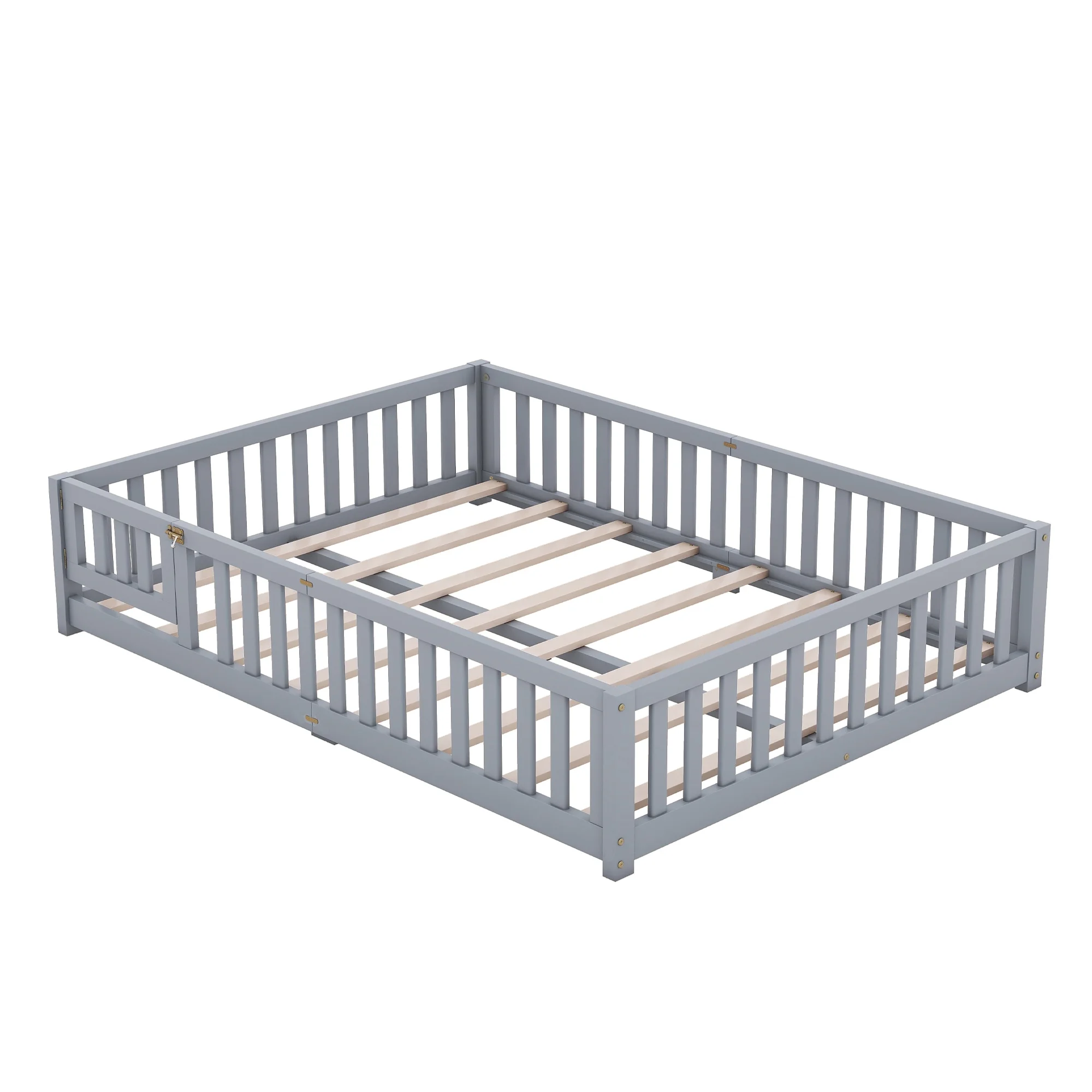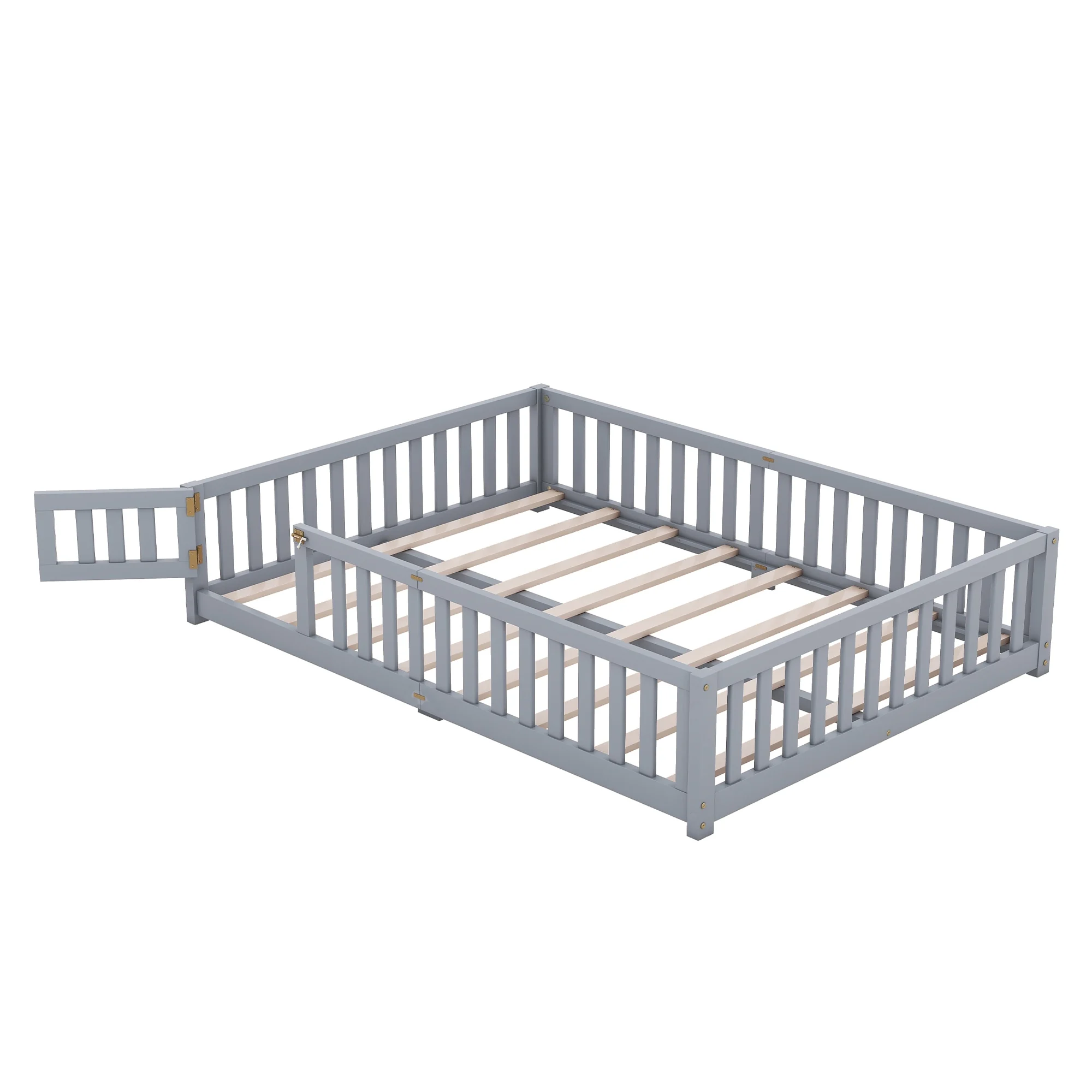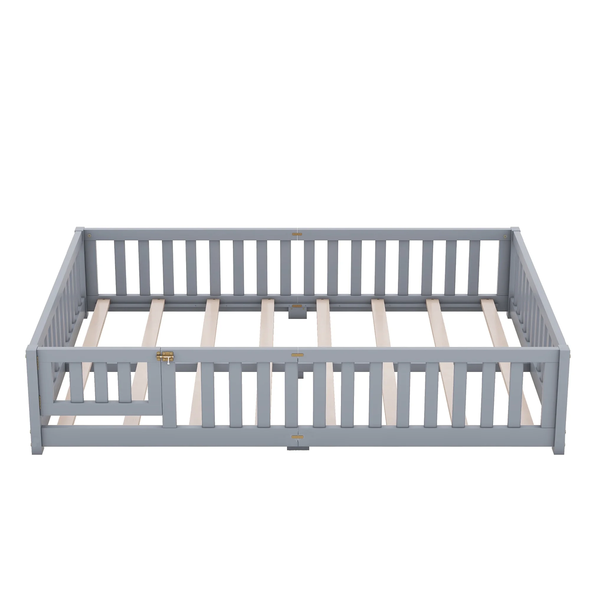 Queen Size Bed Floor Bed with Safety Guardrails and Door for Kids, Gray (Expect Arrival Date Nov.2nd)