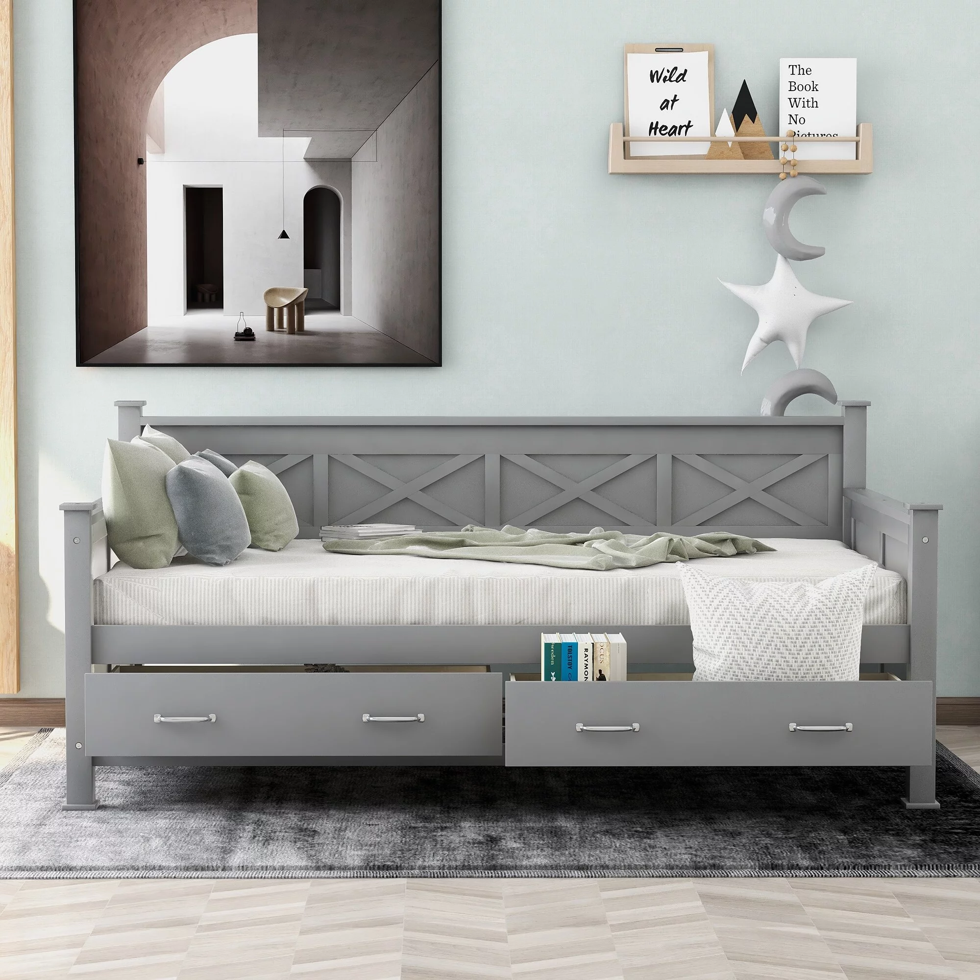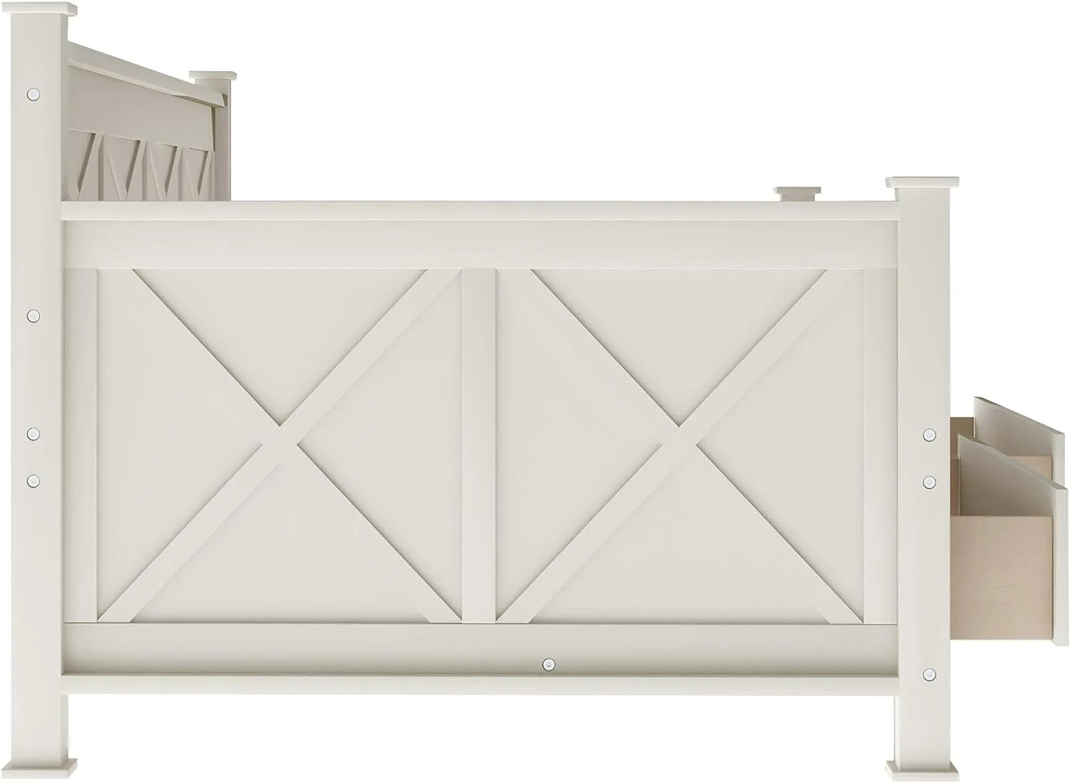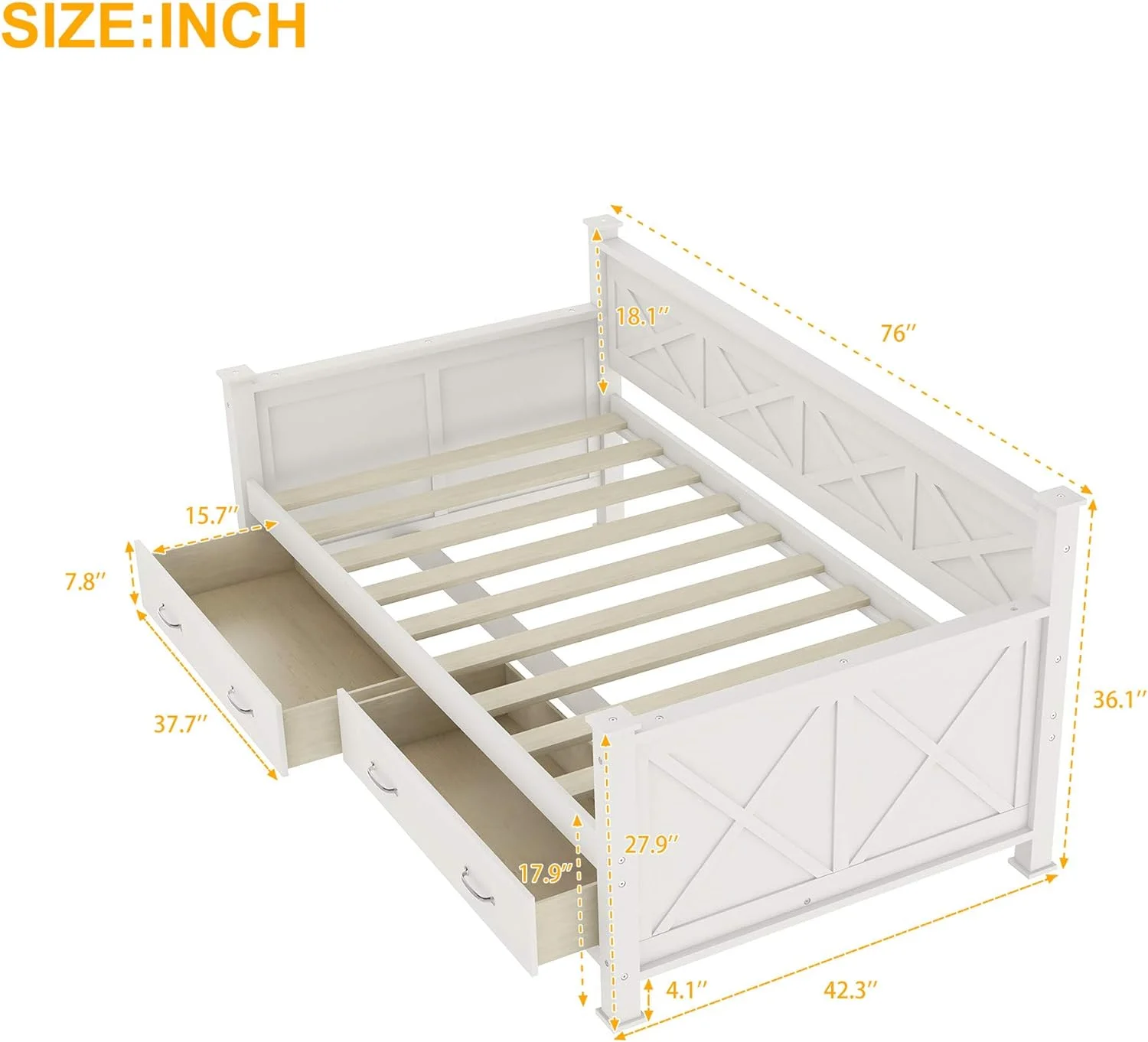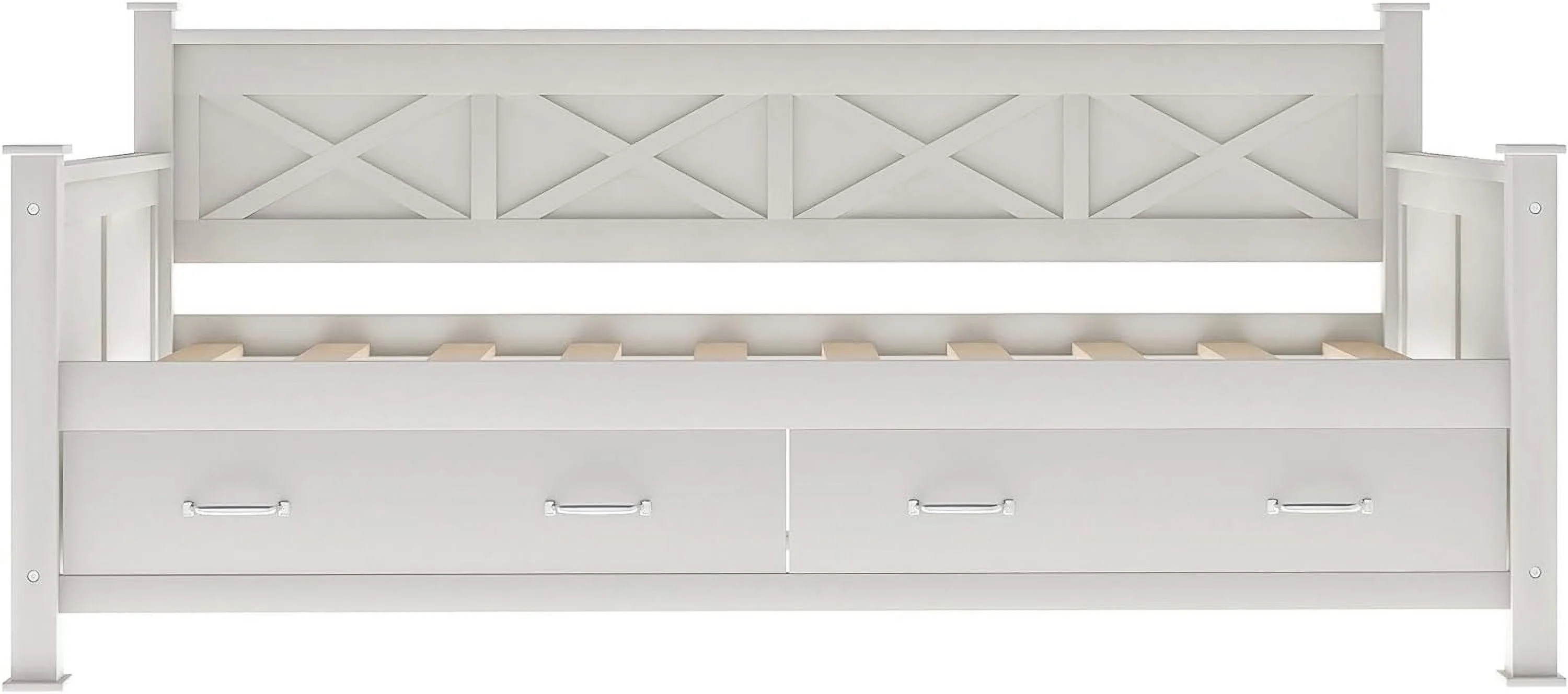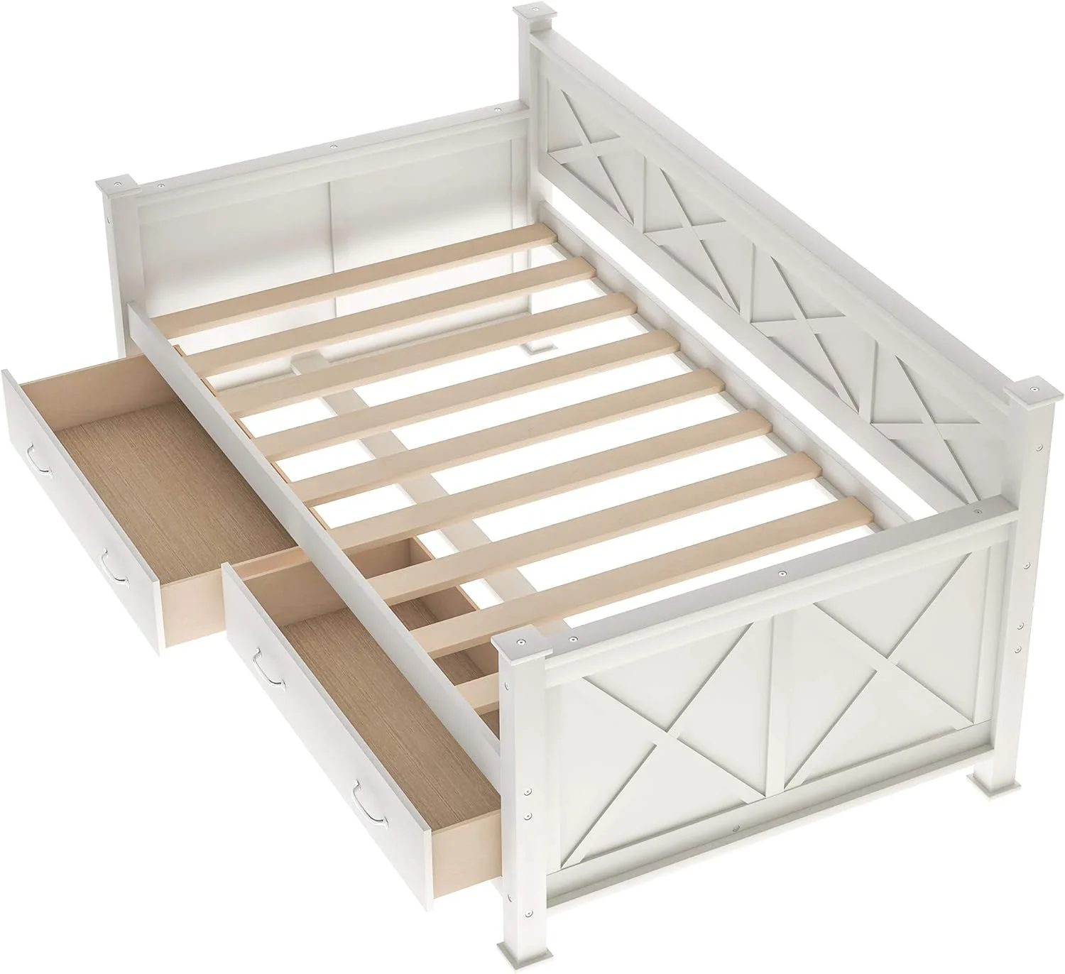 Size Daybed With Storage Drawers, Woode Daybed With X-Shaped Frame, Moder Ad Rustic Casual Daybed (White)