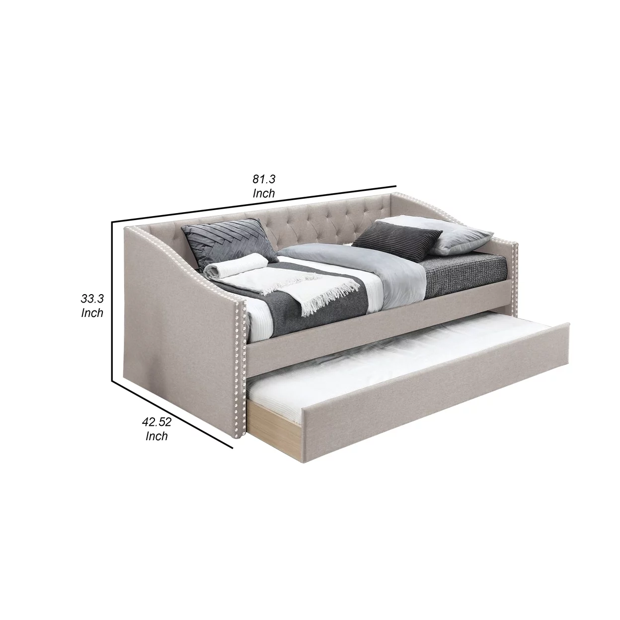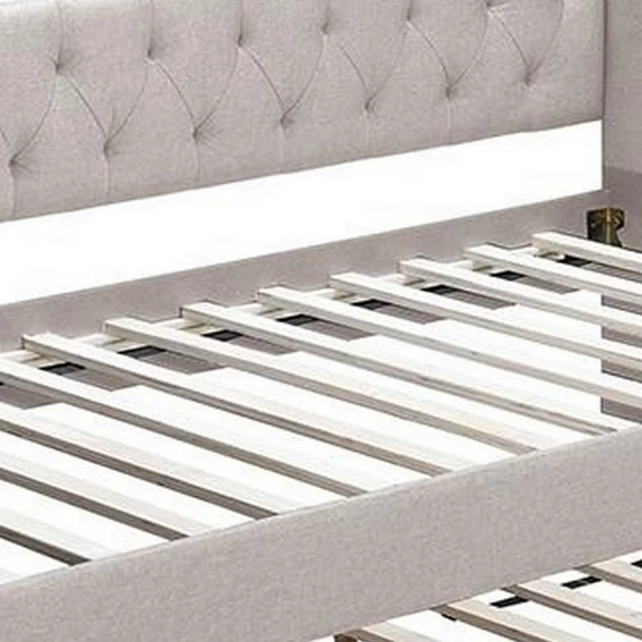 Straight Tufted Back Anne Modern Wood Day Bed with Trundle, Taupe Burlap