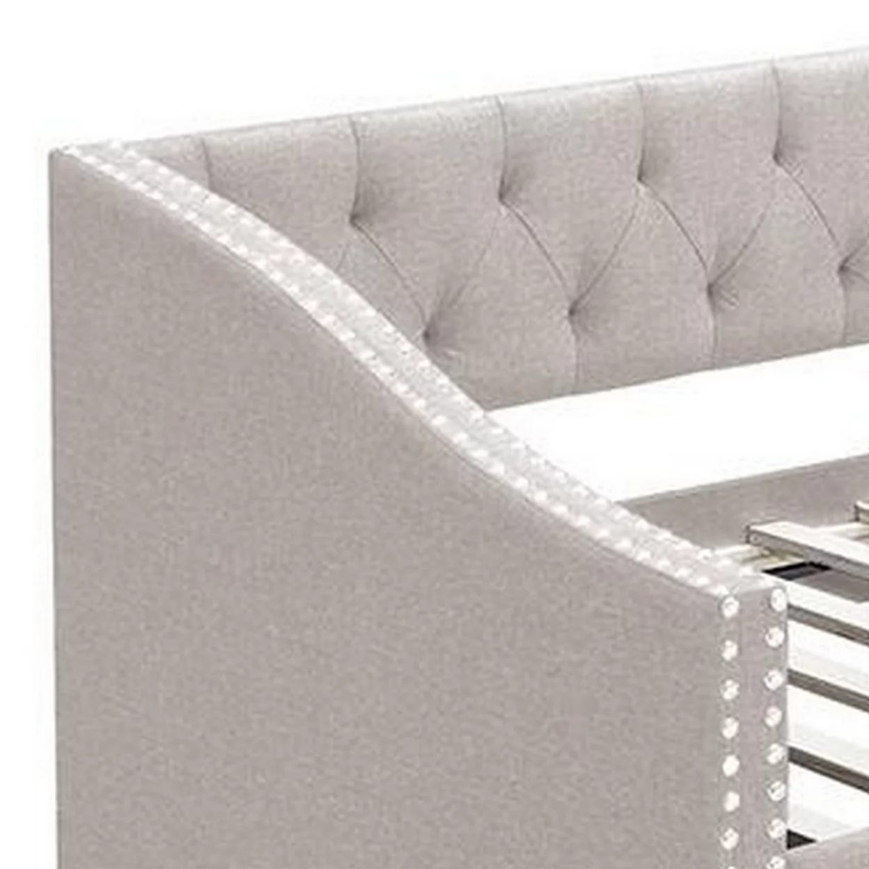 Ann Modern Wood Day Bed with Trundle, Straight Tufted Back, Taupe Burlap- Saltoro Sherpi