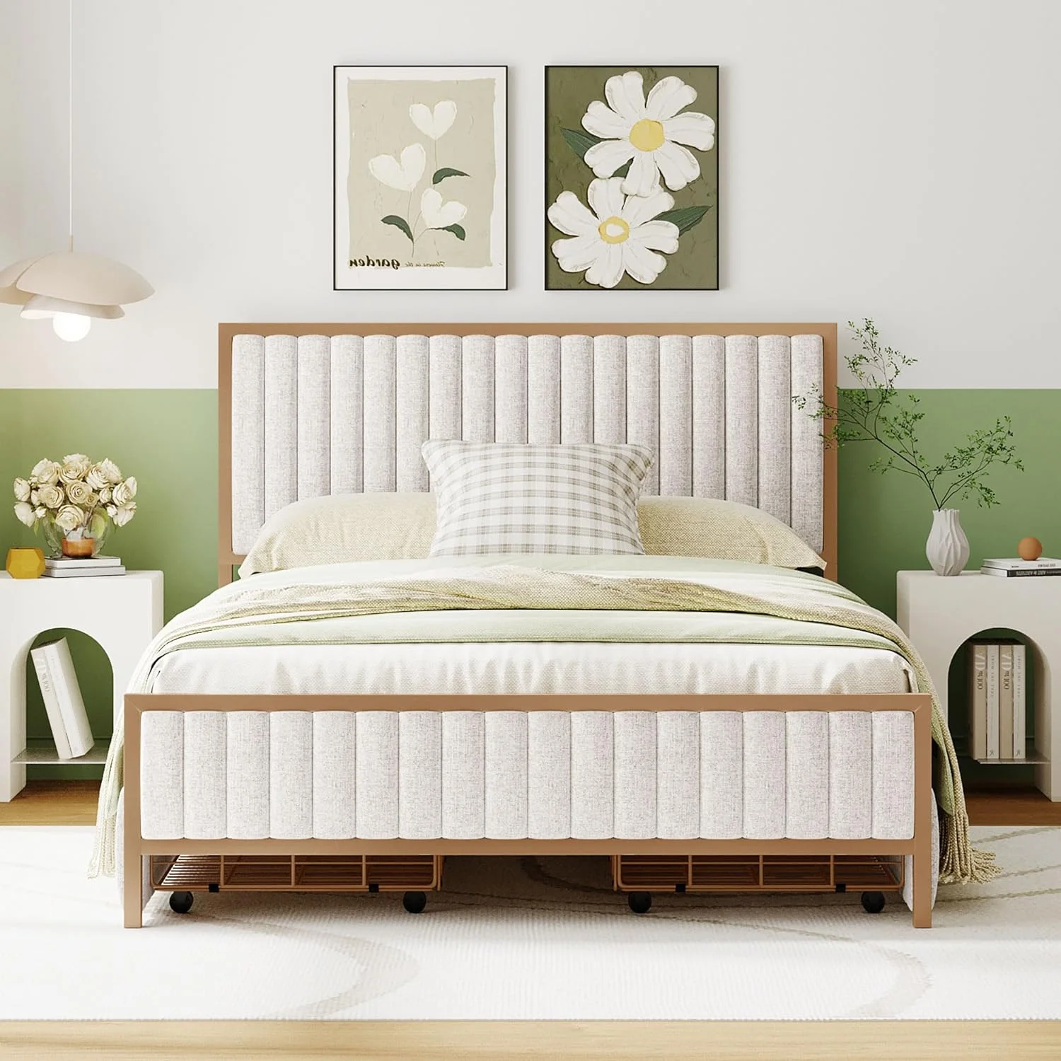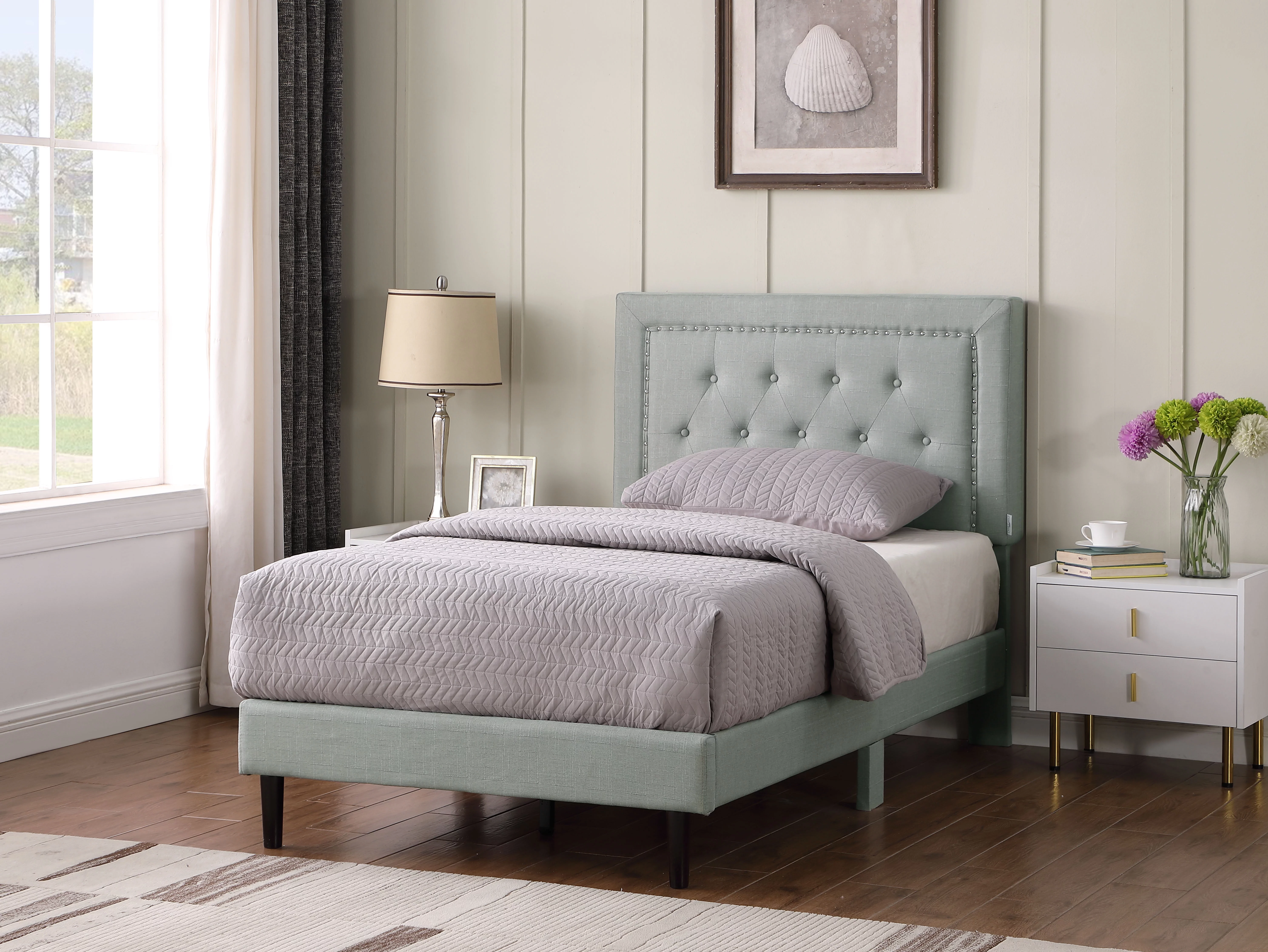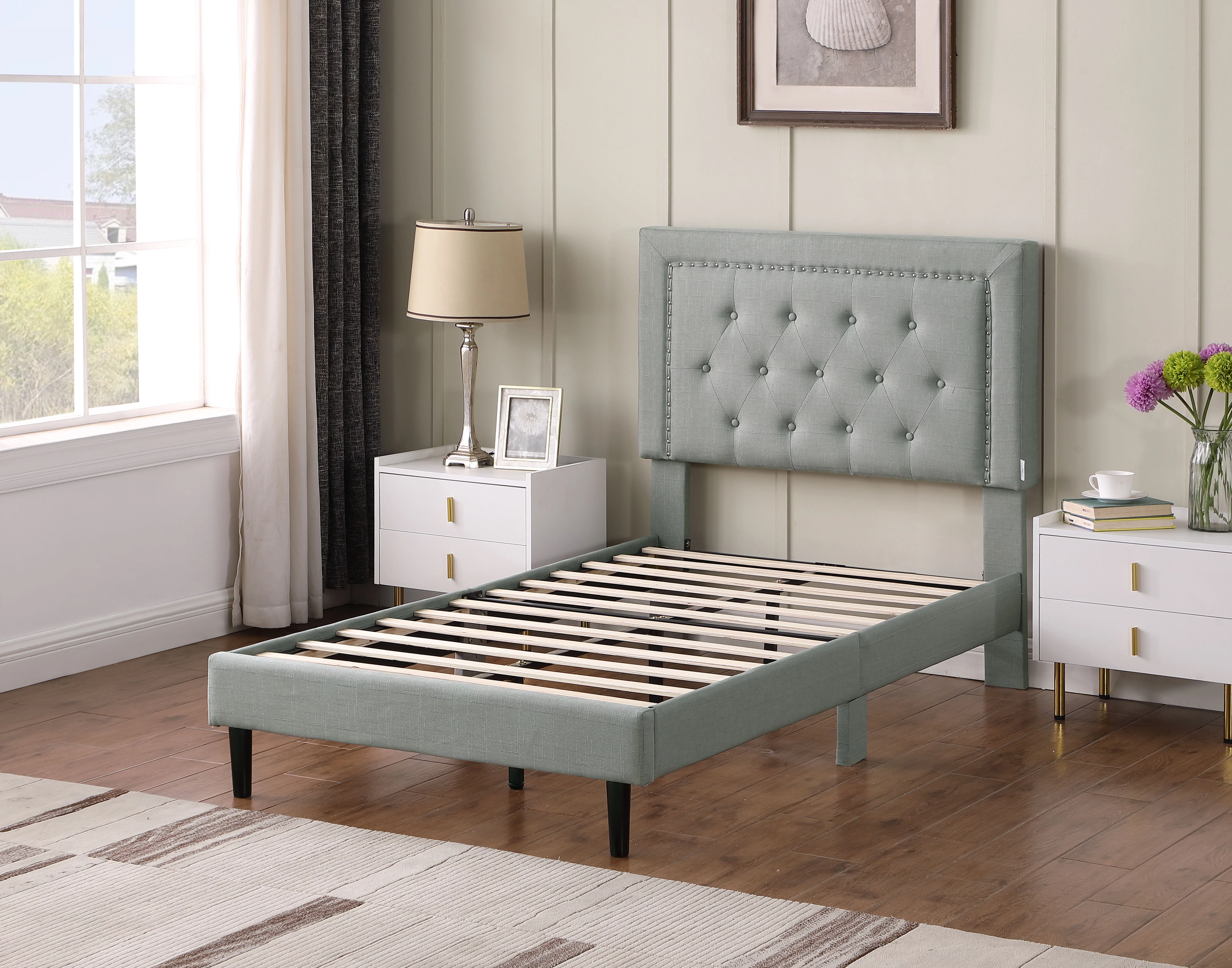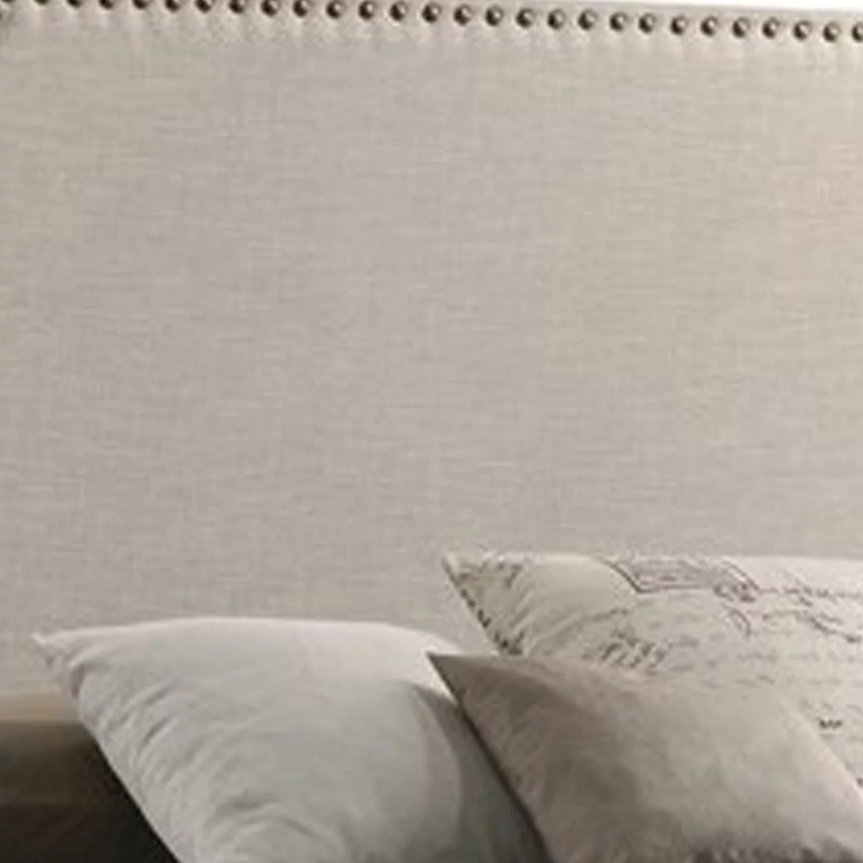 Modern Linen Curved Upholstered Platform Bed , Solid Wood Frame , Nailhead Trim, Cream (Queen)