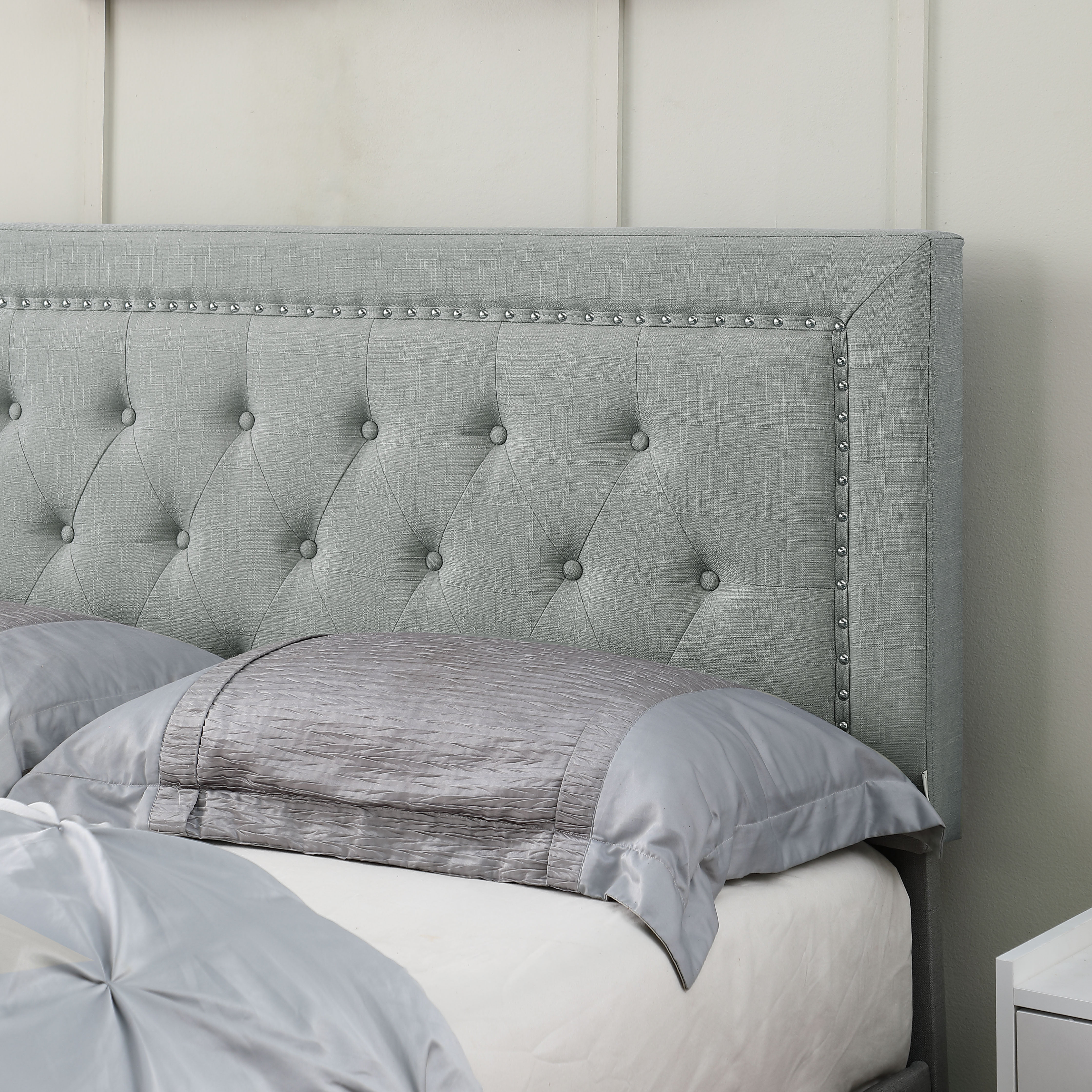 Fabric Upholstered Wooden Queen Size Bed with Nailhead Trims Beige- Saltoro Sherpi
