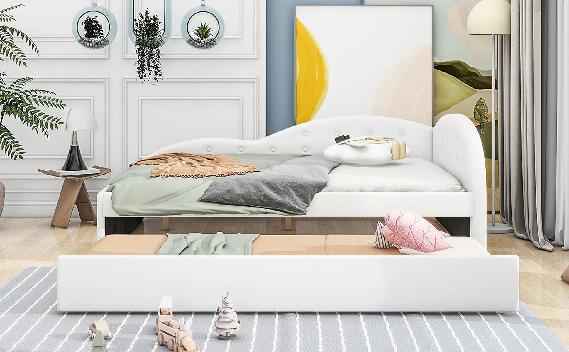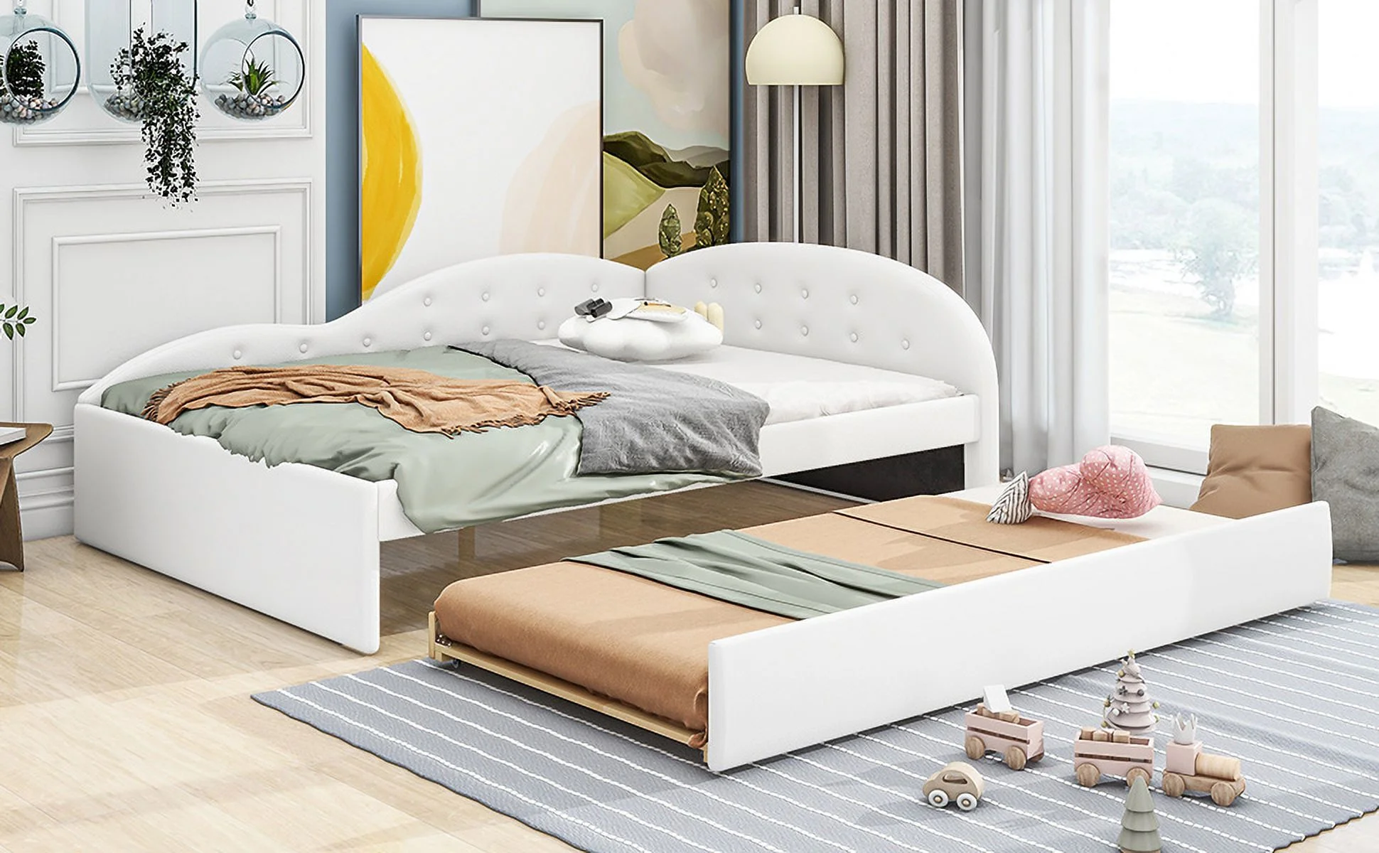 CoSoTower Full Size PU Upholstered Tufted Daybed with Trundle and Cloud Shaped Guardrail, White