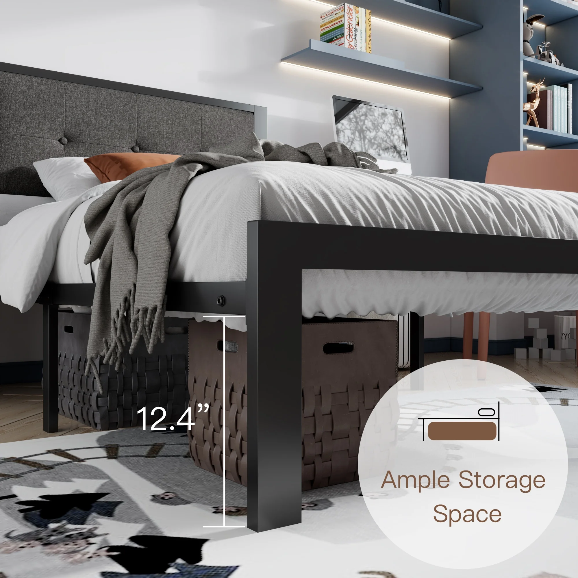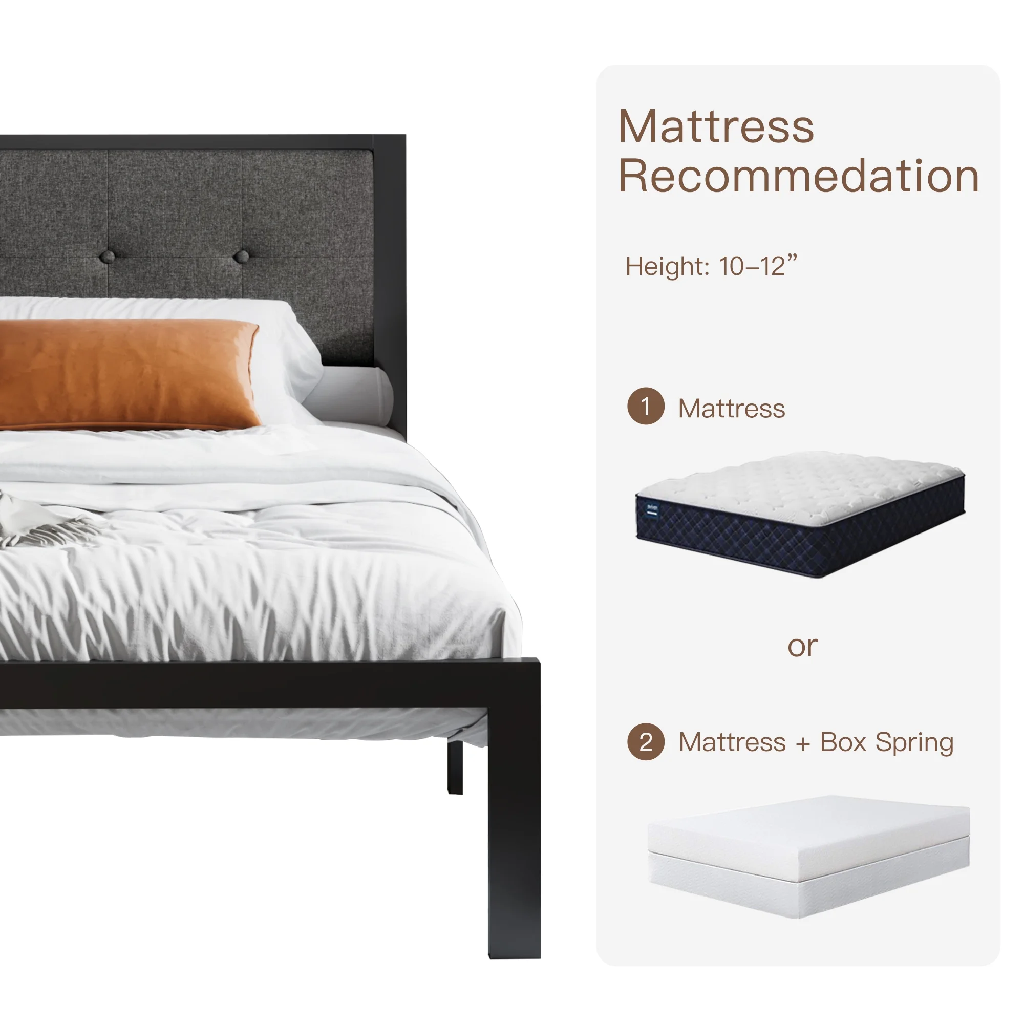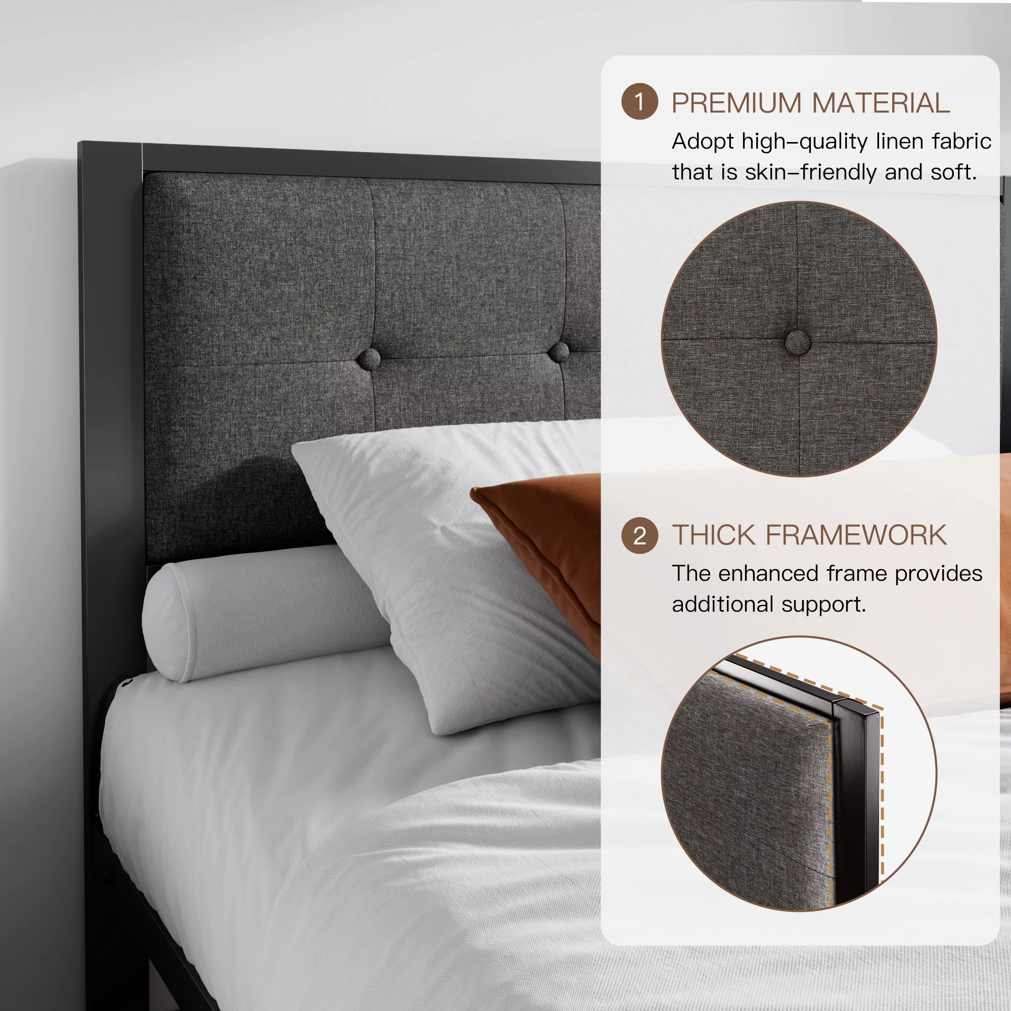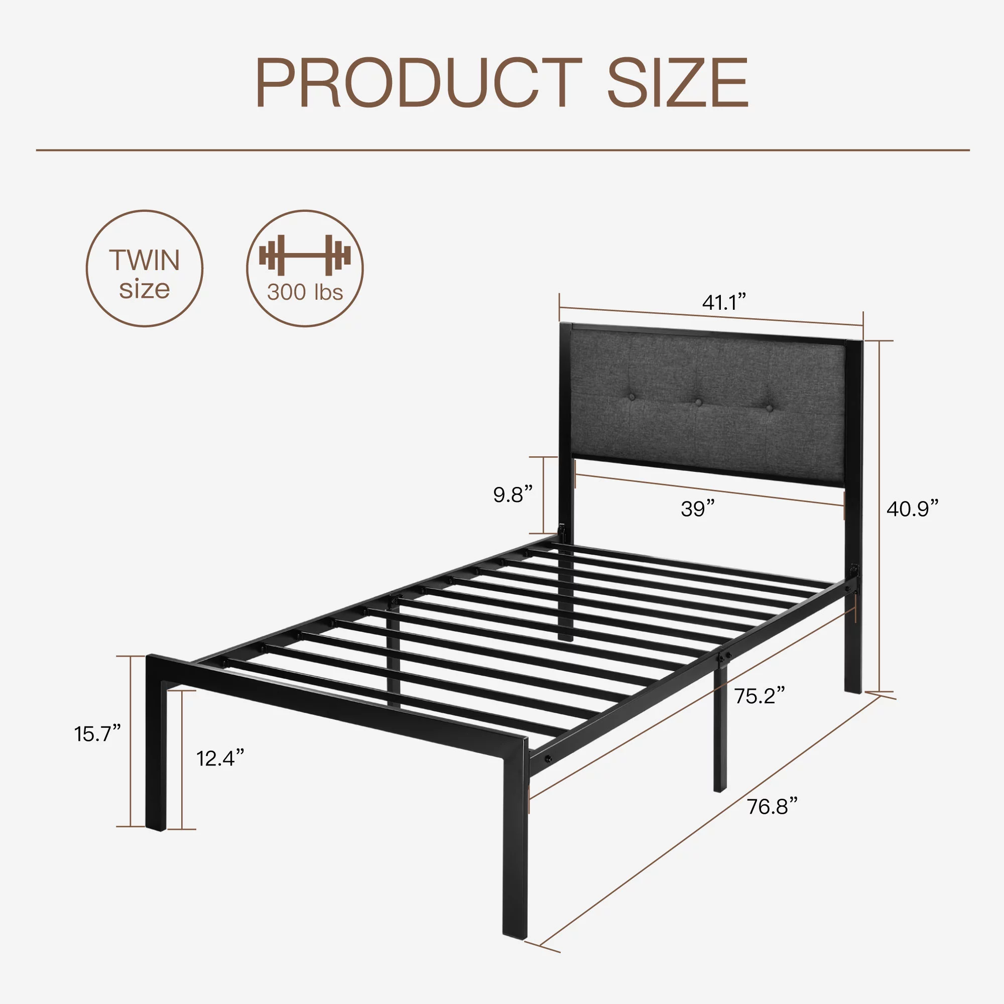 Einfach Twin Platform Bed with Fabric Button Tufted Square Stitched Headboard, Grey