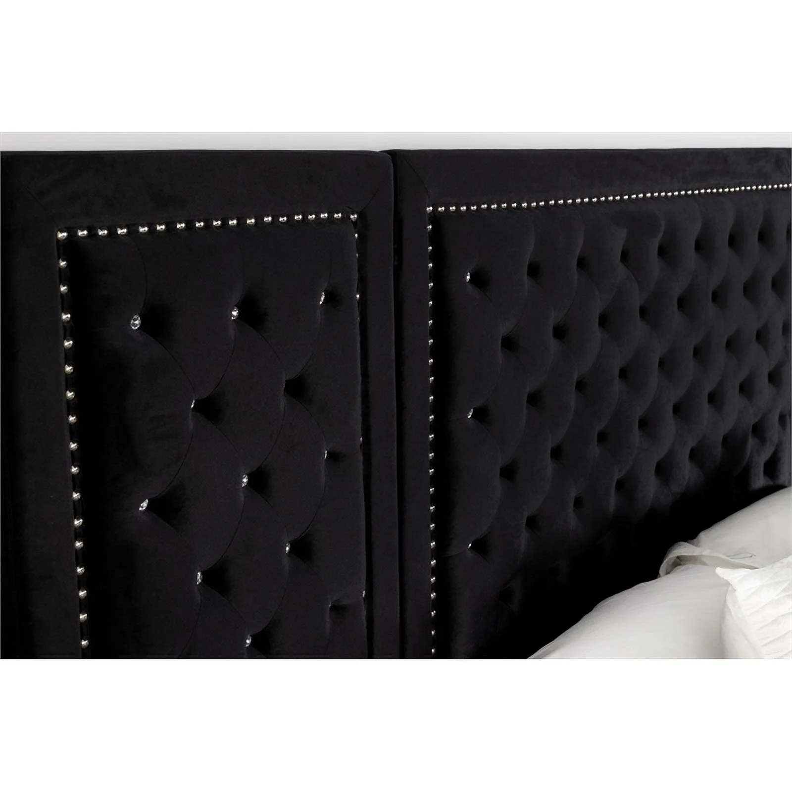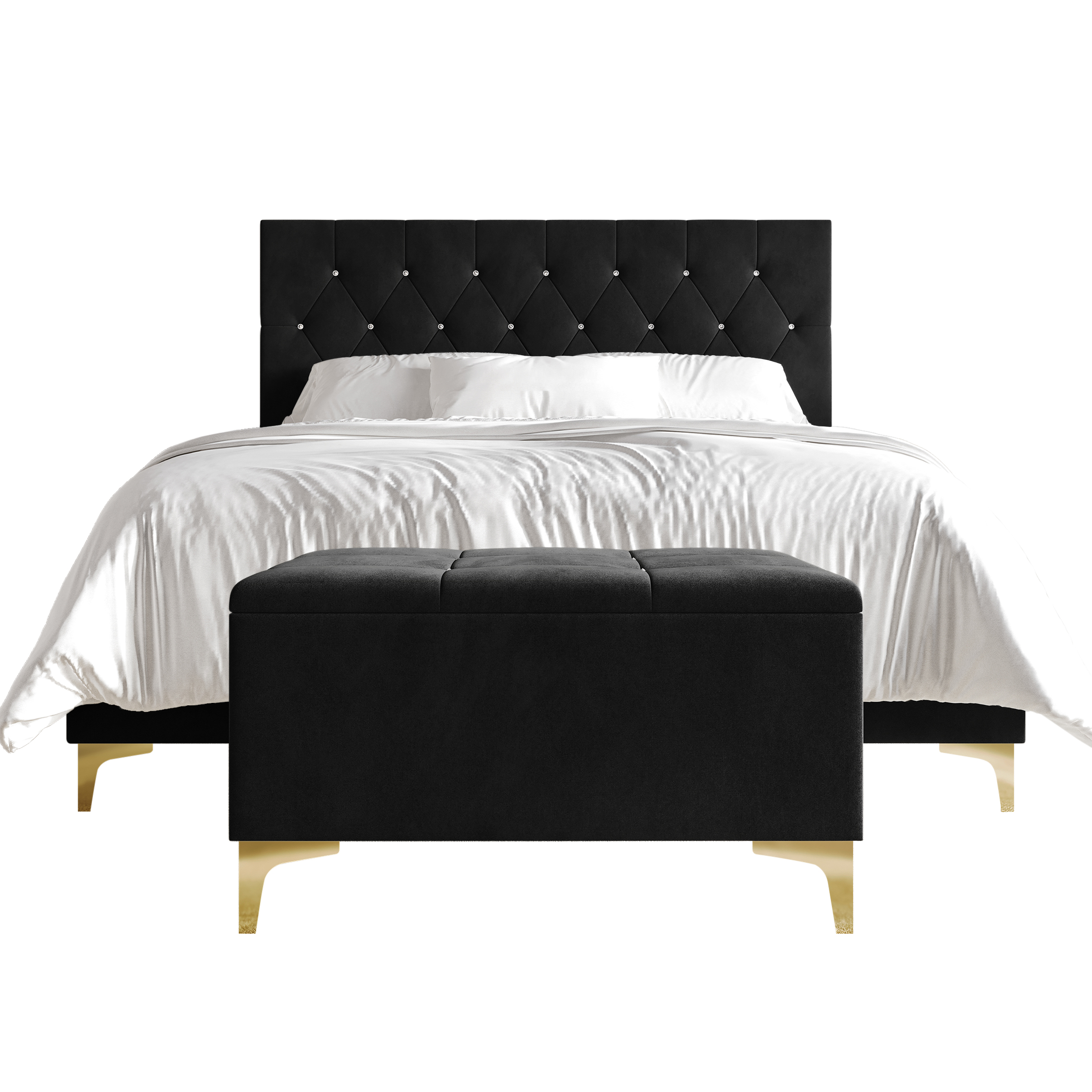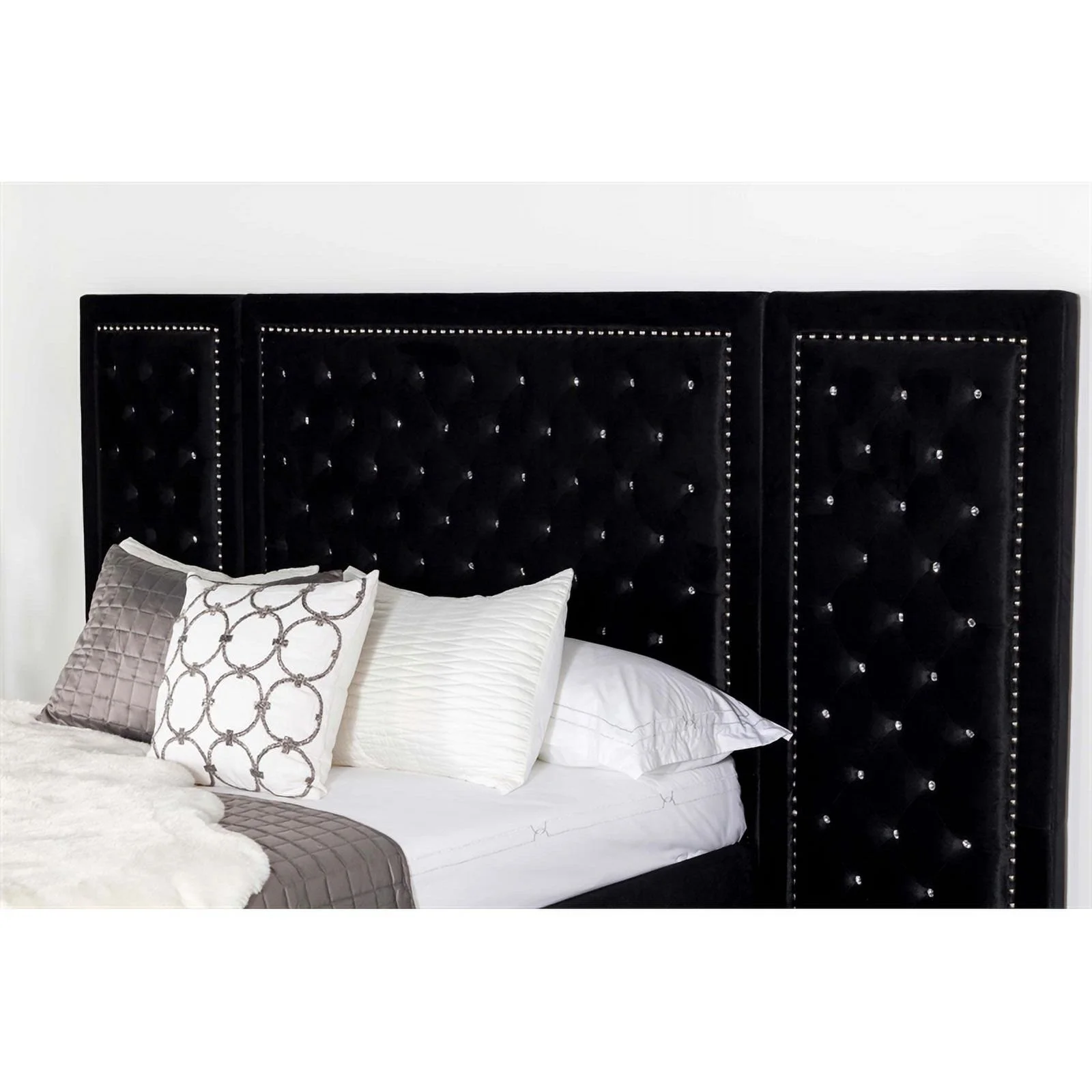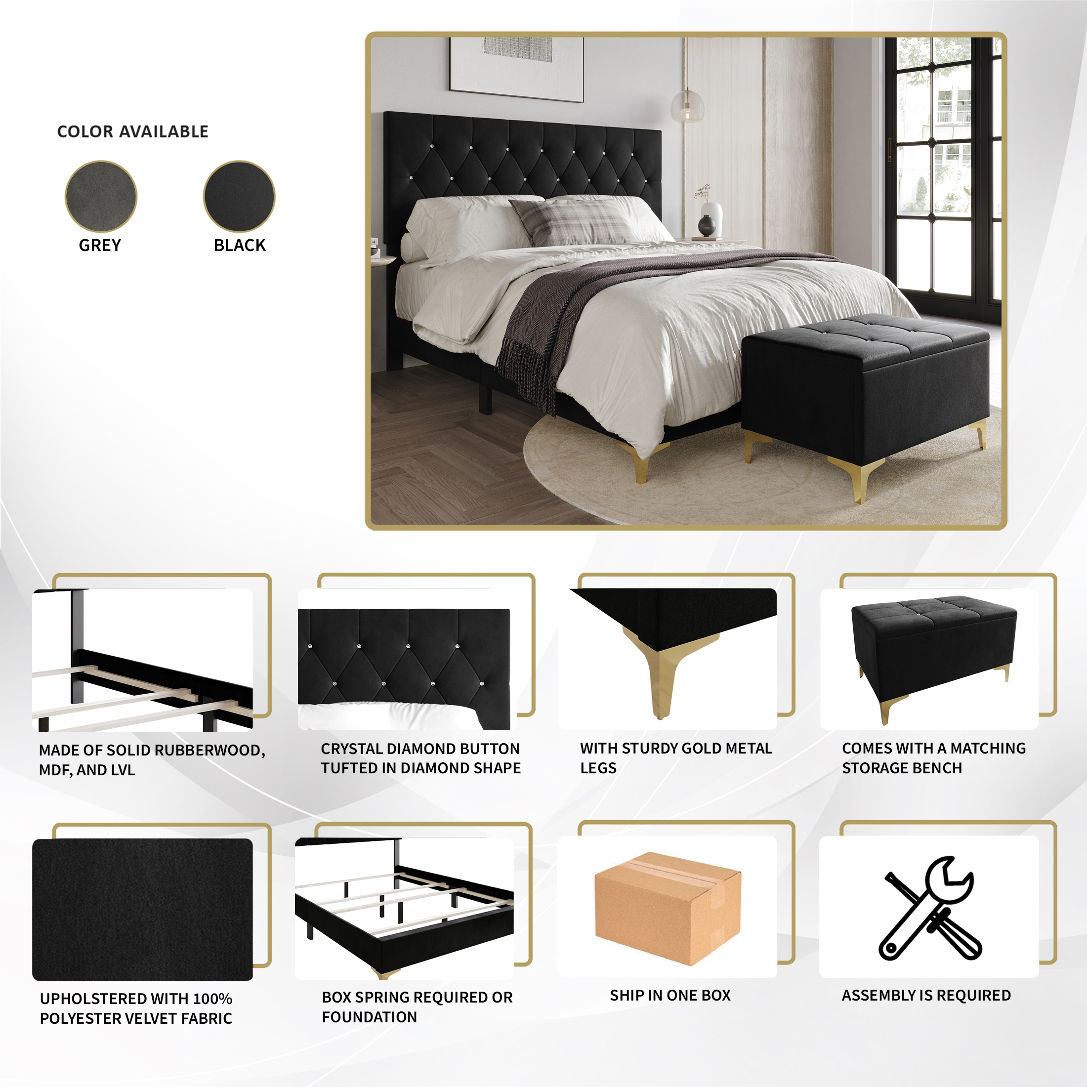 Castle Place Contemporary Crystal Queen Size Velvet Upholstered Bed with Storage Bench, Black