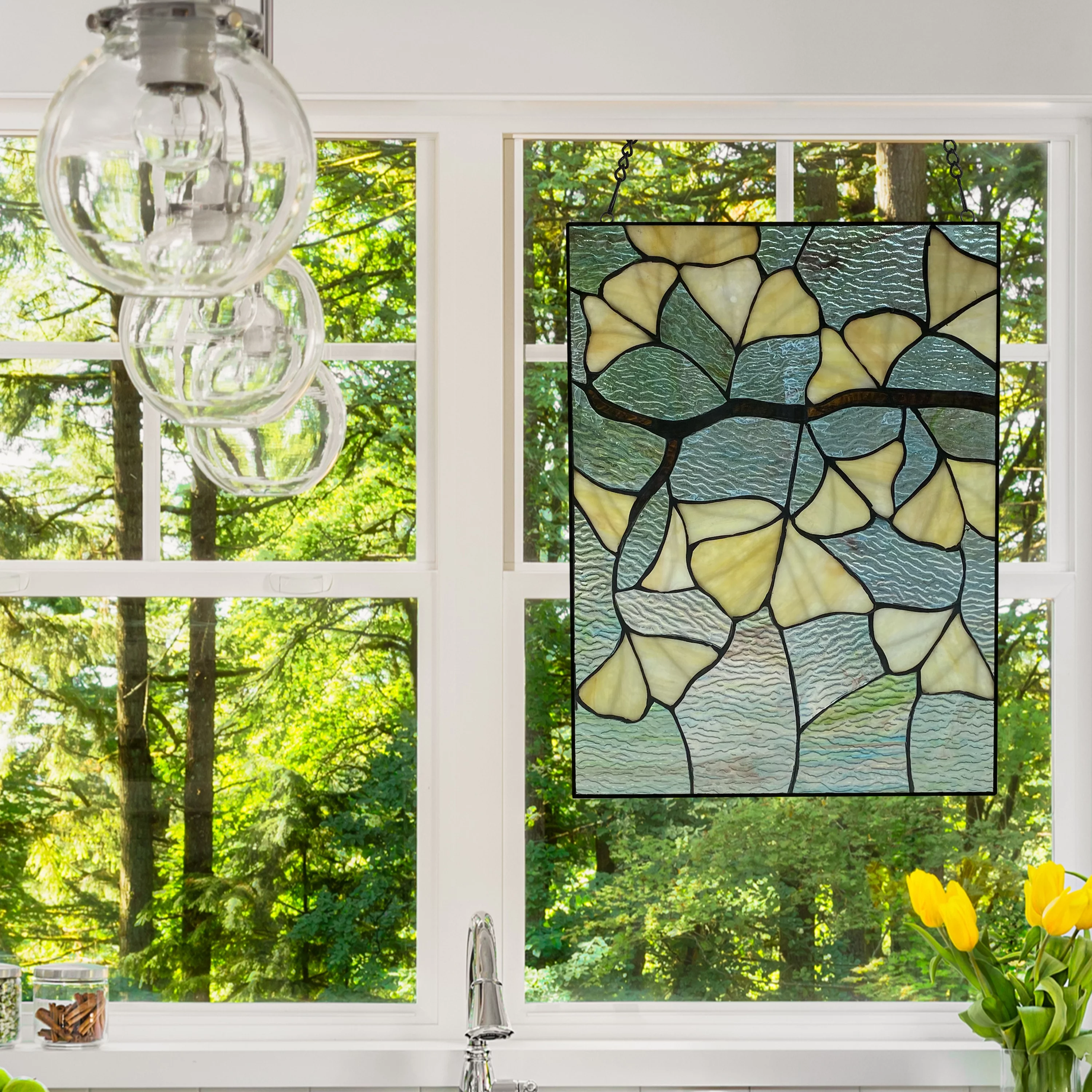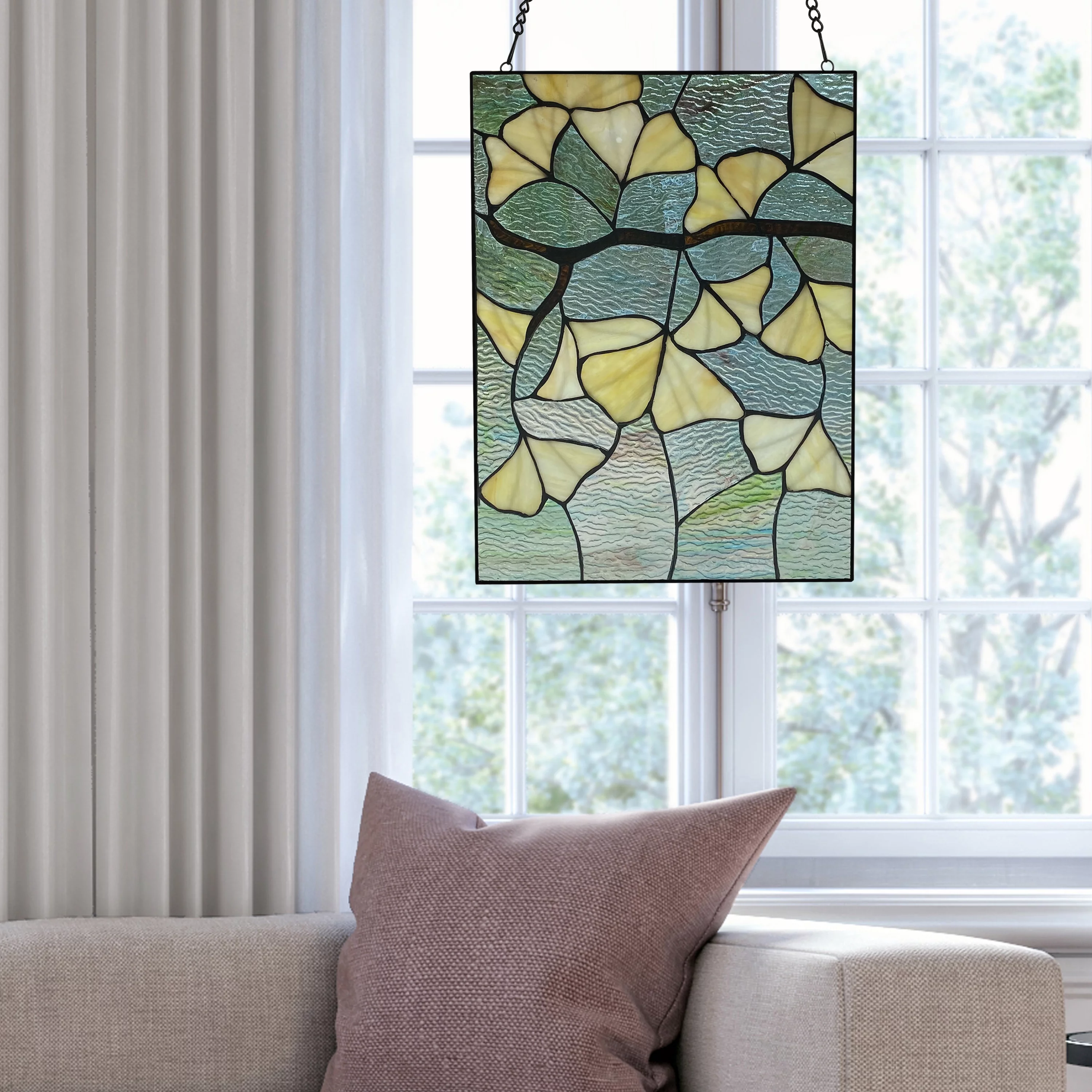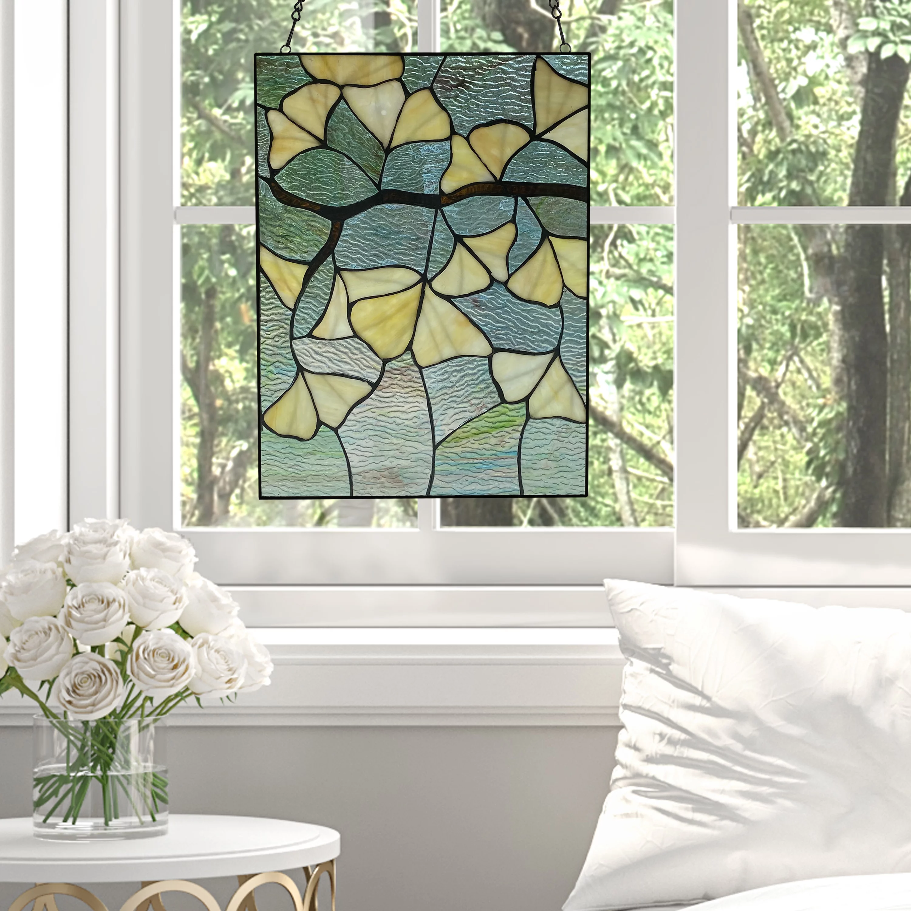 River of Goods 17.5 in. Ginkgo Leaf Stained Glass Window Panel in Ivory
